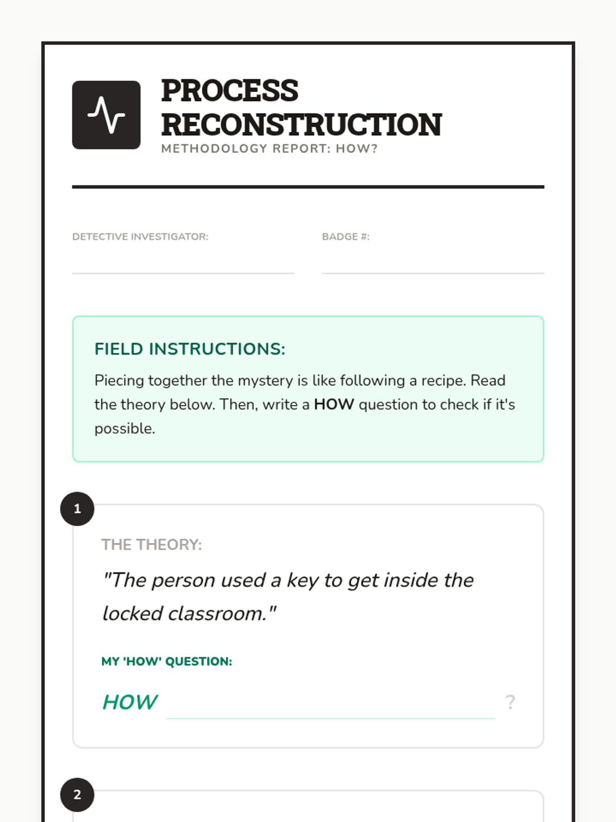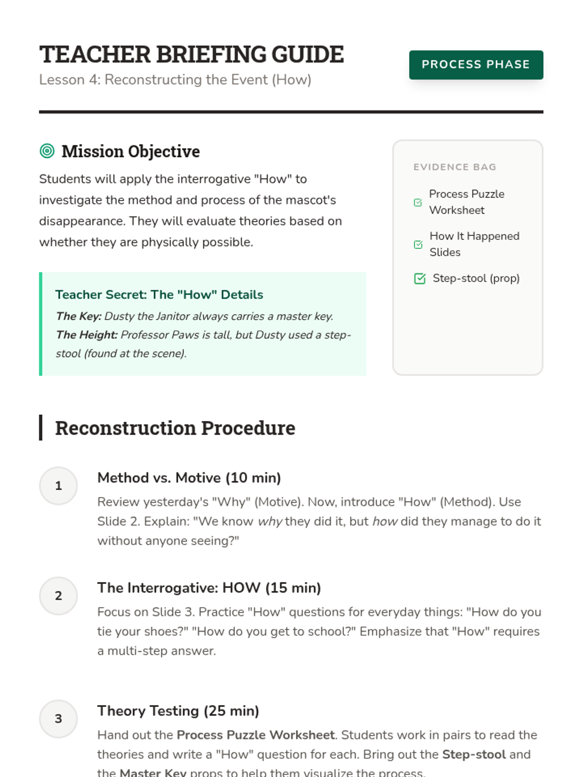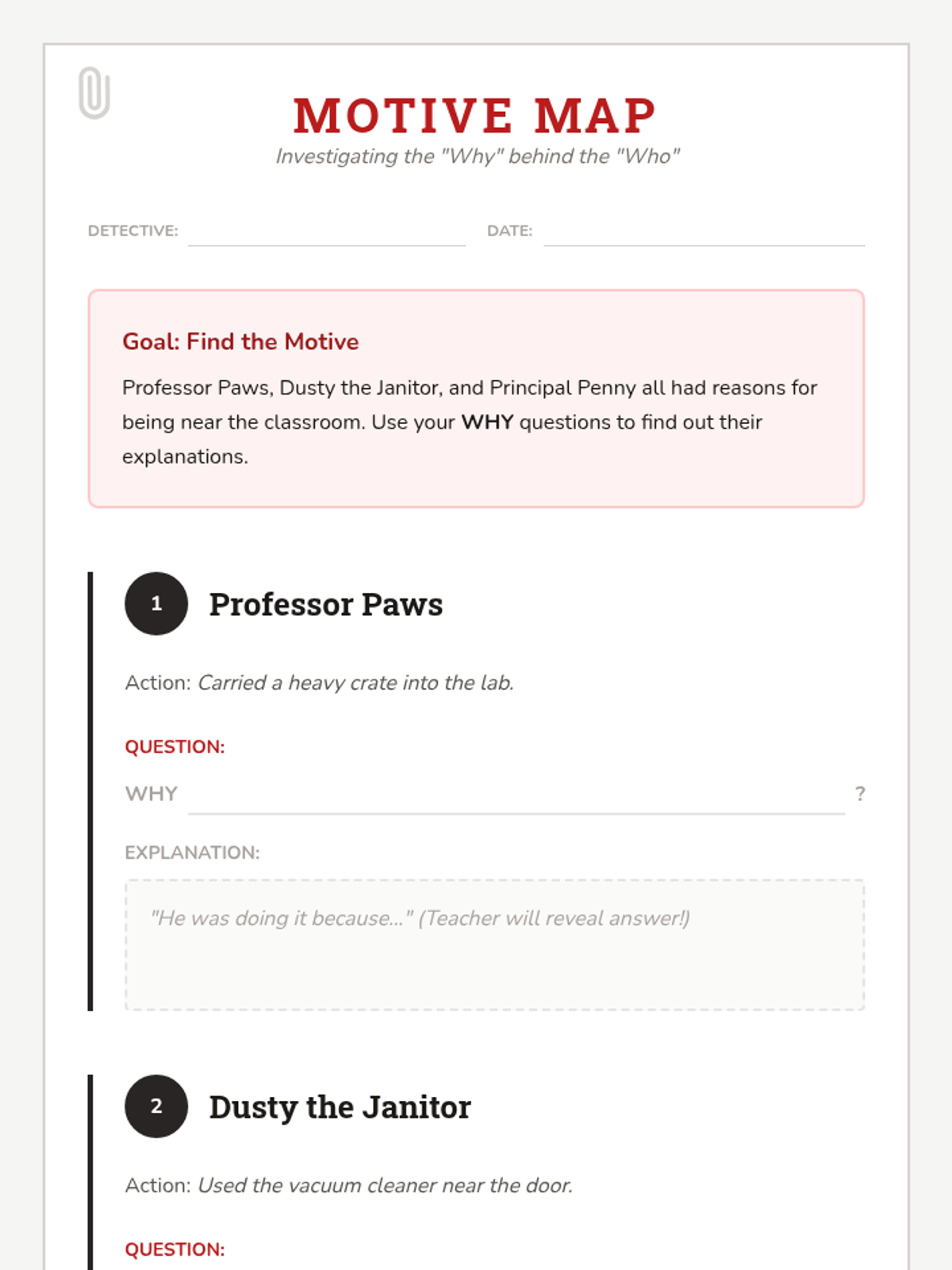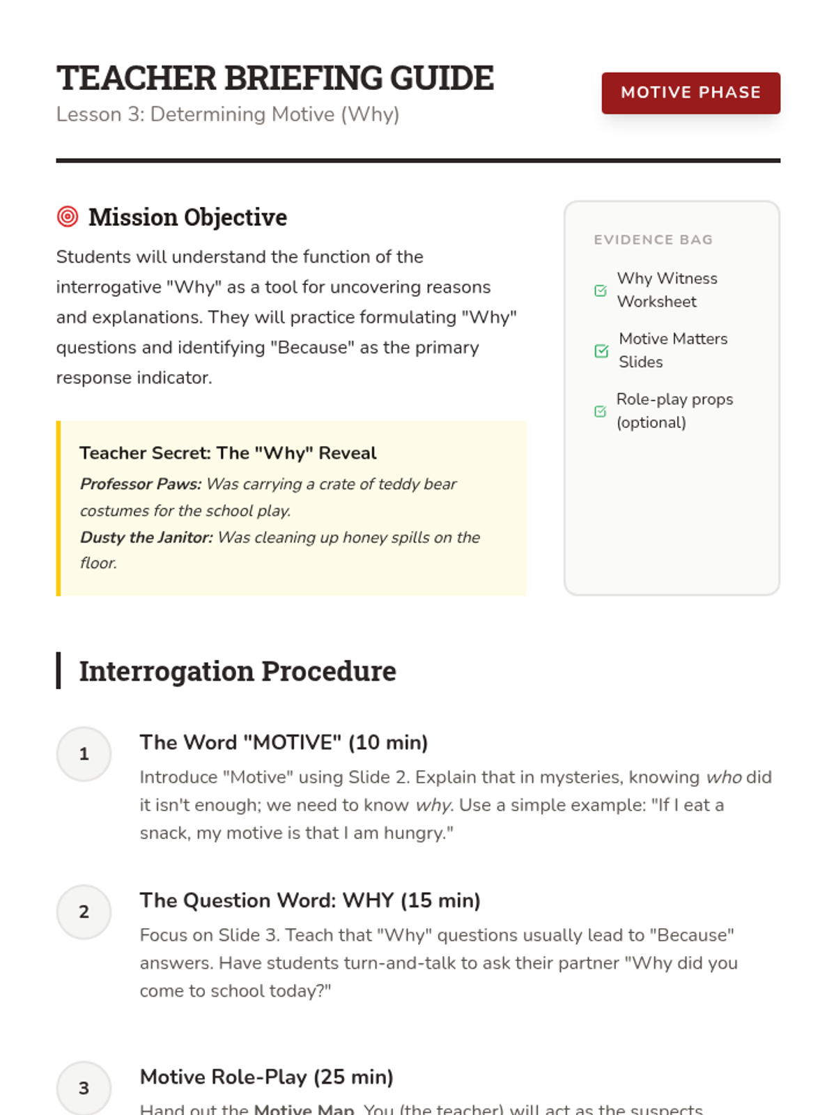 A mystery-themed ELA sequence for 2nd graders that teaches the use of interrogatives (Who, What, Where, When, Why, How) through a simulated investigation of a missing classroom mascot. Students act as detectives, using specific question words to gather evidence, identify suspects, and solve the case.