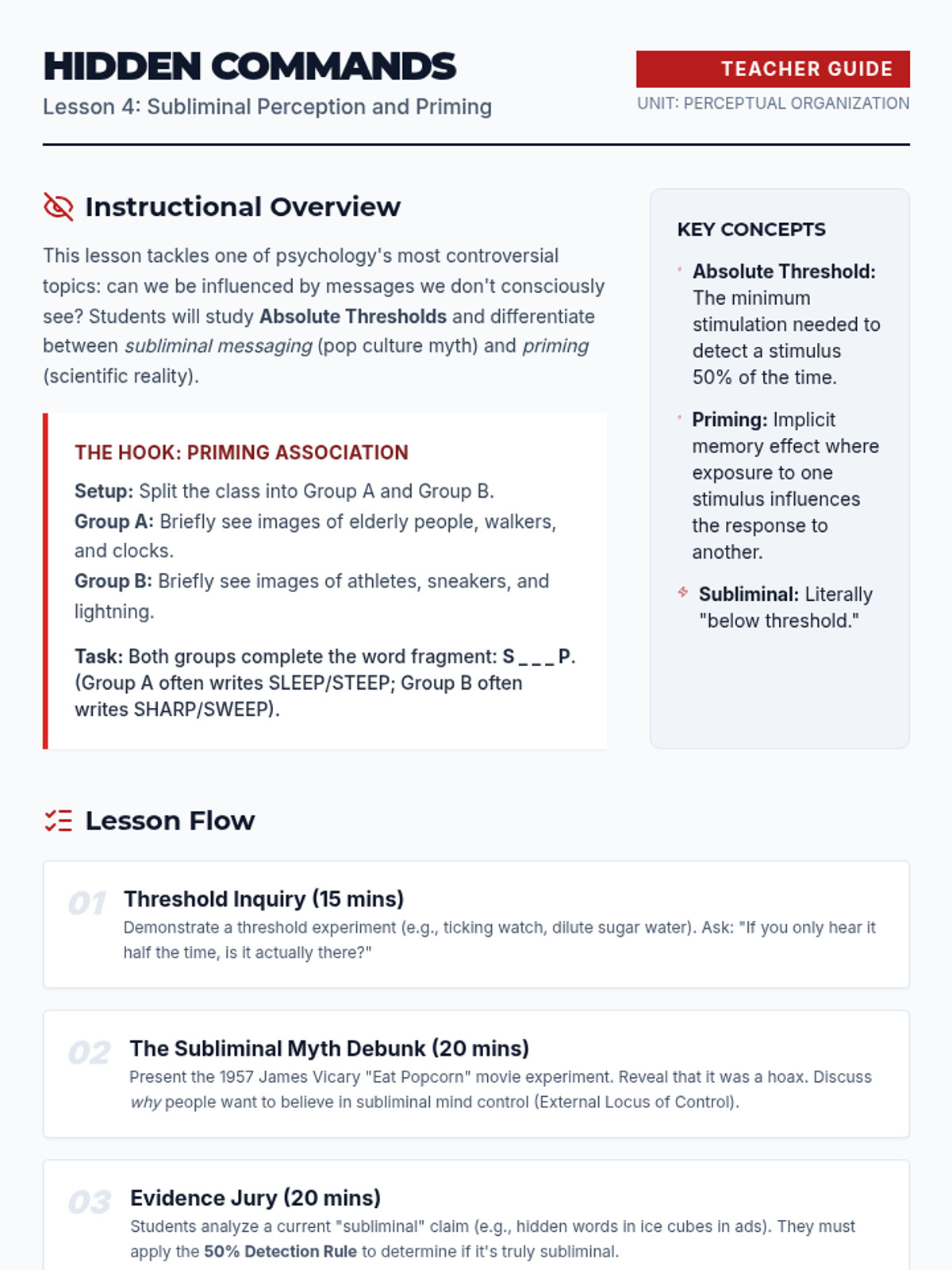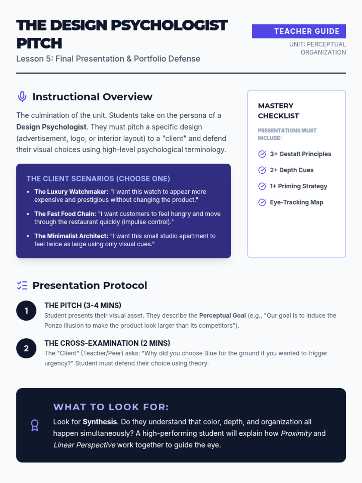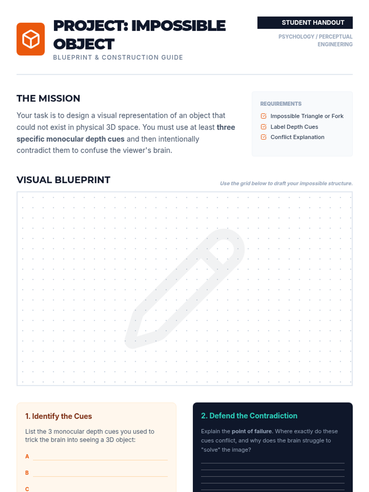 A project-based sequence for 12th-grade psychology students exploring how perceptual organization principles are applied in design, illusions, and marketing. Students transition from analyzing perceptual errors to intentionally creating them to understand the manipulation of human experience.