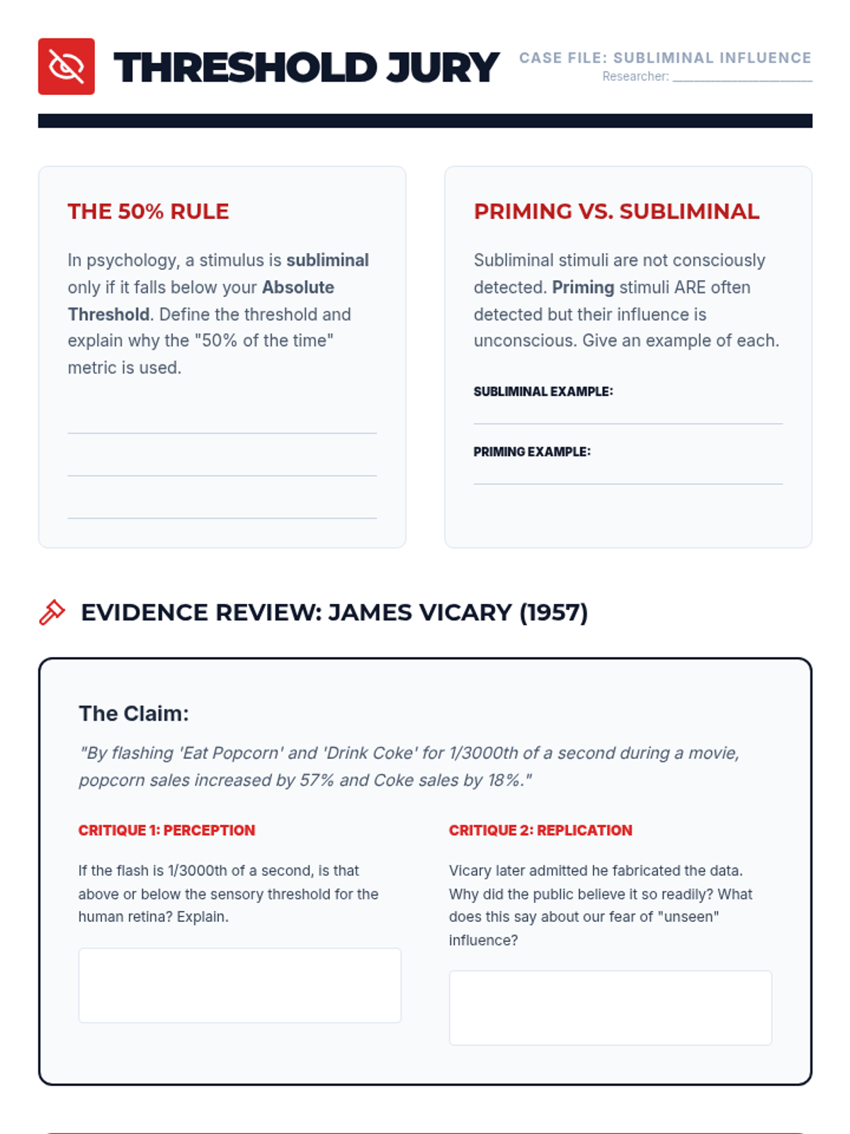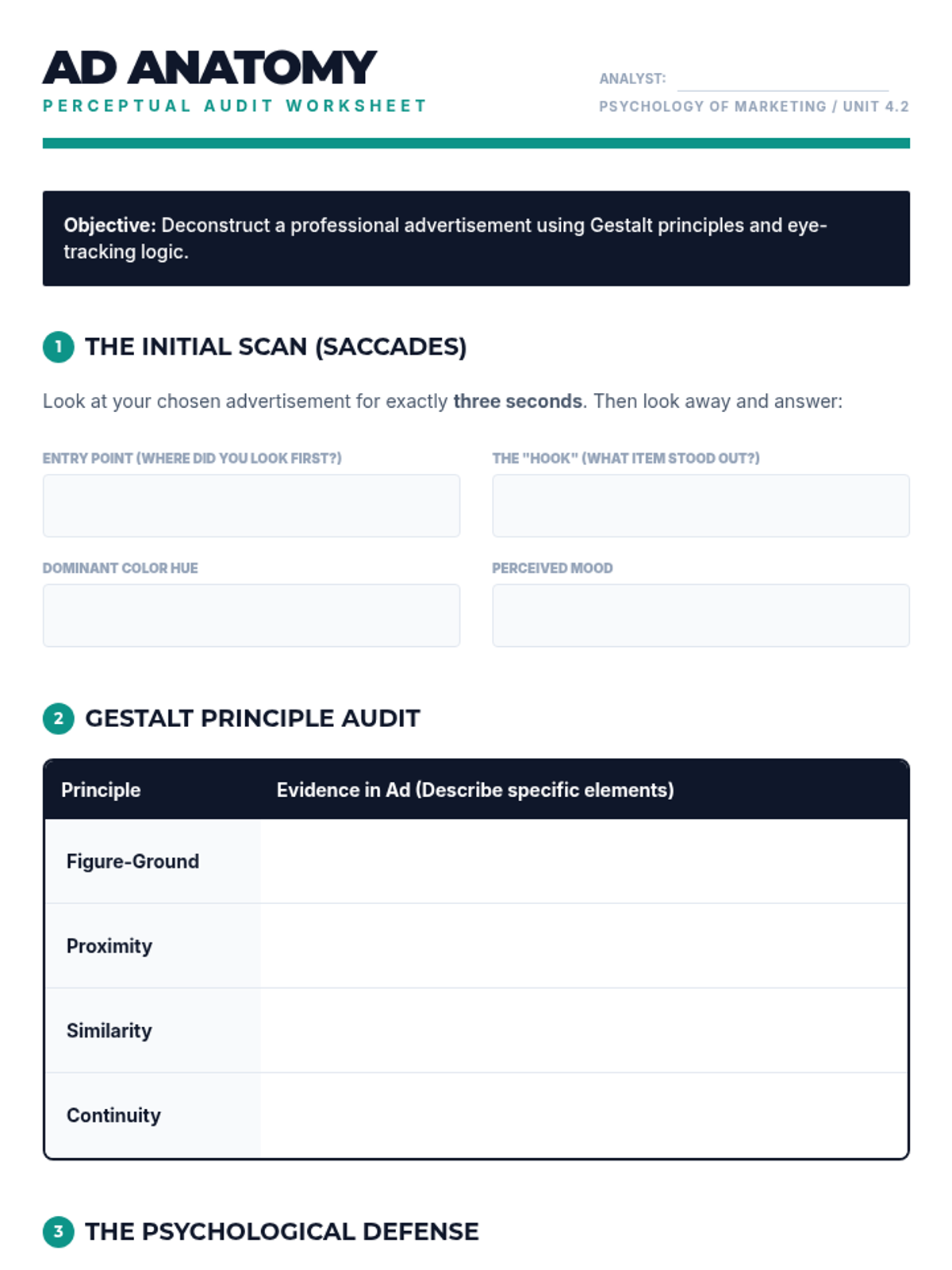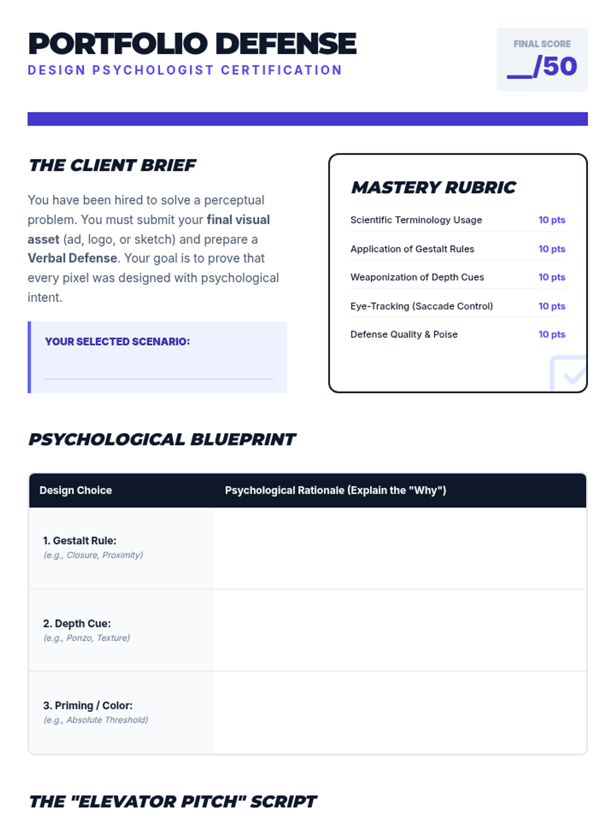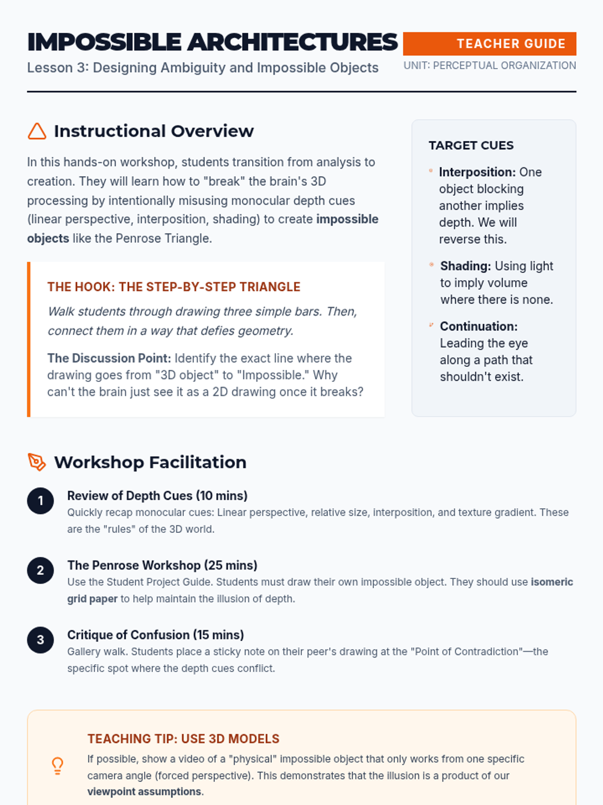 A project-based sequence for 12th-grade psychology students exploring how perceptual organization principles are applied in design, illusions, and marketing. Students transition from analyzing perceptual errors to intentionally creating them to understand the manipulation of human experience.