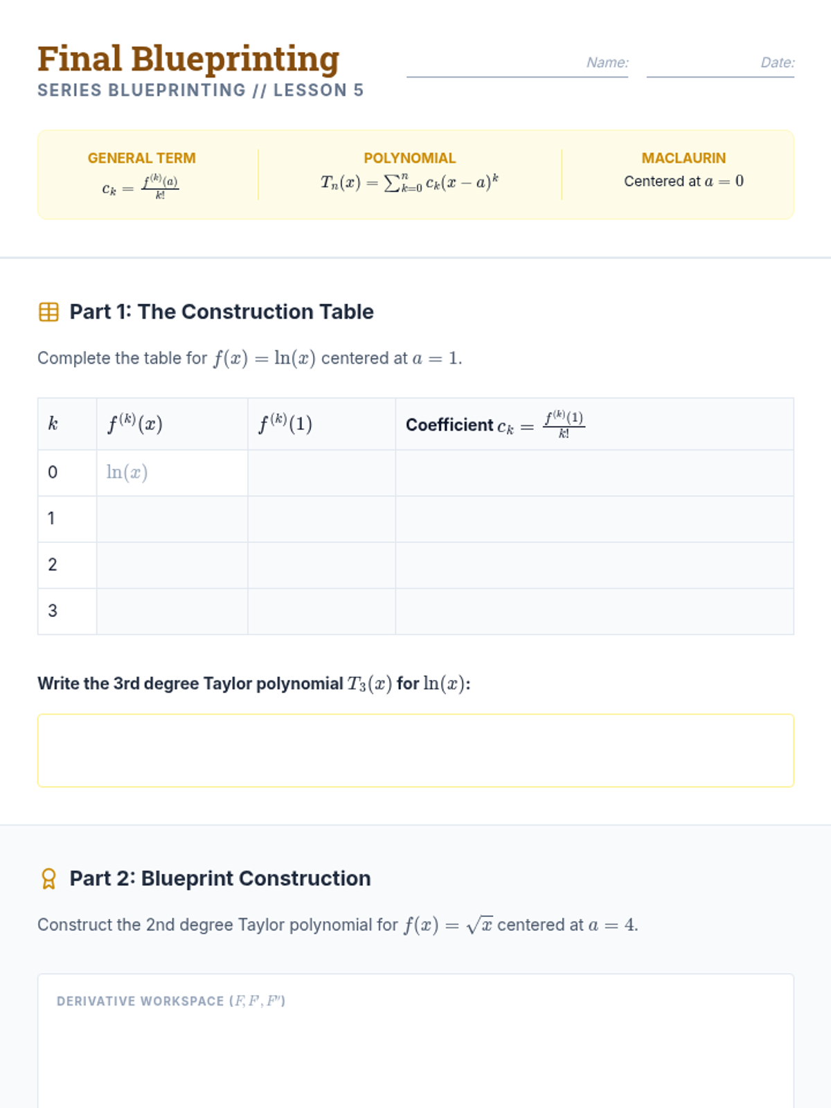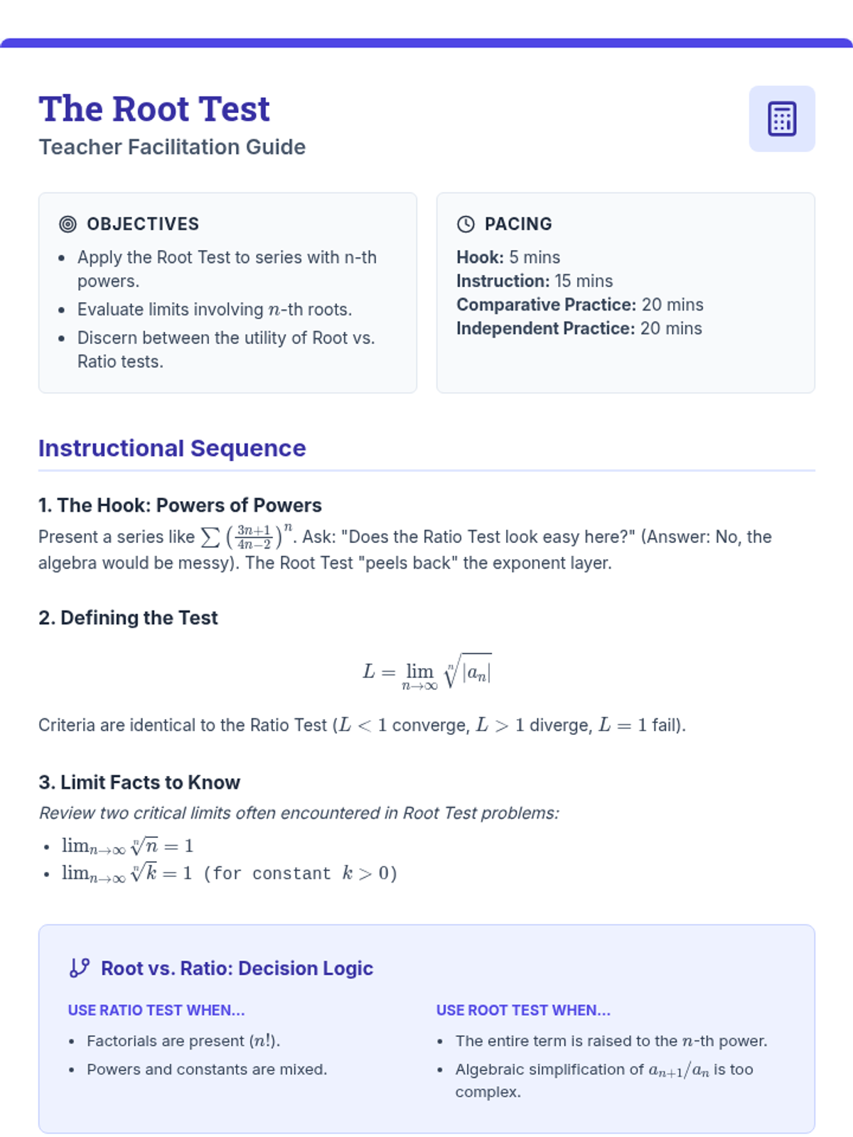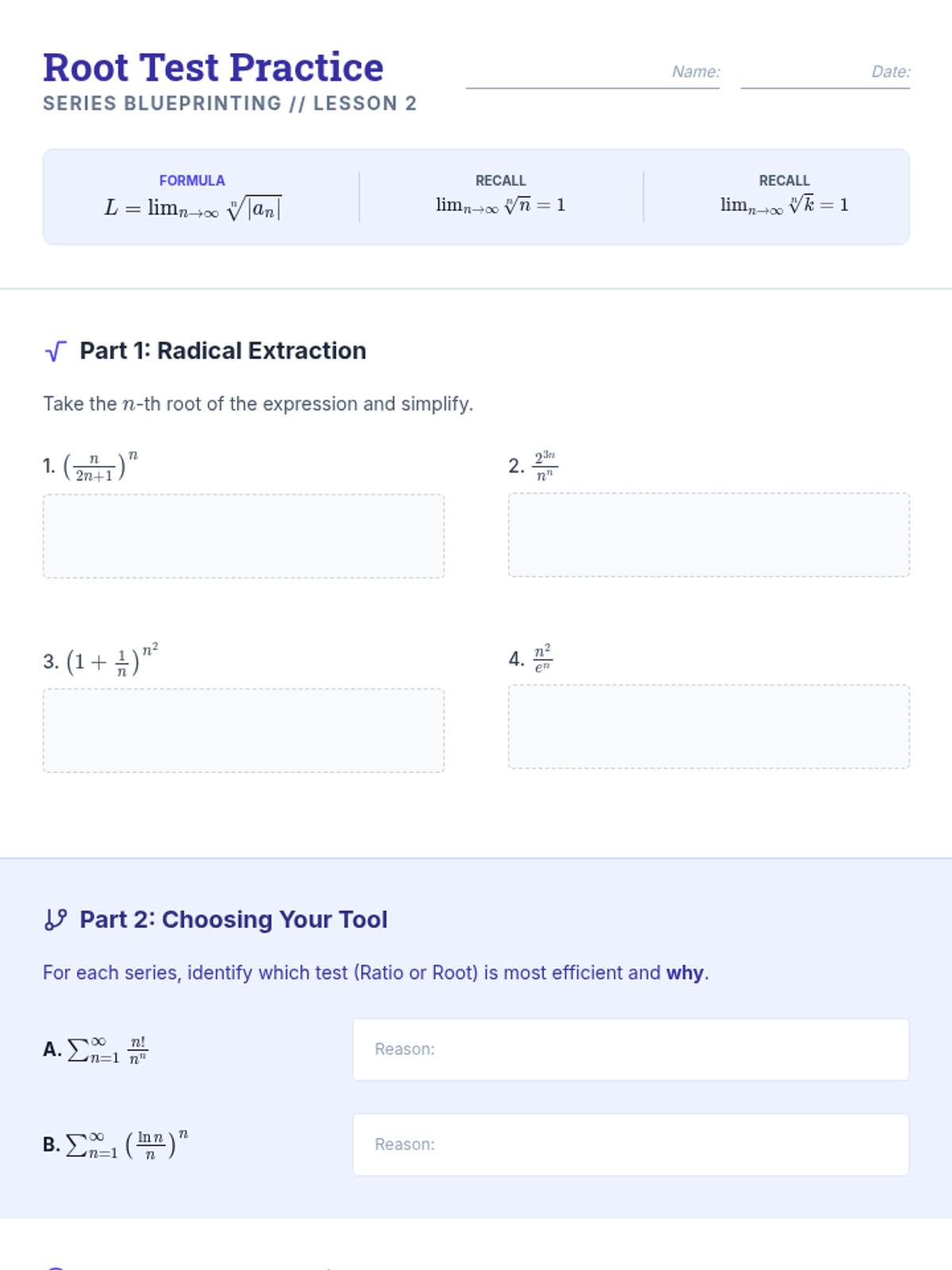 This advanced sequence introduces powerful tools for analyzing series with factorials and powers, leading to the concept of power series. Students master the Ratio and Root tests, explore absolute versus conditional convergence, and conclude by connecting series to functions through Taylor polynomials.