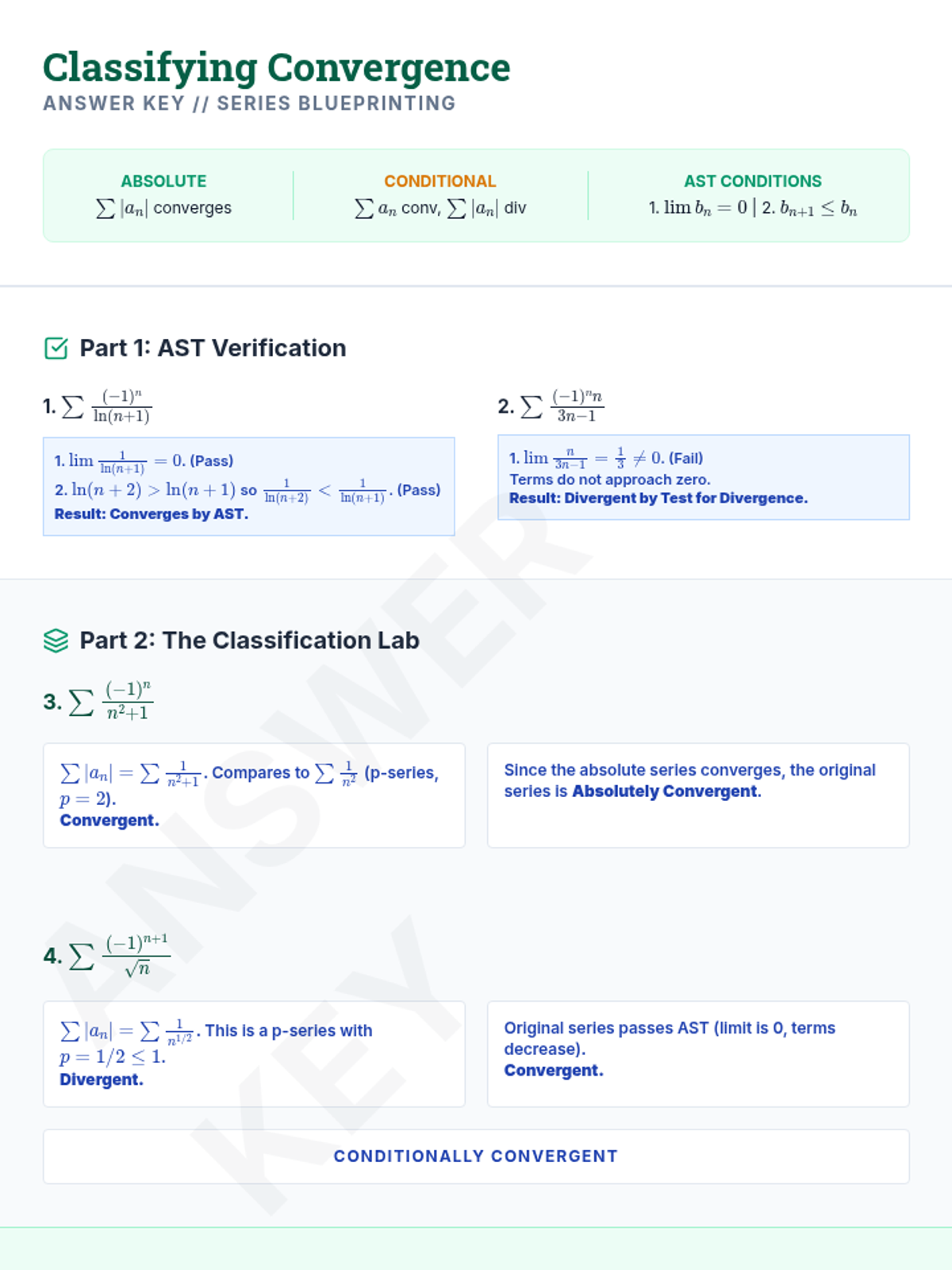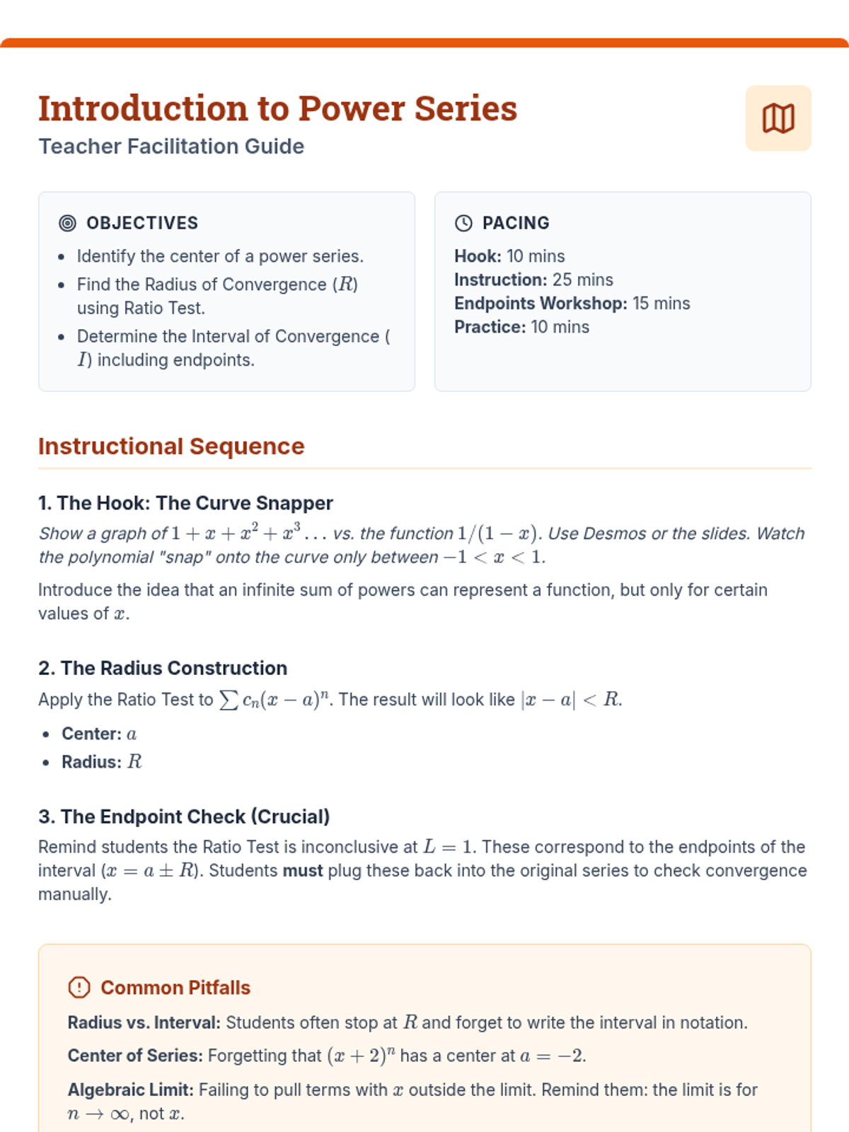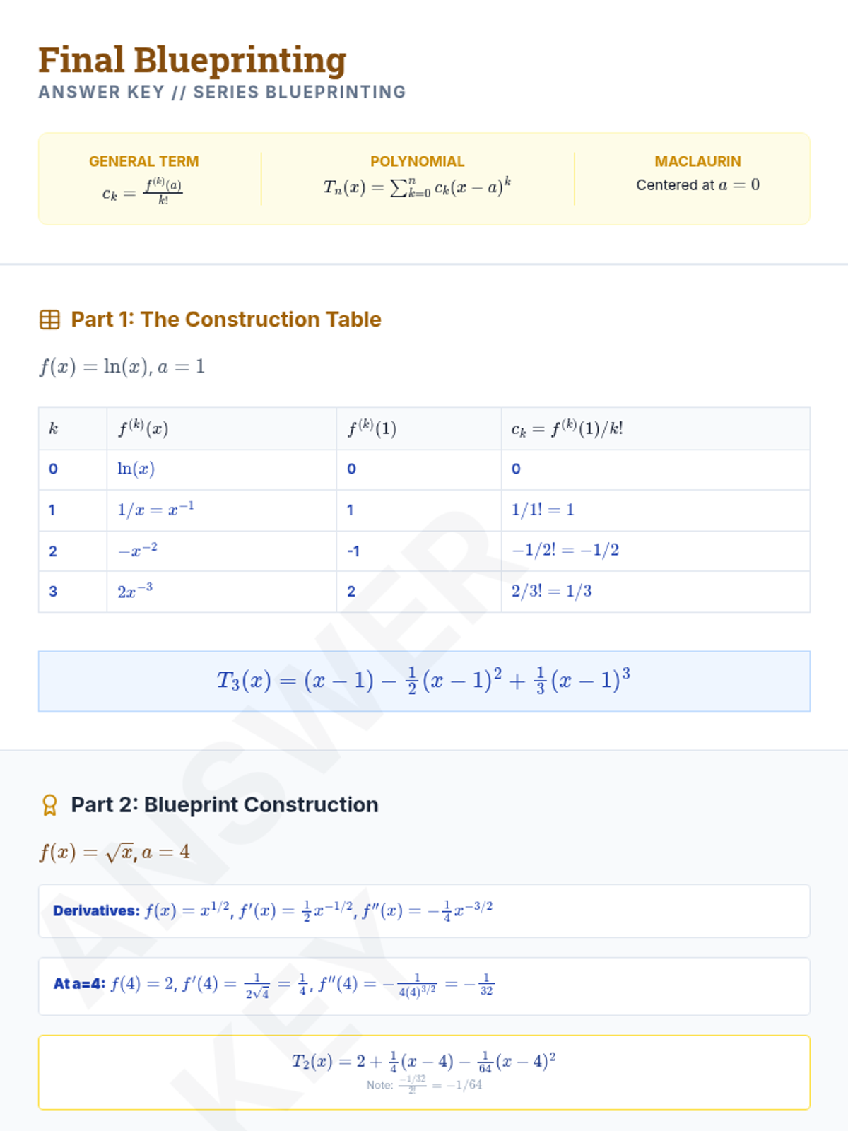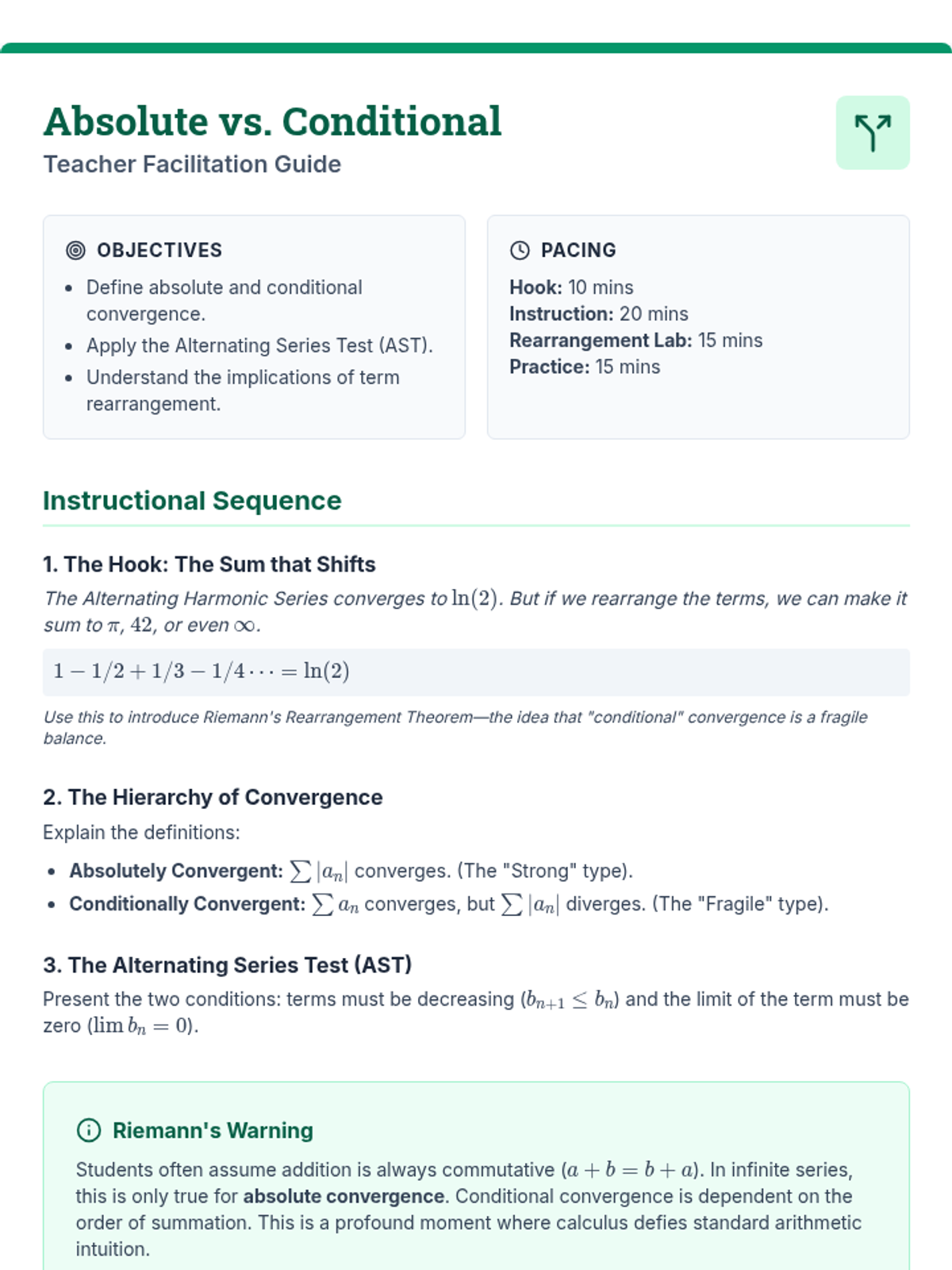 This advanced sequence introduces powerful tools for analyzing series with factorials and powers, leading to the concept of power series. Students master the Ratio and Root tests, explore absolute versus conditional convergence, and conclude by connecting series to functions through Taylor polynomials.