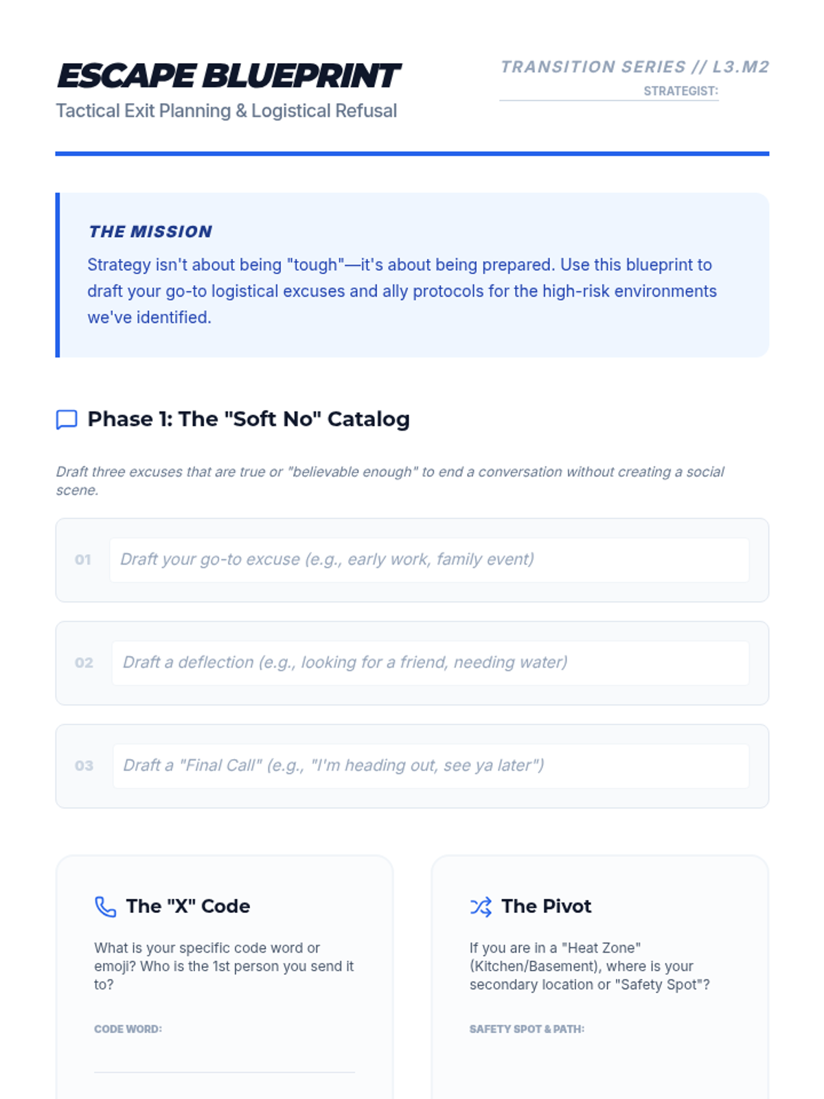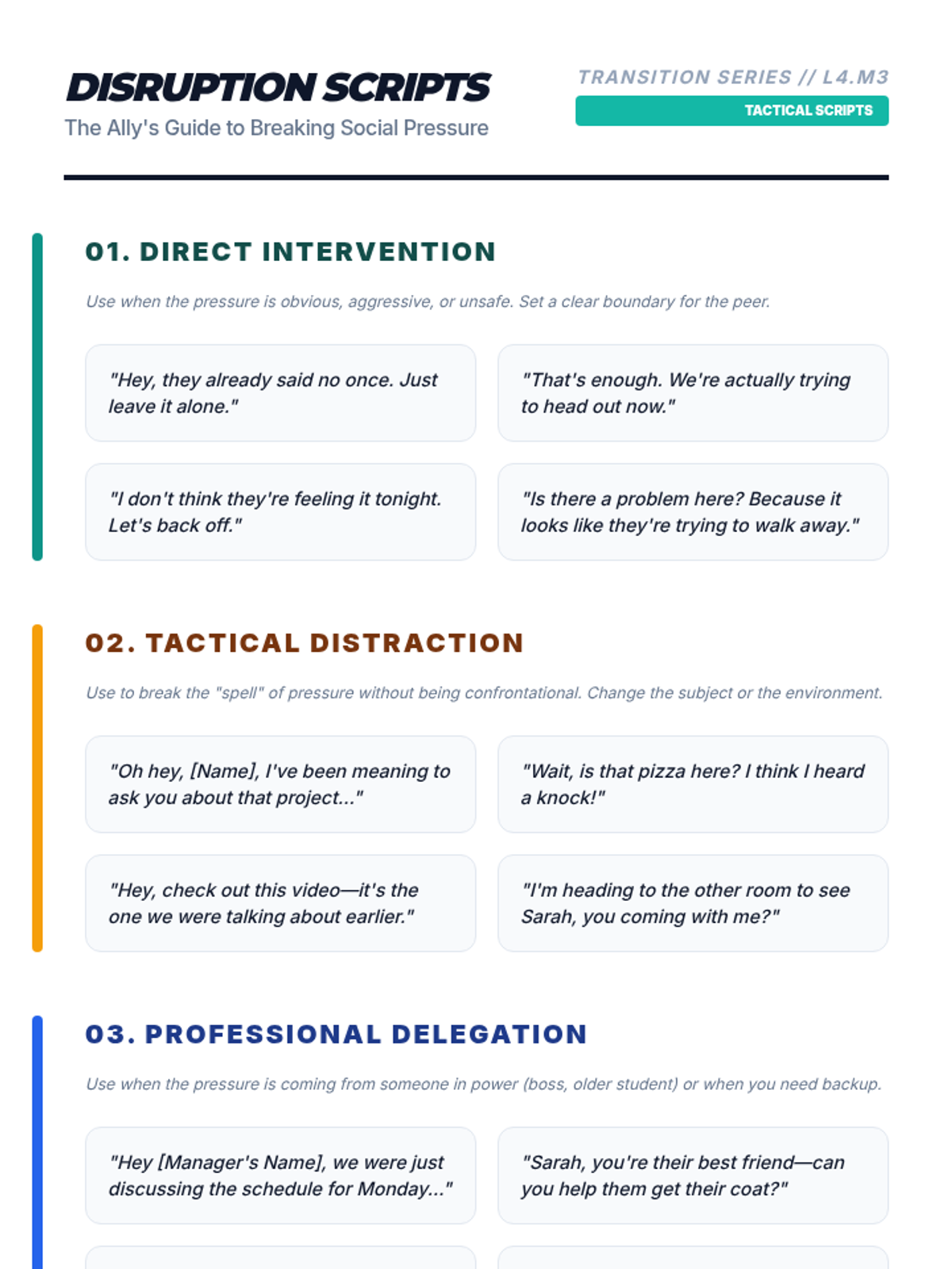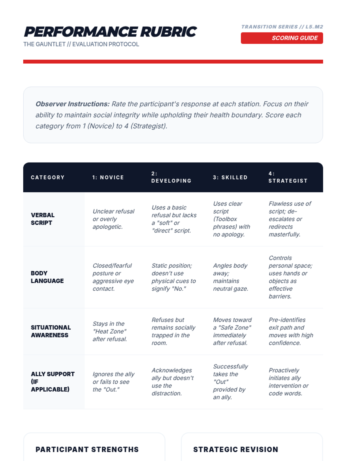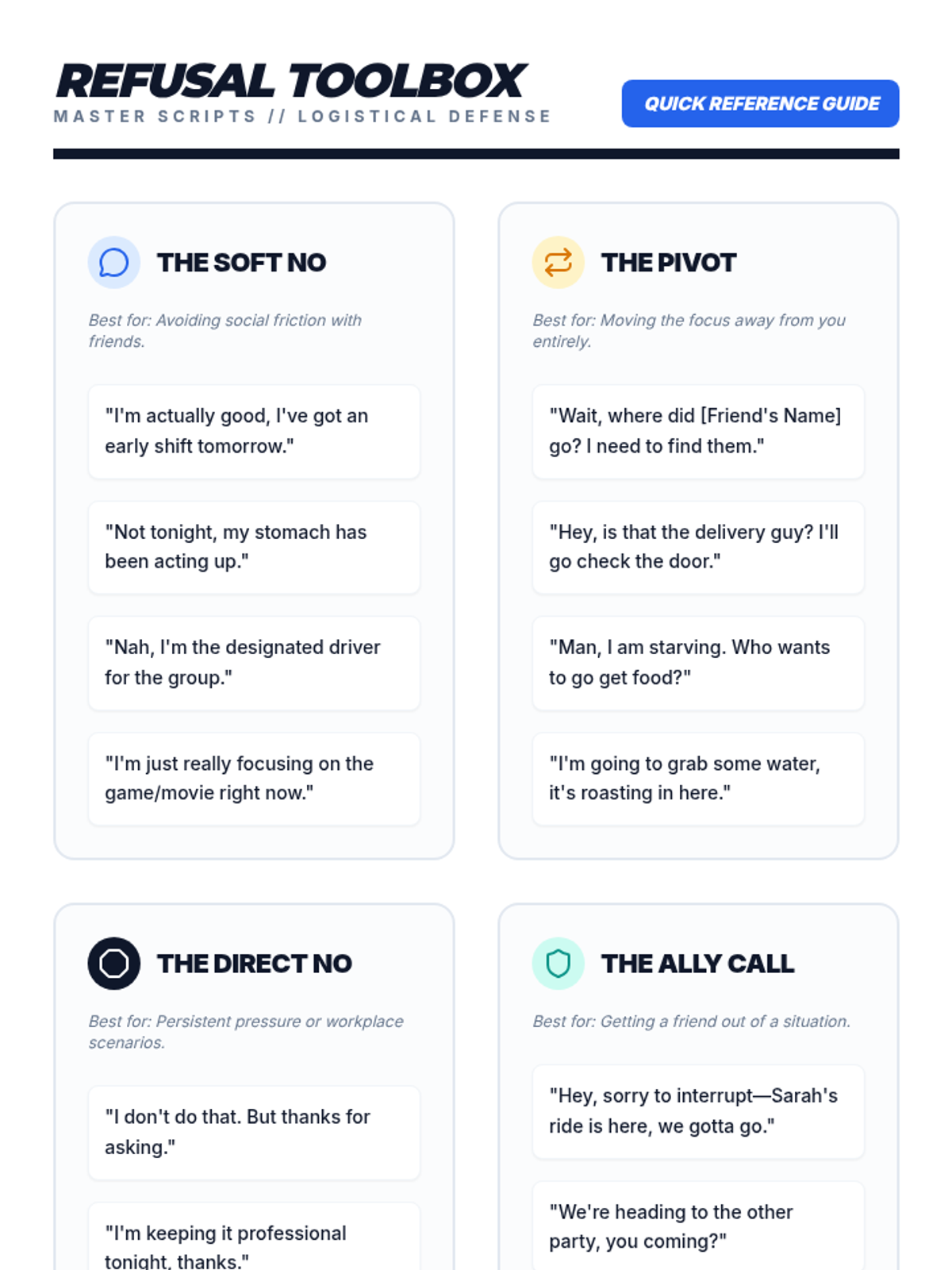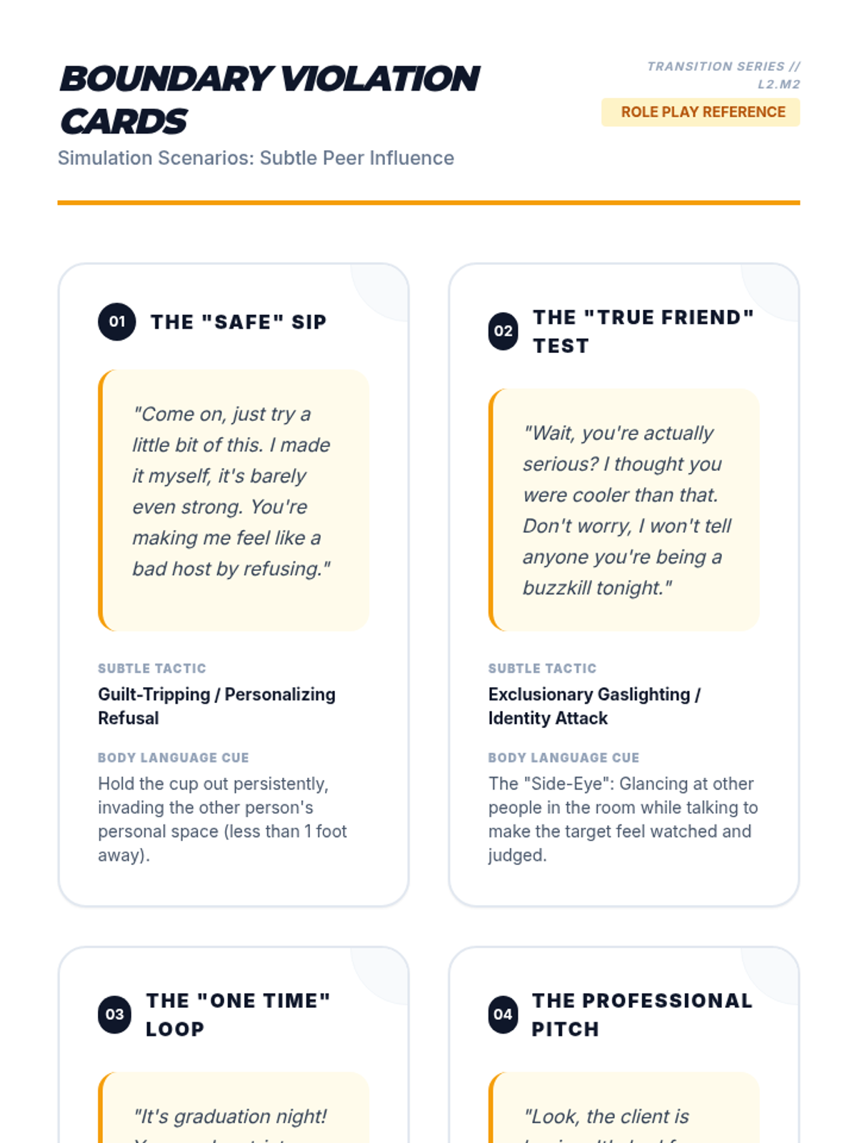 A comprehensive 12th-grade health sequence focused on navigating complex social environments, identifying high-risk scenarios, and applying nuanced refusal and exit strategies to maintain personal integrity regarding substance use.