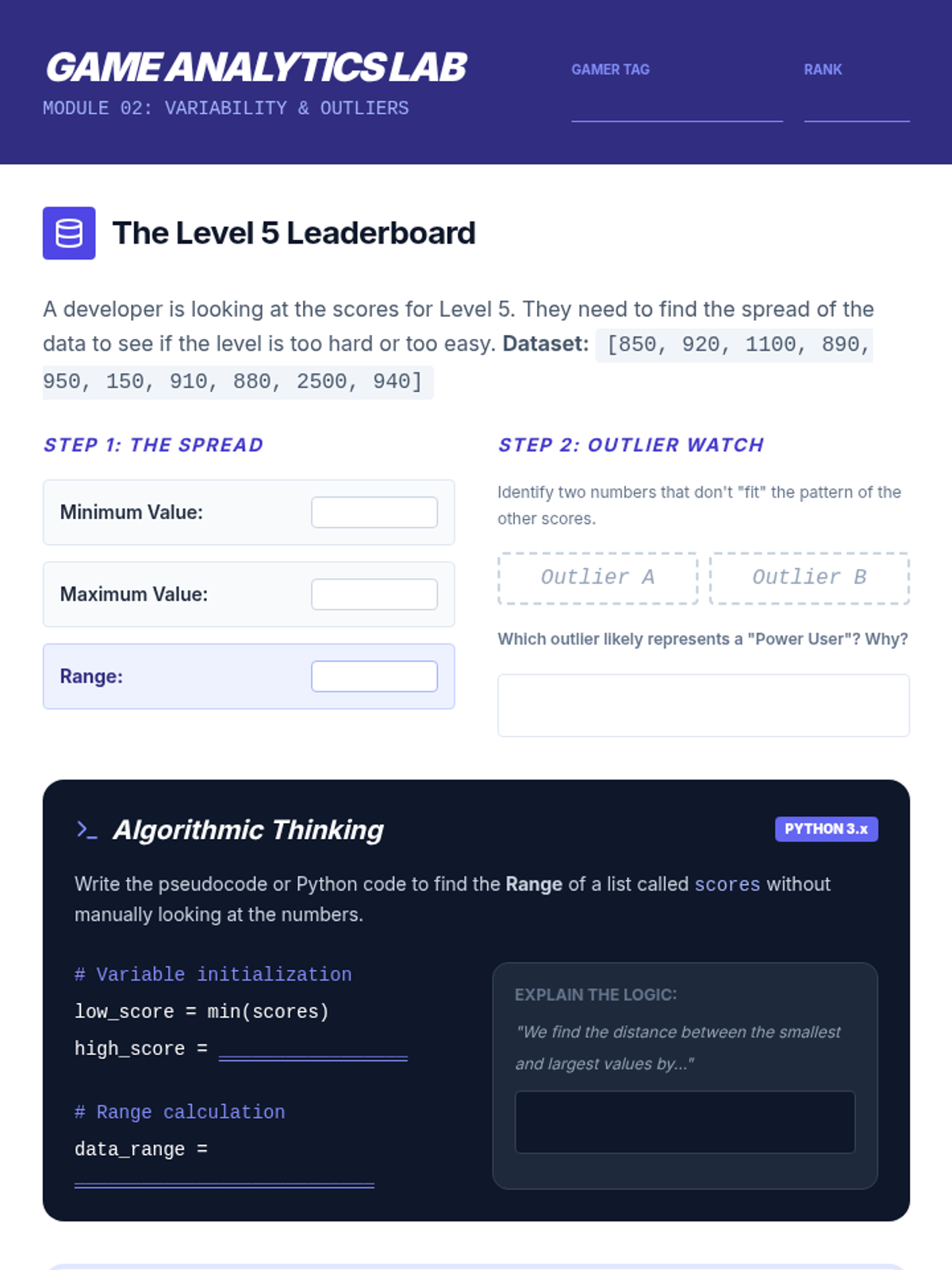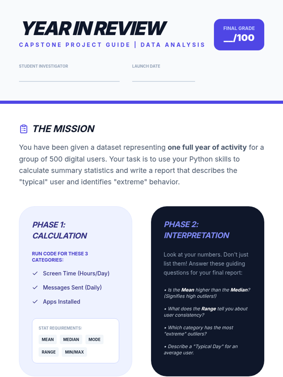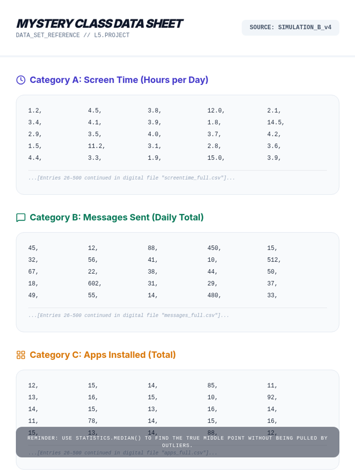 A 6th-grade Computer Science sequence that bridges mathematics and programming. Students learn to apply statistical methods (mean, median, mode, range, and aggregation) using Python, moving from manual calculation to efficient algorithmic analysis of large datasets.