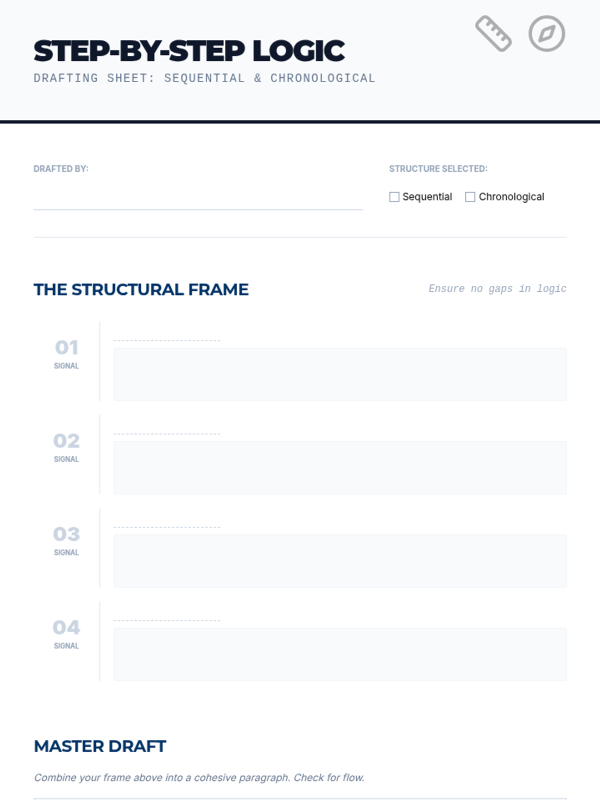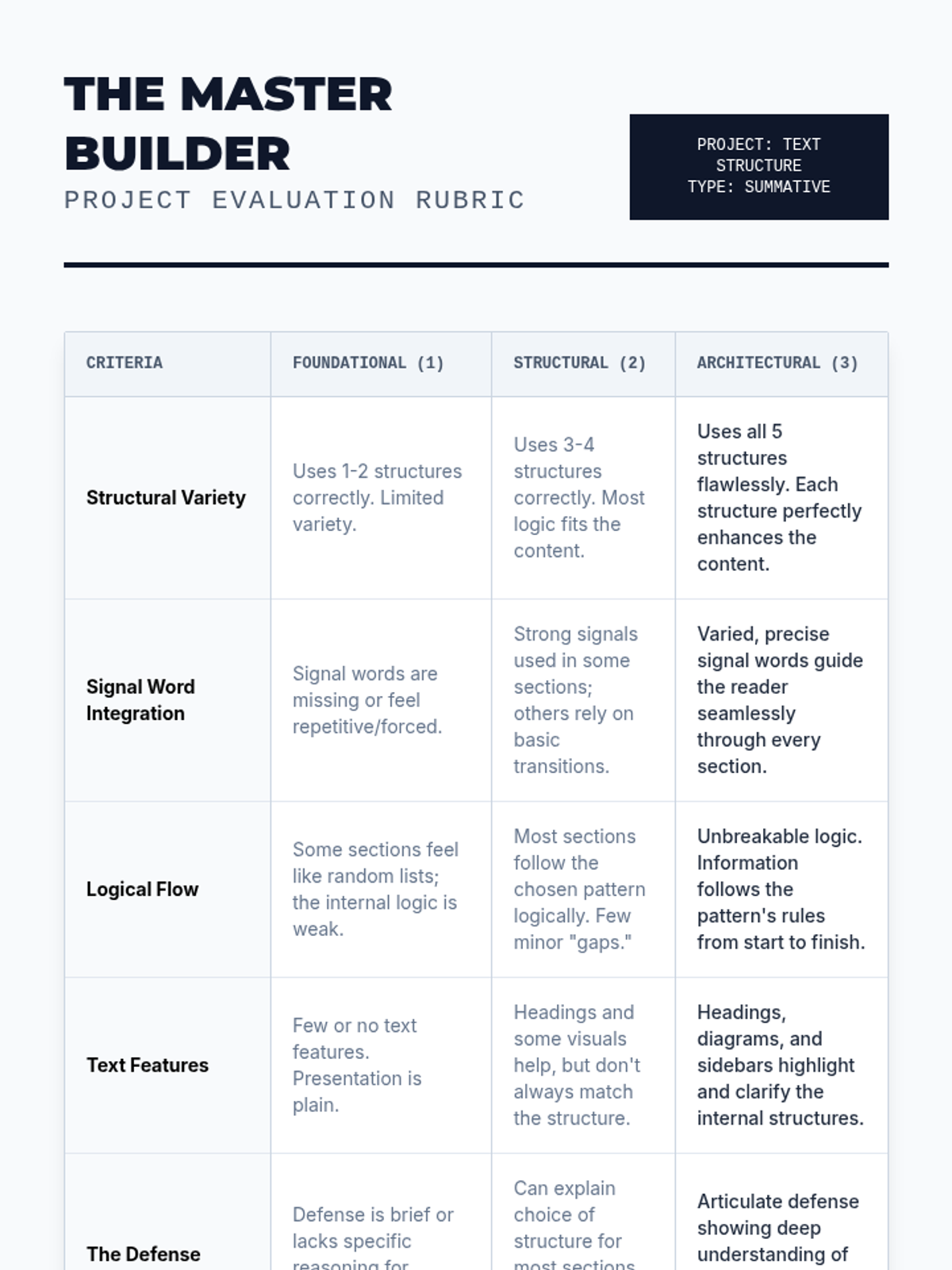 Students transition from consumers to producers of text structure by creating a multi-page informational 'zine' or brochure. Each section of their project applies a specific text structure (Chronological, Sequential, Compare/Contrast, Descriptive, Problem/Solution) to convey information on a topic of their expertise.