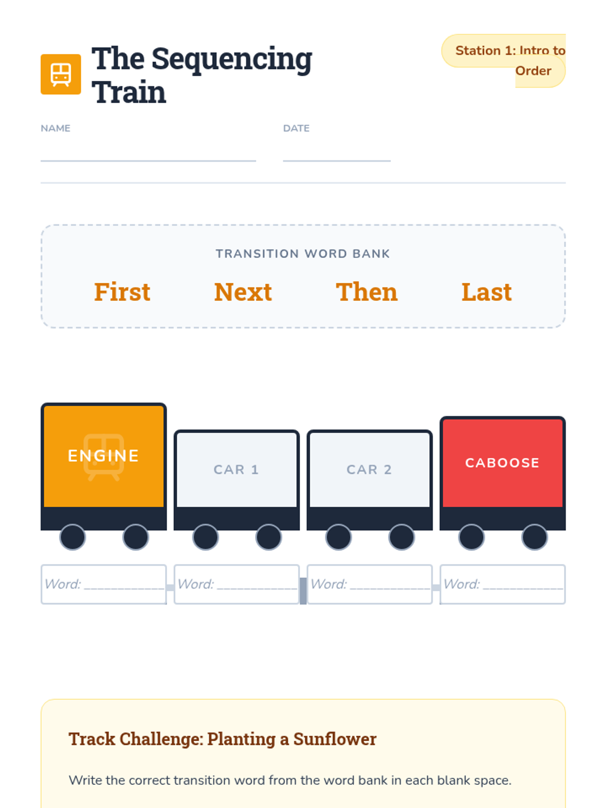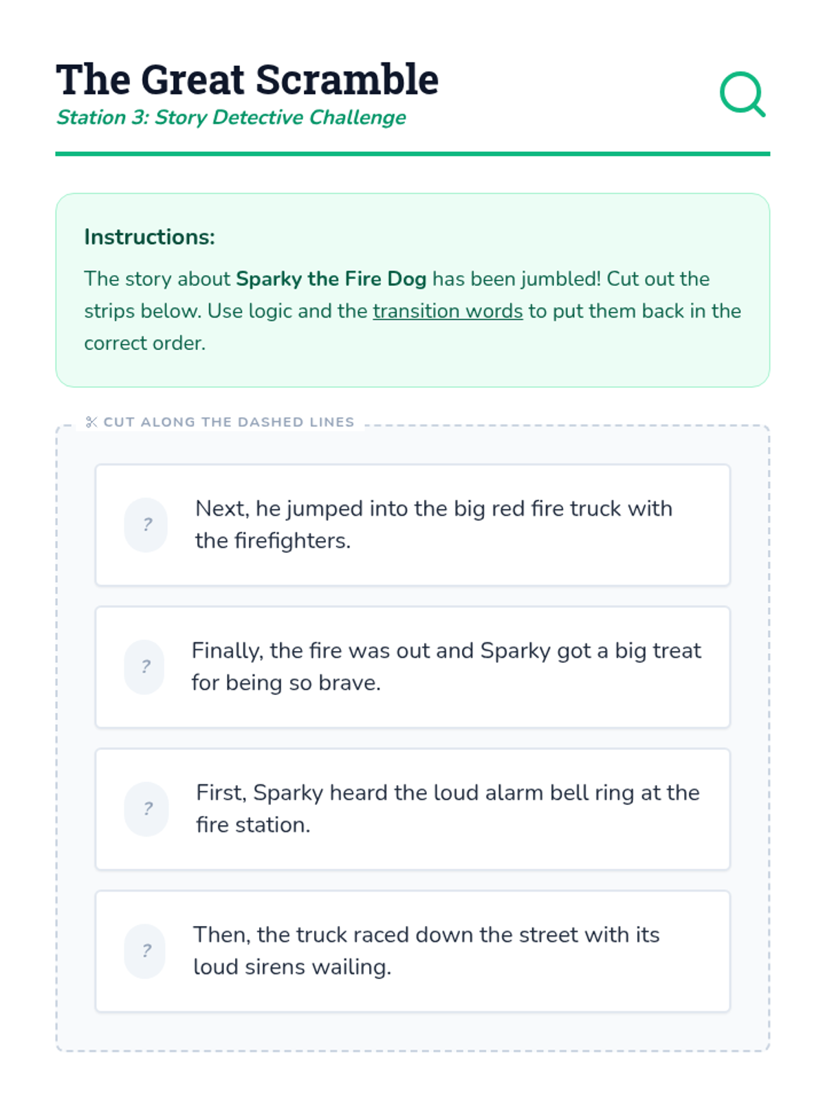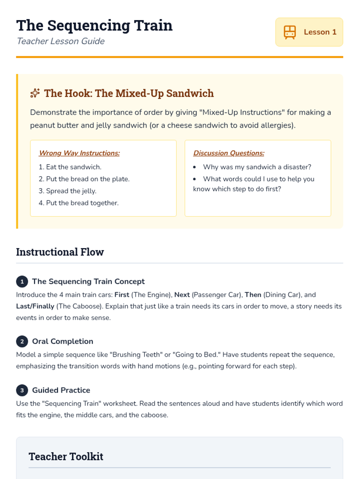 A 2nd-grade sequence focusing on using transition words (First, Next, Then, Finally) to order events in narratives and historical accounts. Students progress from oral practice to reordering scrambled stories and writing their own sequential paragraphs.