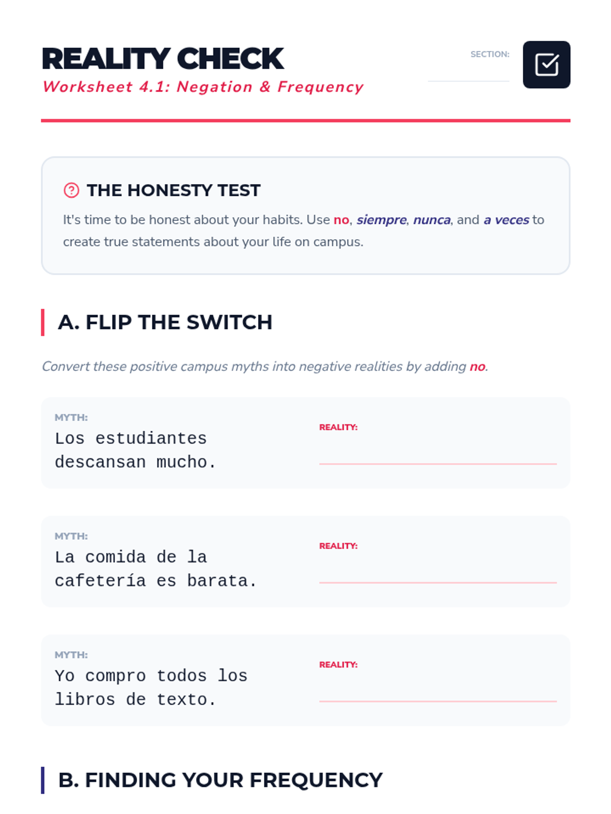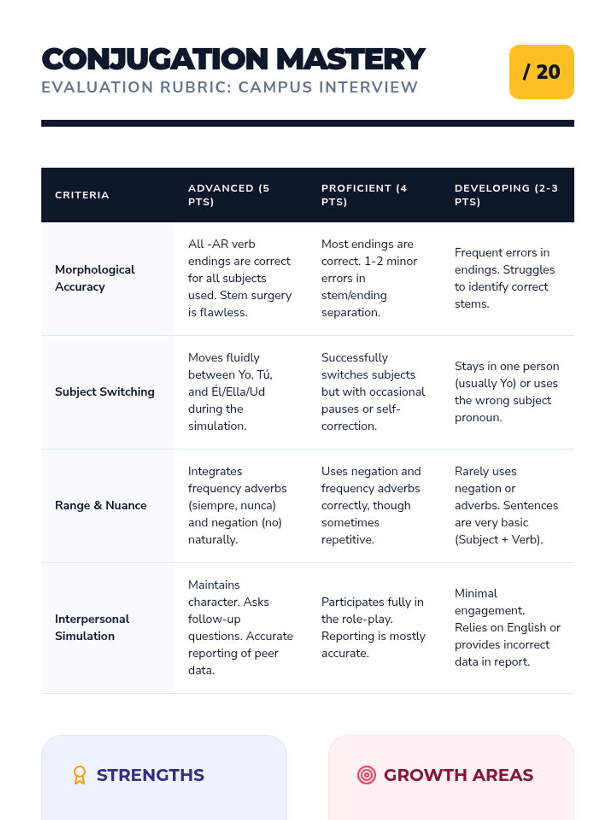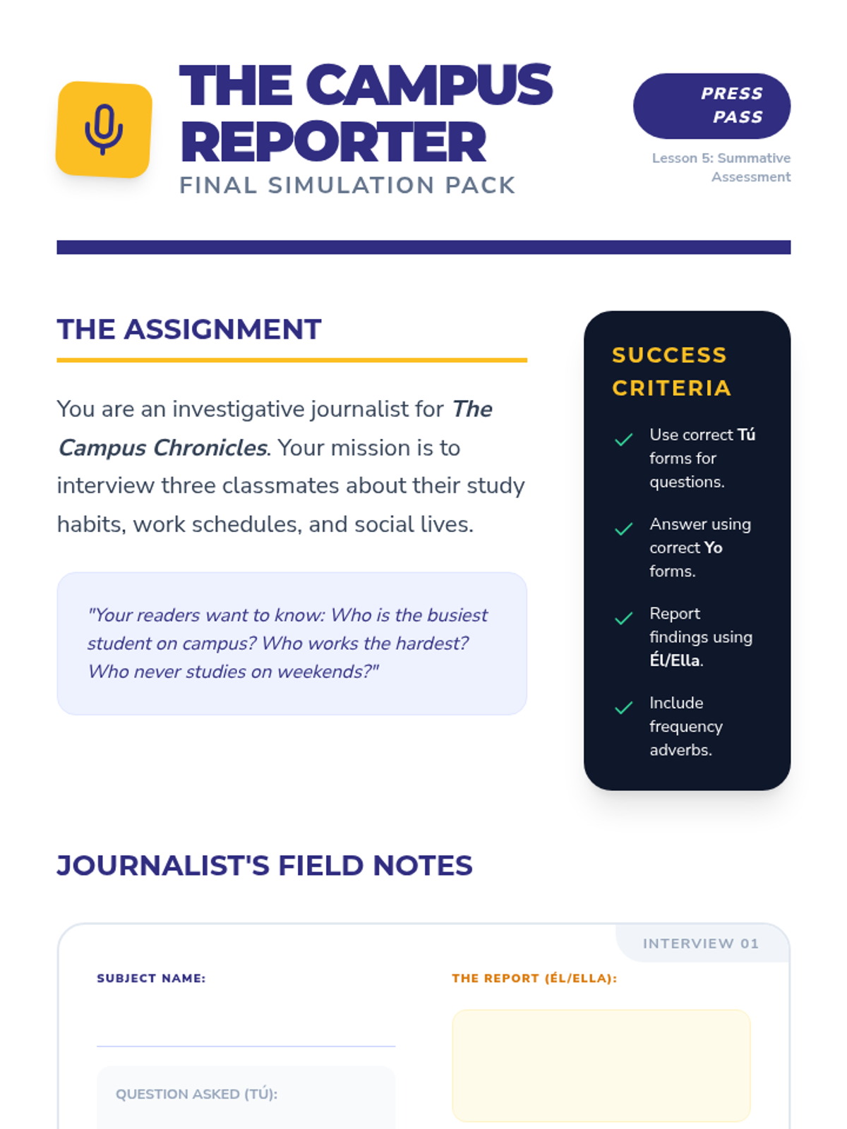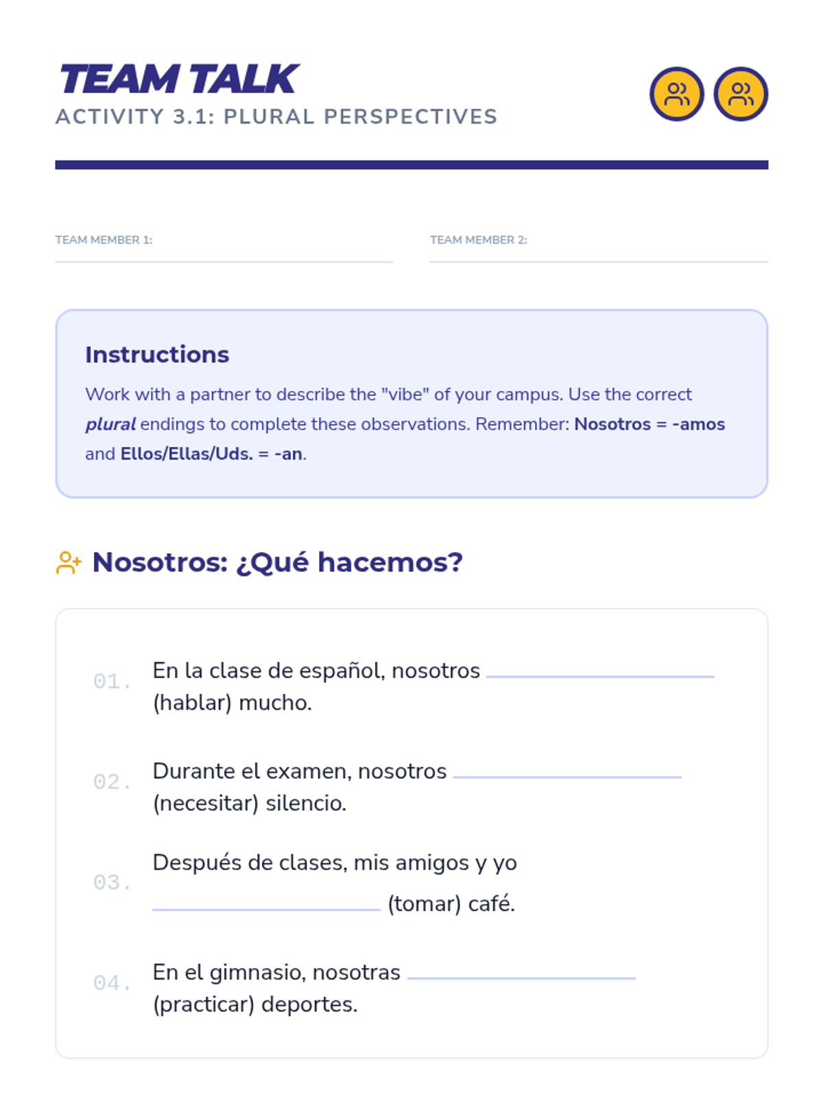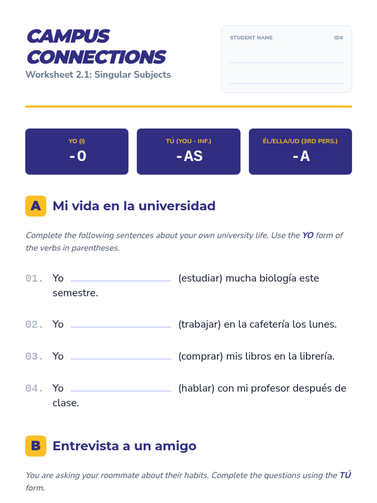 A comprehensive introduction to regular -AR verb conjugation in Spanish, set within the context of university life. Students progress from morphological analysis of stems and endings to full sentence construction, negation, and a final role-play simulation.