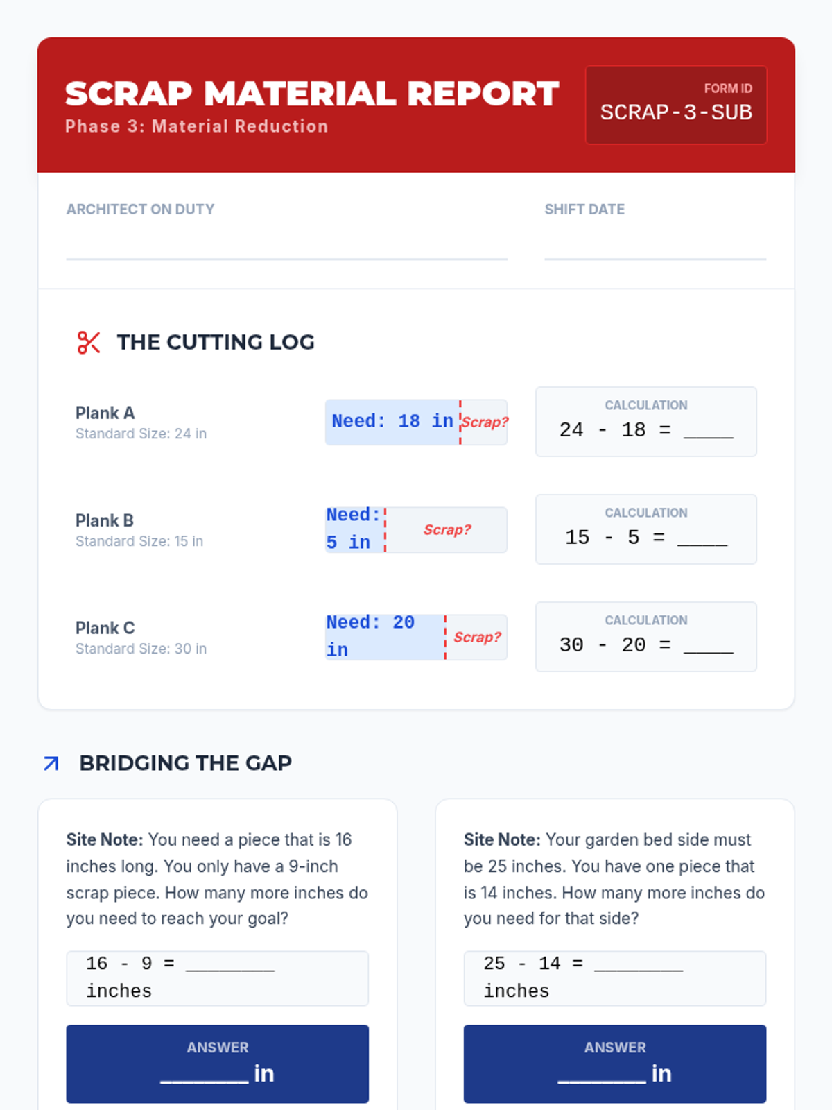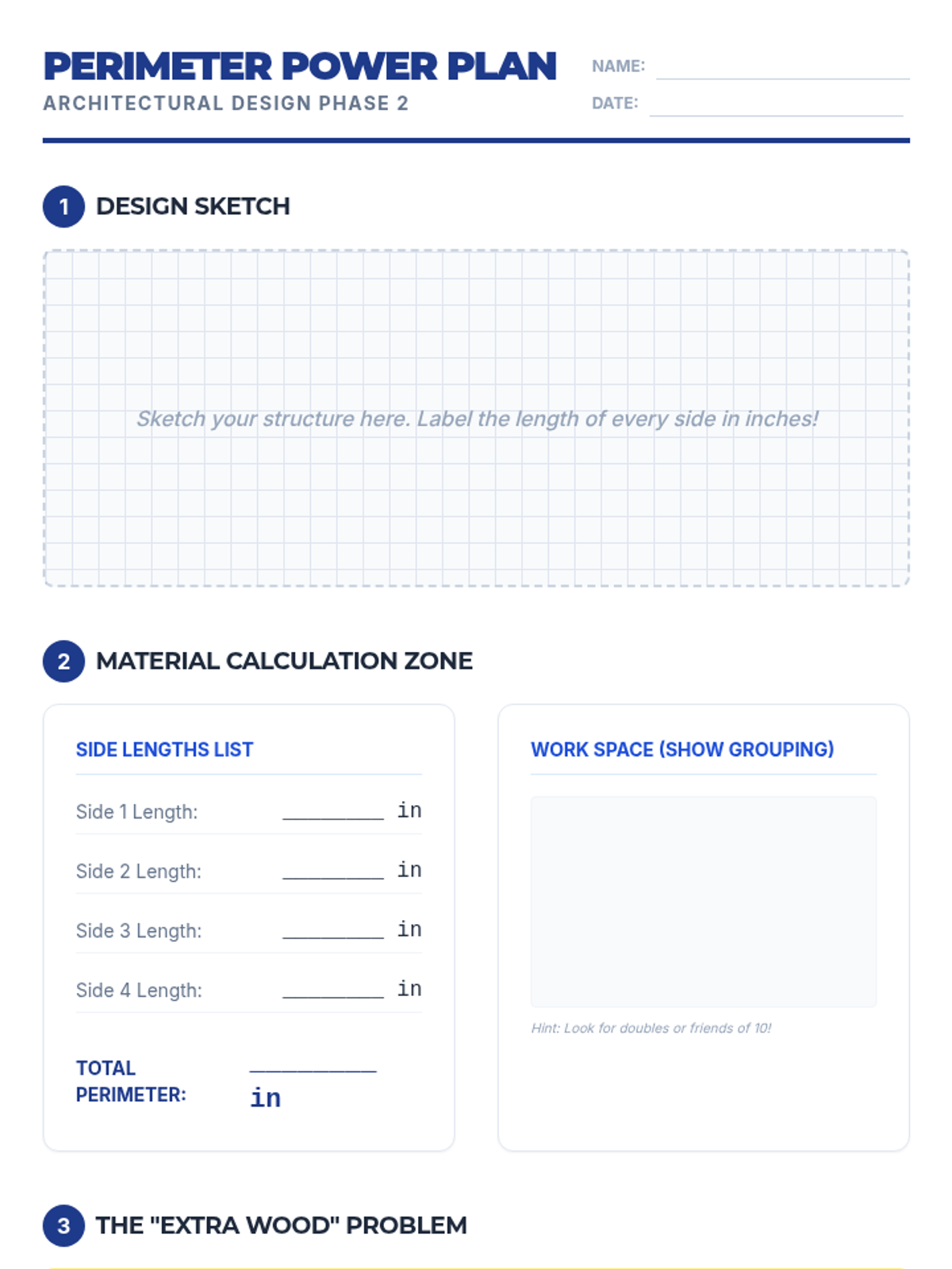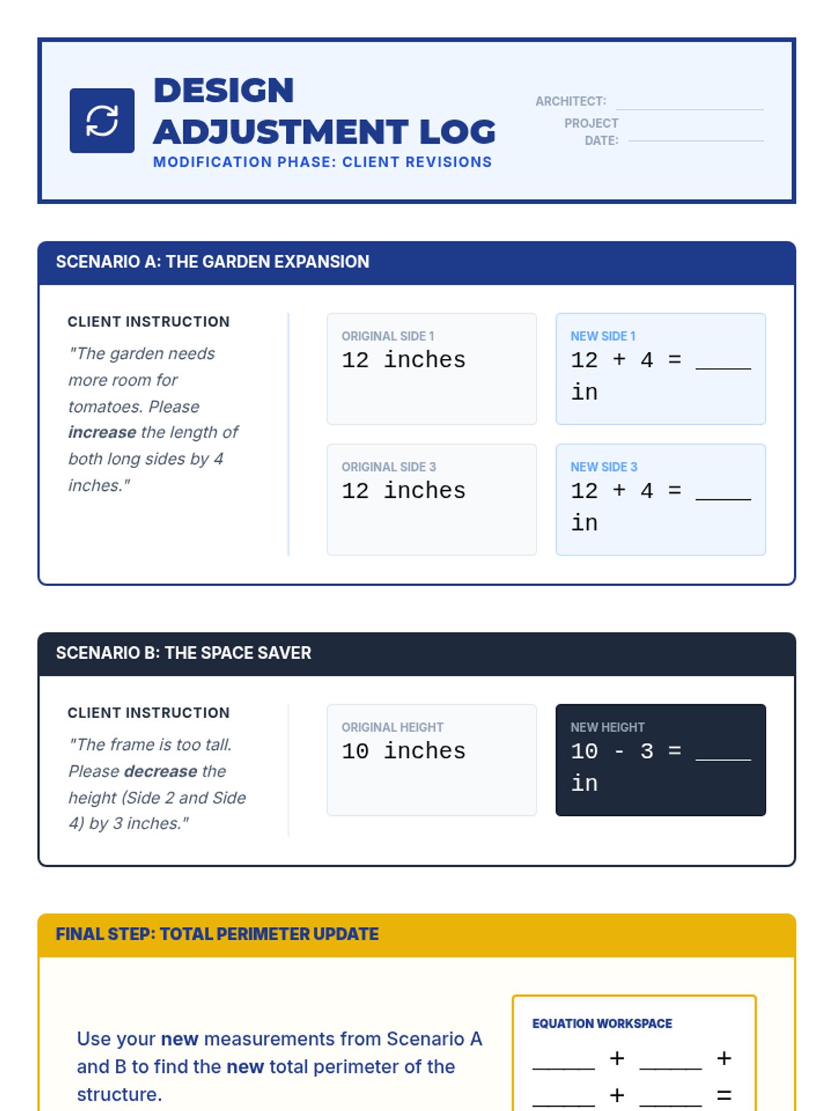 A 3rd Grade project-based sequence where students act as junior architects, using addition and subtraction of length to design and verify a structure. Students move from measuring physical objects to calculating total materials, handling waste, and adjusting designs based on client feedback.