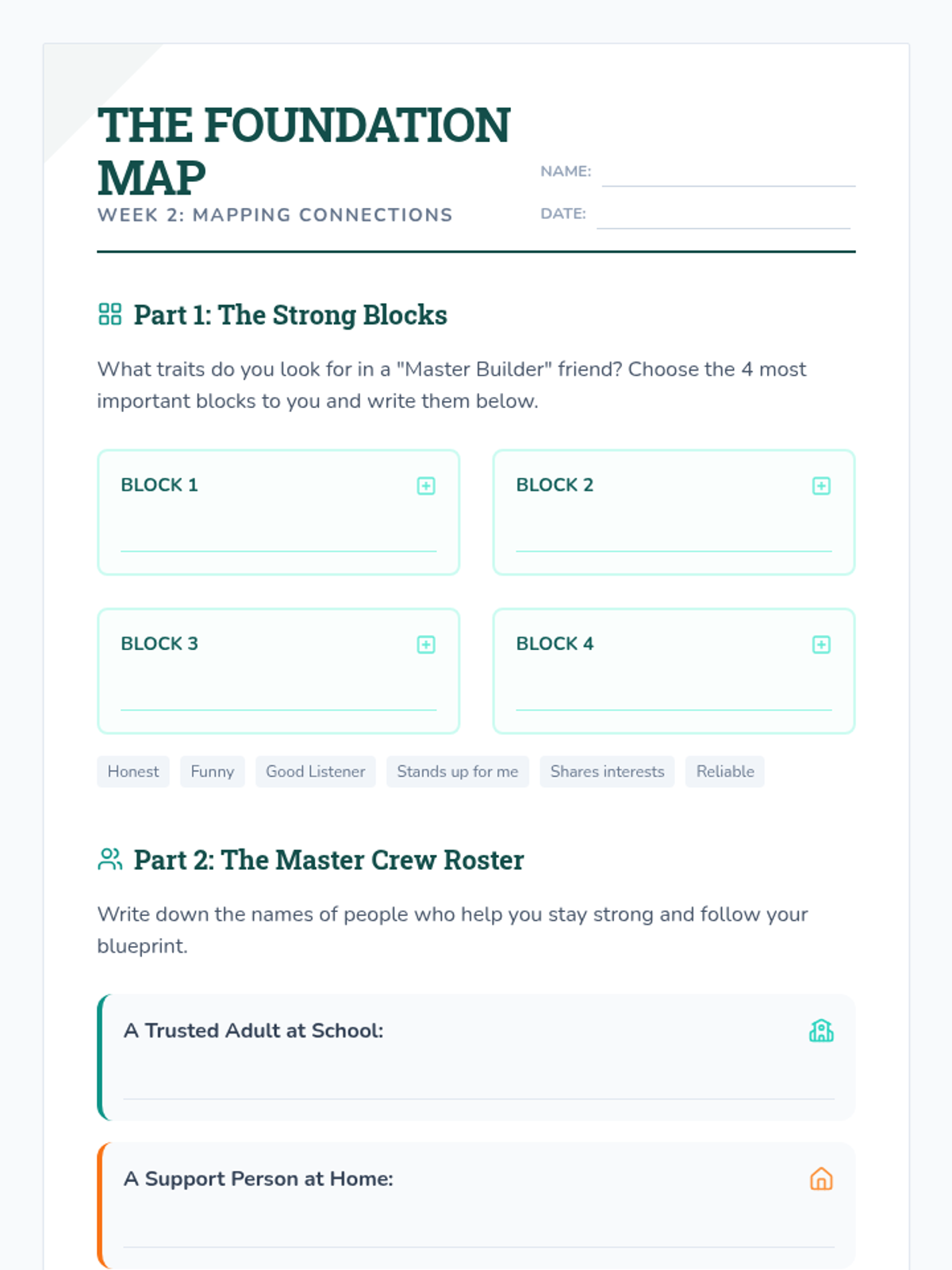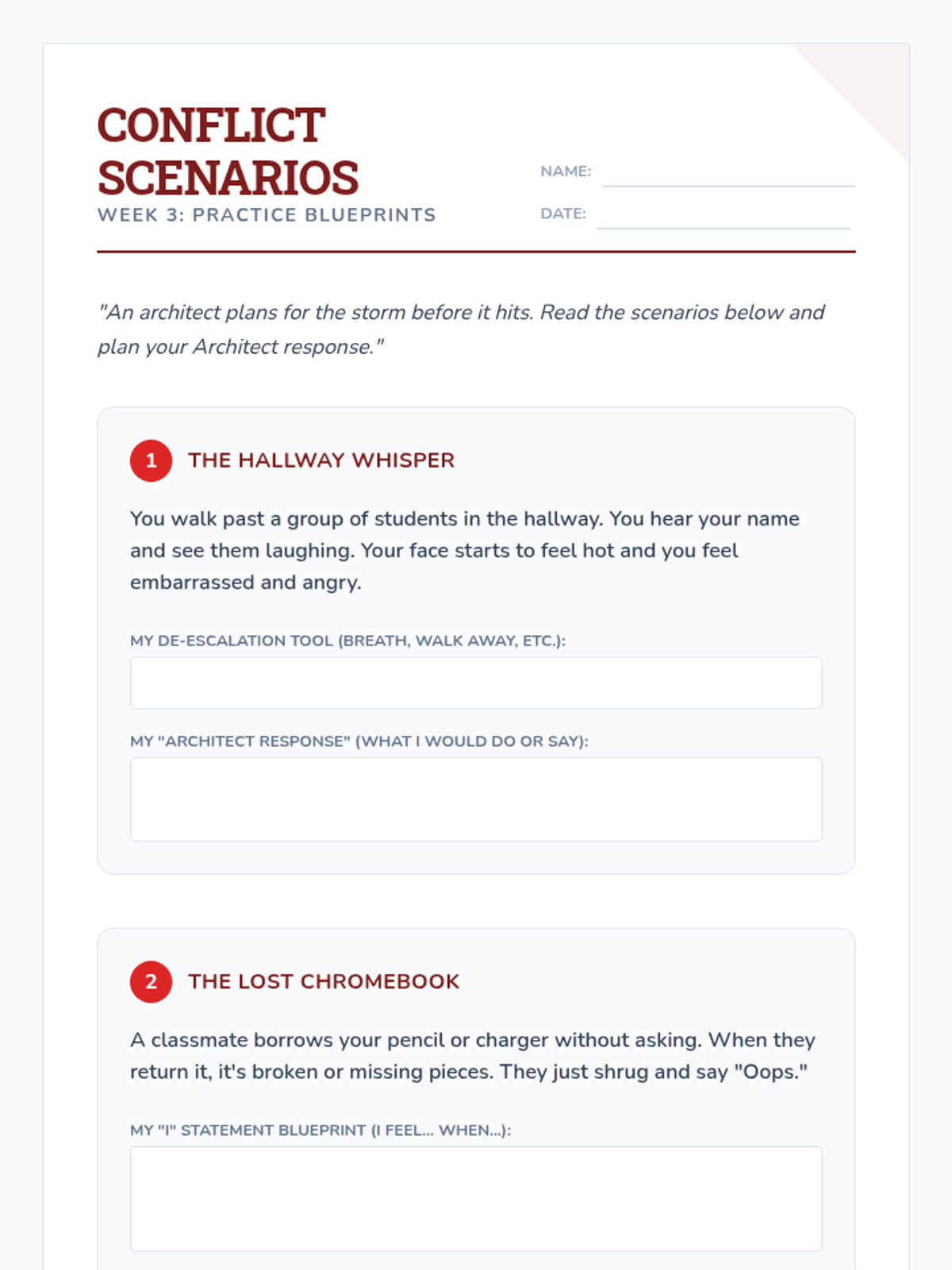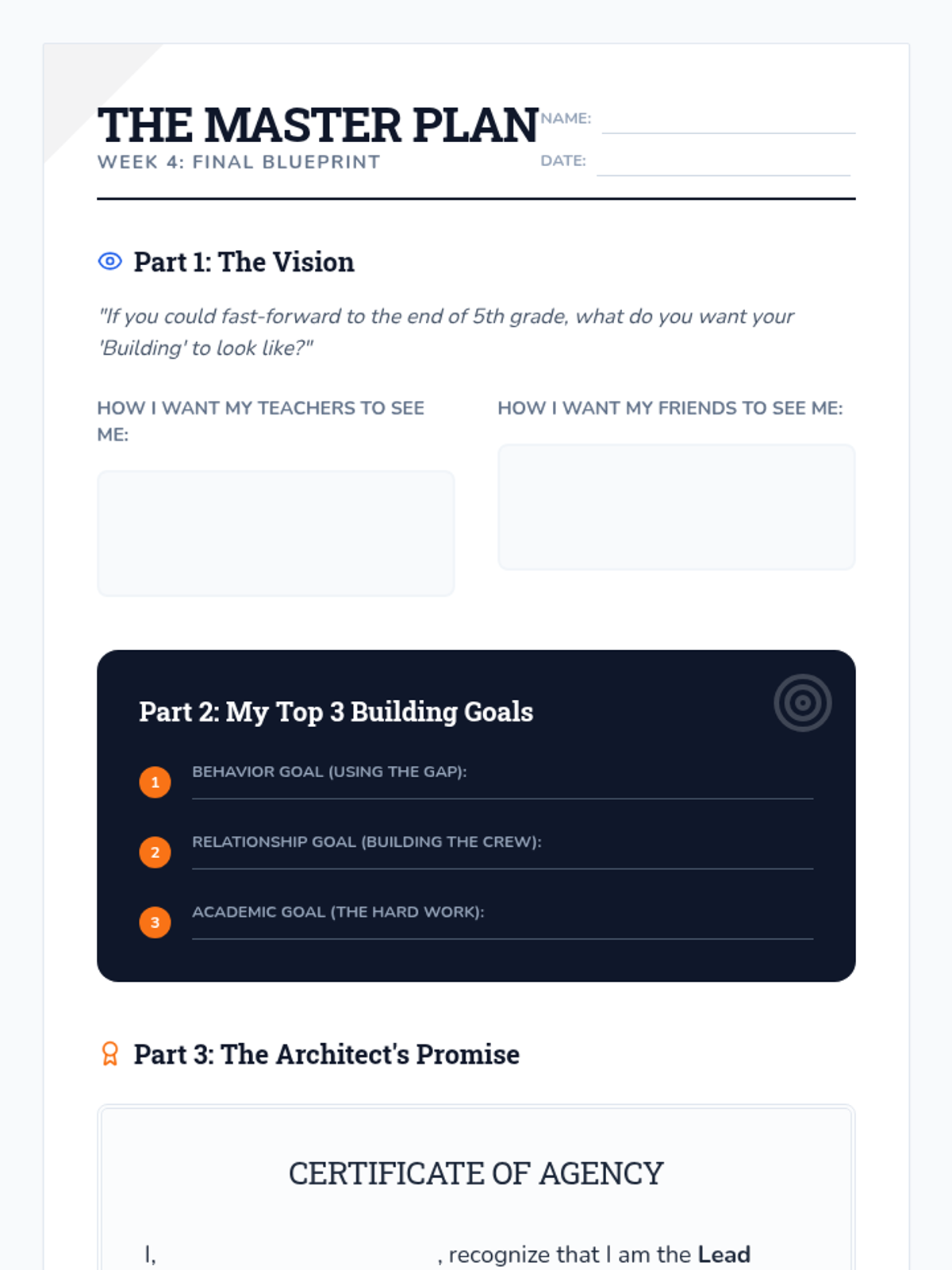 A 4-week restorative intervention program designed for 5th-grade students returning from suspension. The sequence uses a 'Building' metaphor to explore impulse control, healthy relationships, conflict resolution, and self-agency through discussion and structured reflection.