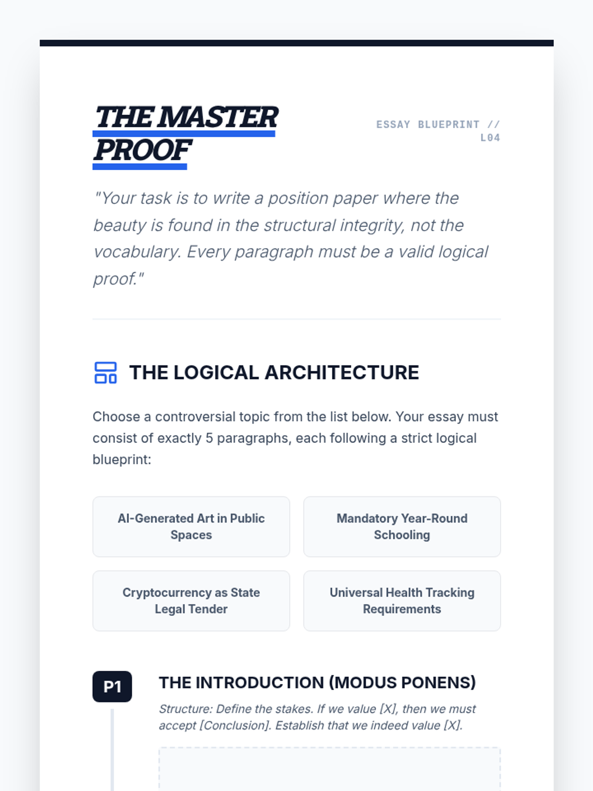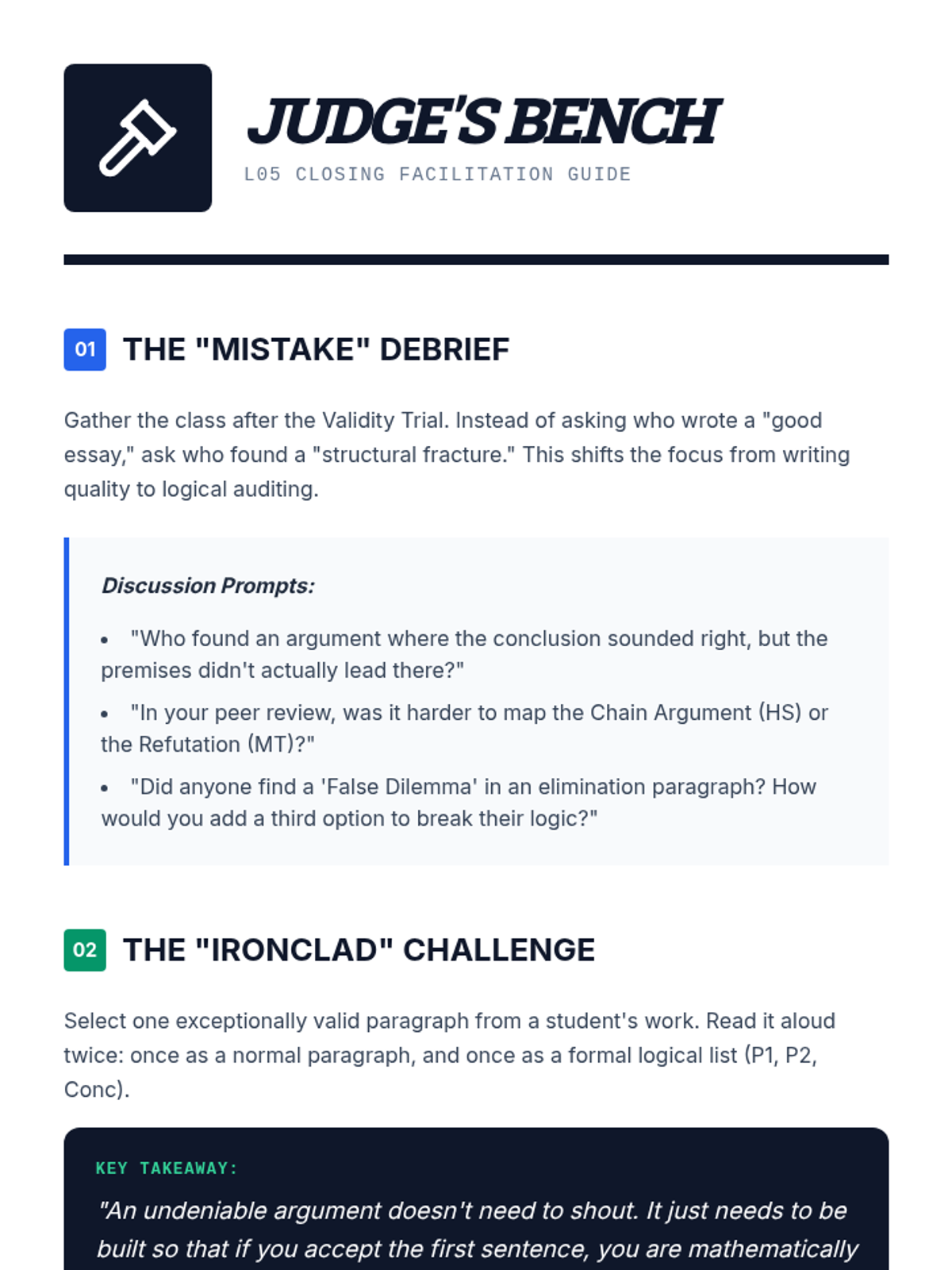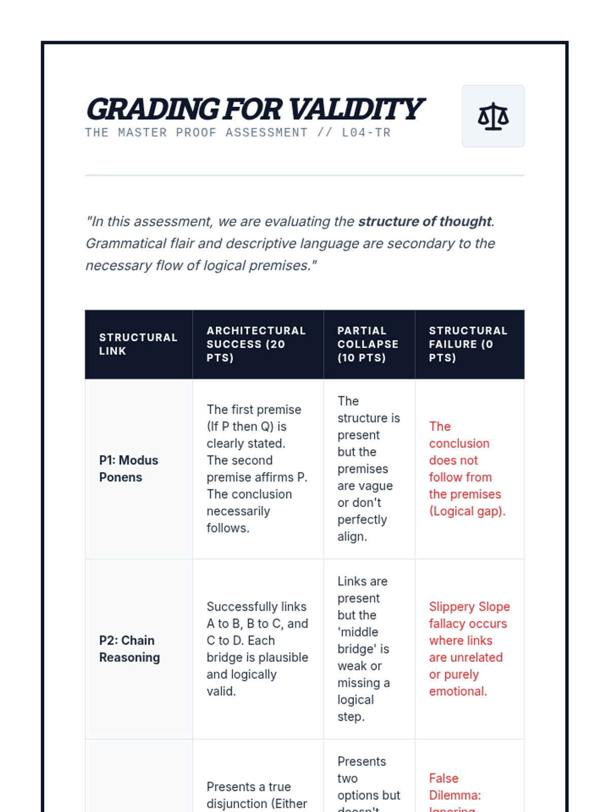 A 9th-grade English Language Arts sequence that bridges formal logic with argumentative writing. Students learn to use valid argument forms like Modus Ponens, Modus Tollens, and Hypothetical Syllogisms as structural blueprints for high-quality, undeniable writing.