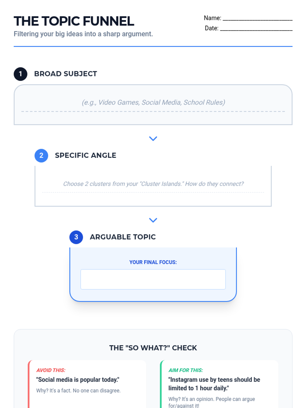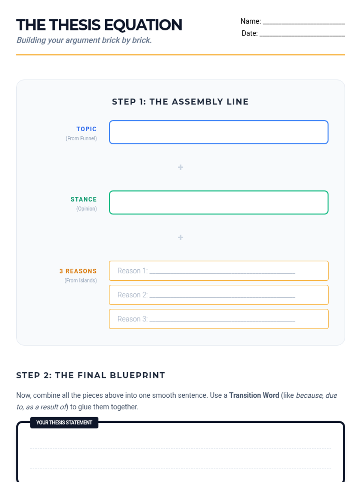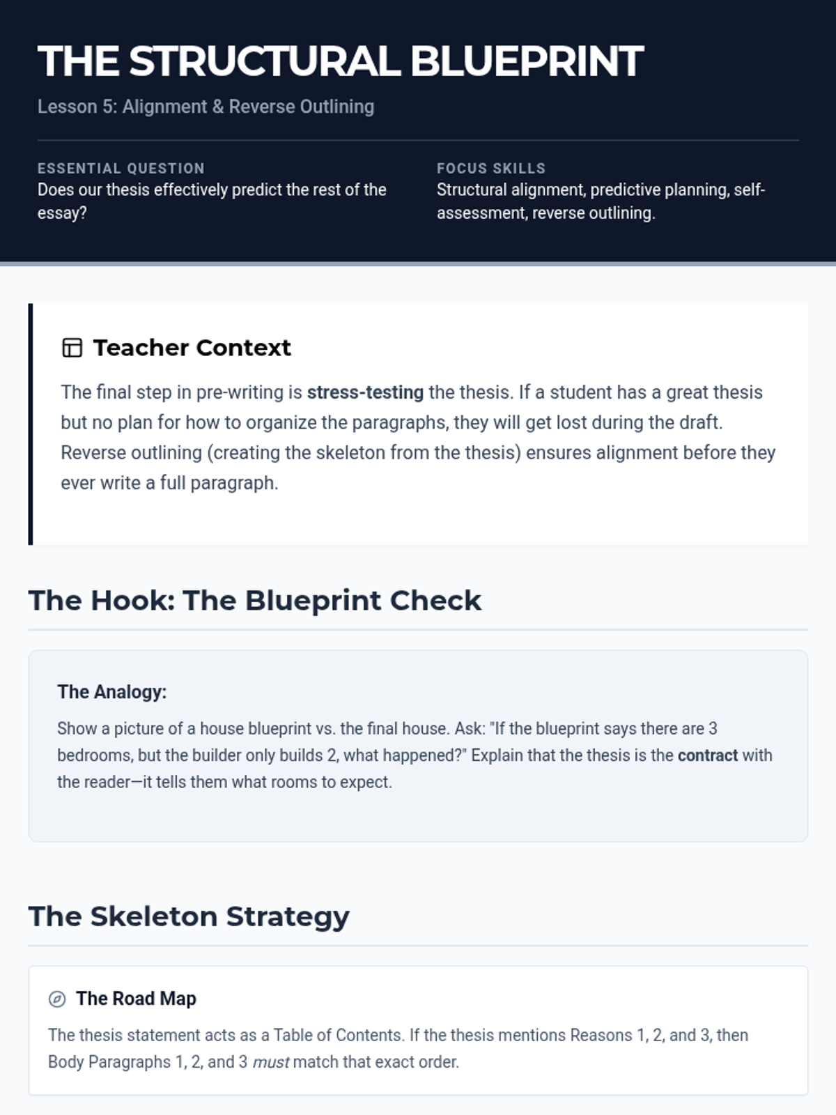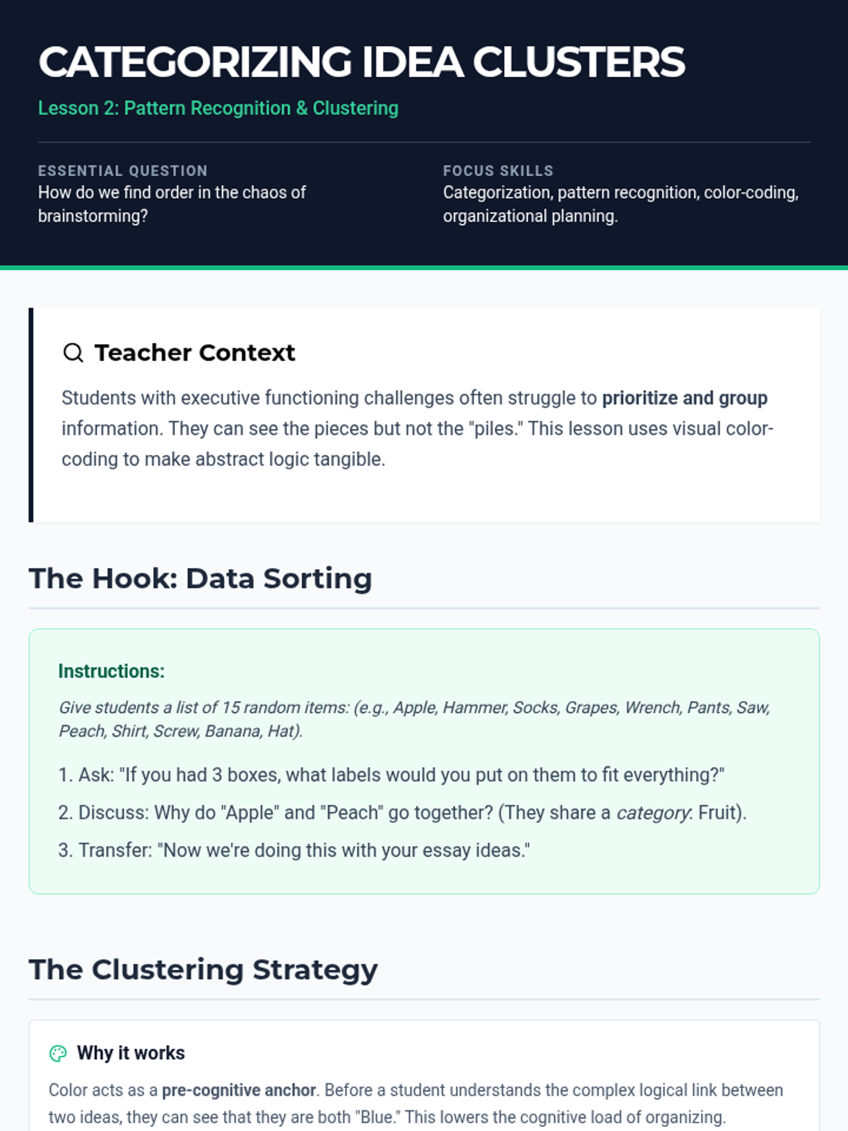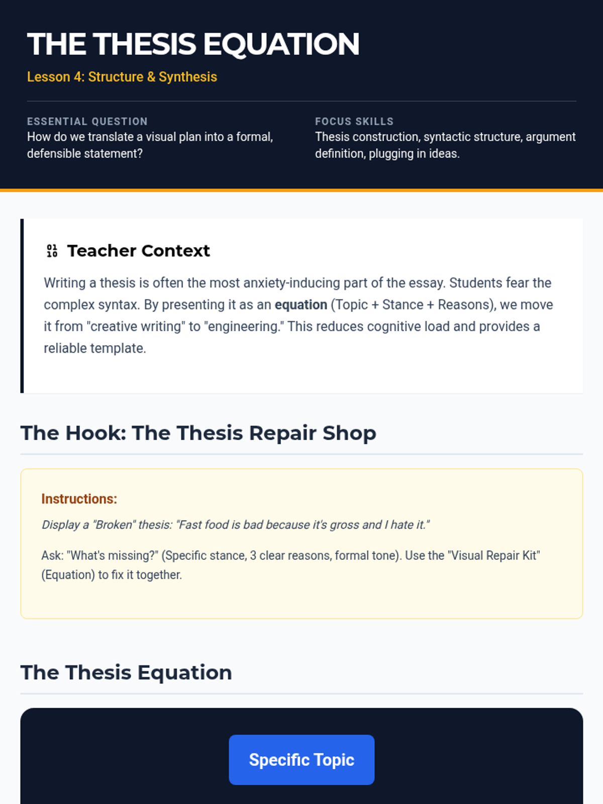 A comprehensive sequence designed for 10th-grade academic support, focusing on visual brainstorming strategies to transform abstract thoughts into strong, defensible thesis statements. Students progress from unstructured free-association to structured categorization and formal thesis construction using specialized graphic organizers.