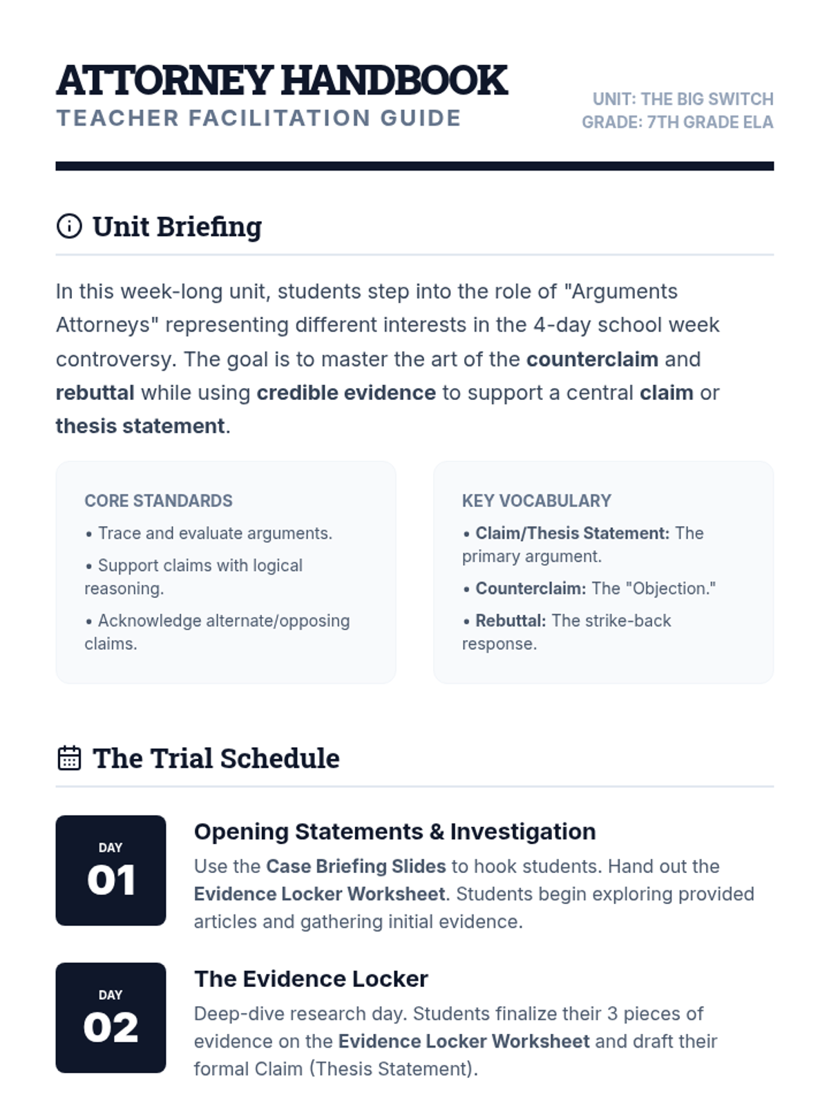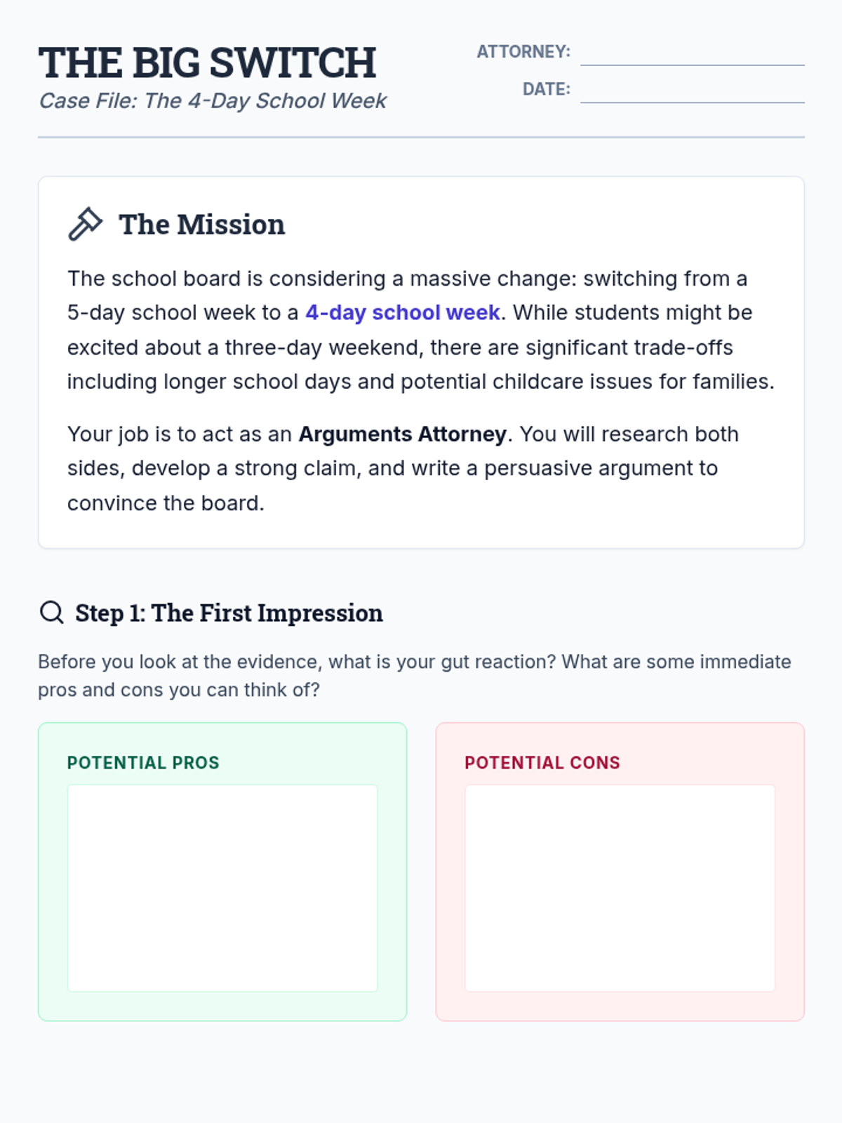 A week-long argumentative writing unit for 7th graders focused on the controversial topic of the 4-day school week. Students act as 'Arguments Attorneys' to research, build claims, and master the art of the rebuttal.