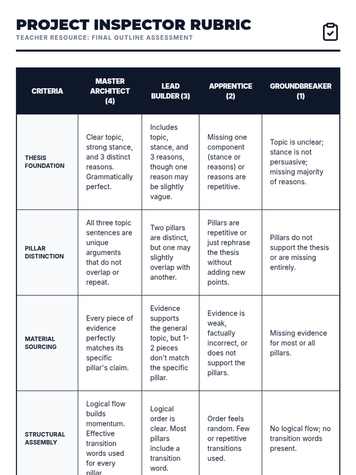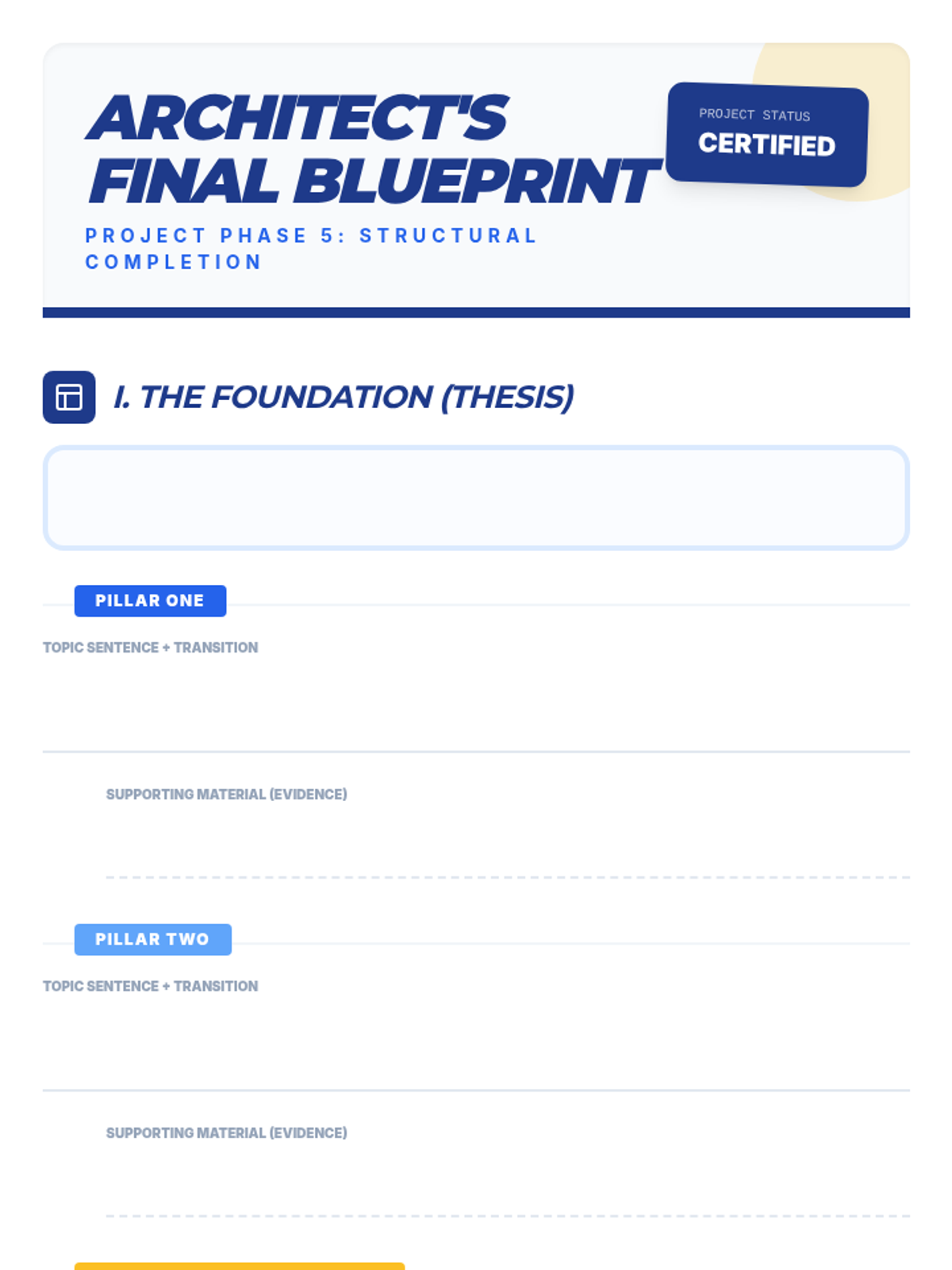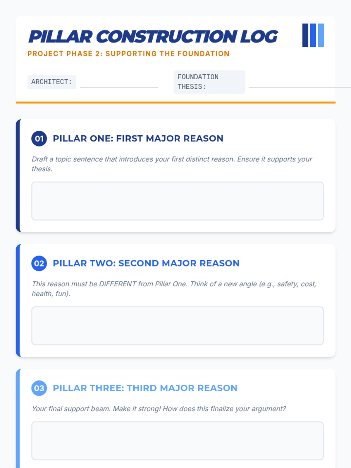 A project-based sequence where 5th-grade students learn to construct strong persuasive arguments by mastering thesis statements and topic sentences, themed around architectural blueprints and construction.