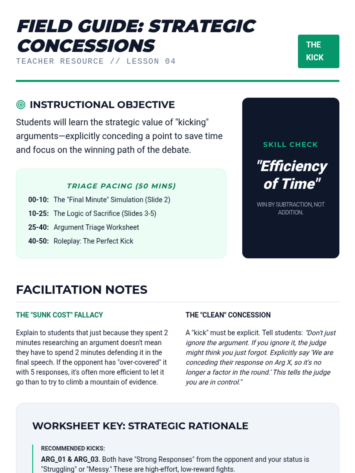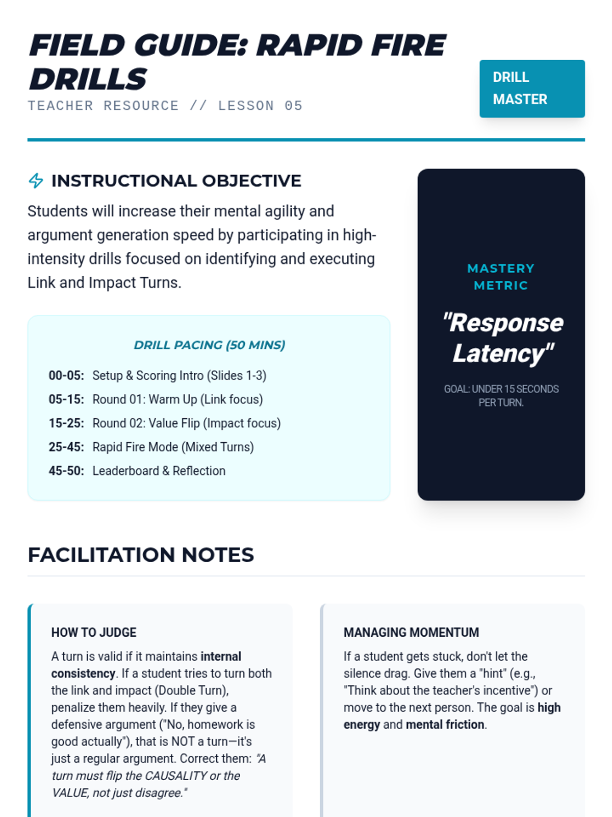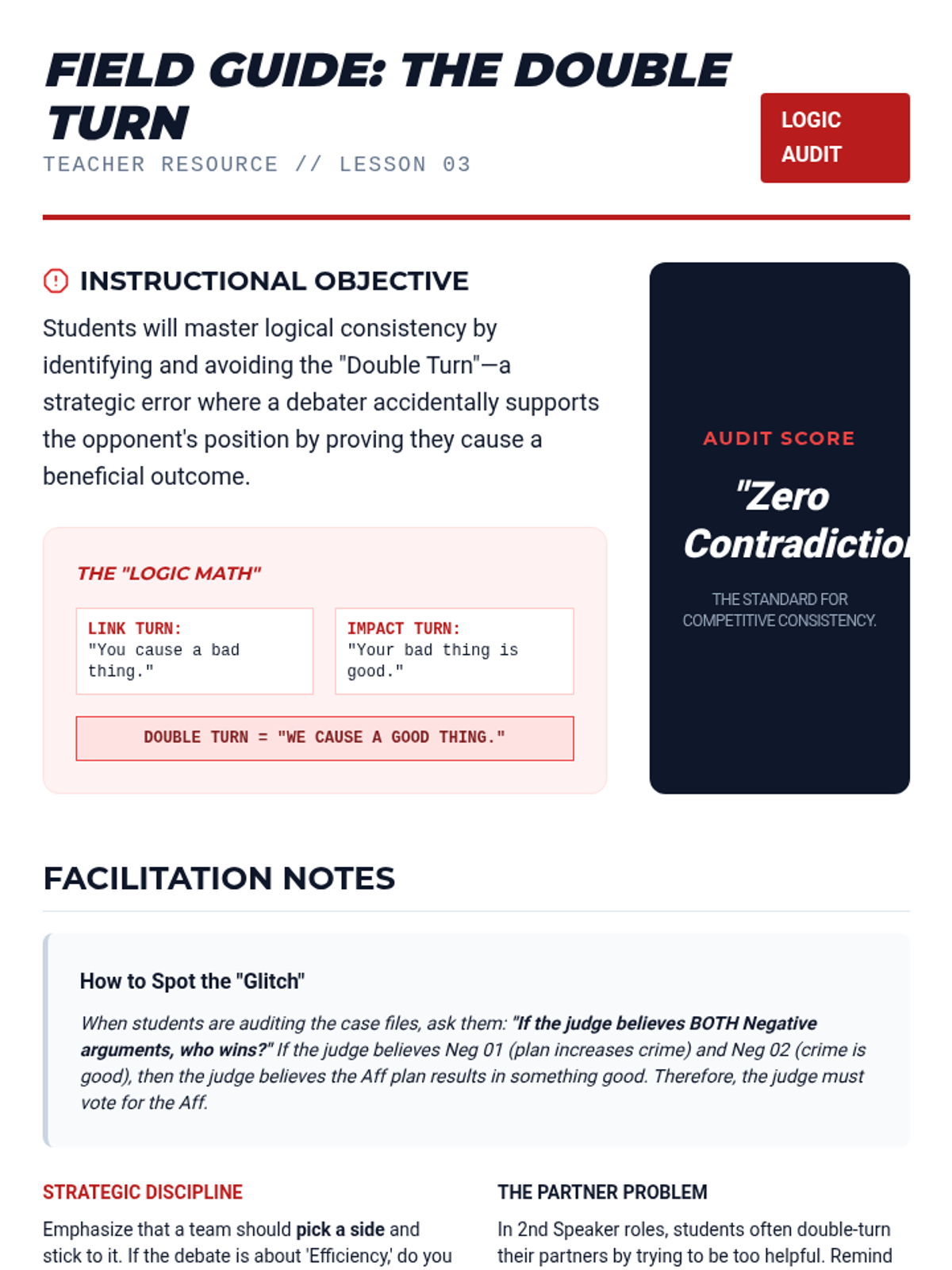 This advanced sequence introduces the concept of the 'turn'—using an opponent's argument against them. Students explore Link Turns and Impact Turns, practice logical consistency to avoid the 'double turn', and master the art of strategic concessions.