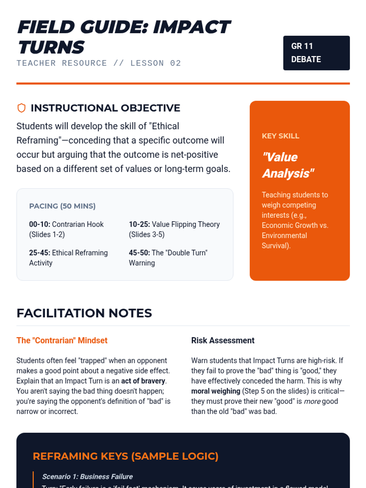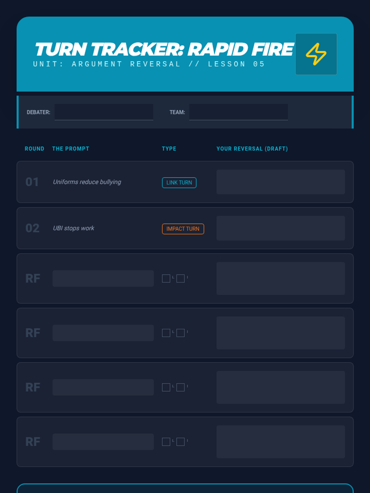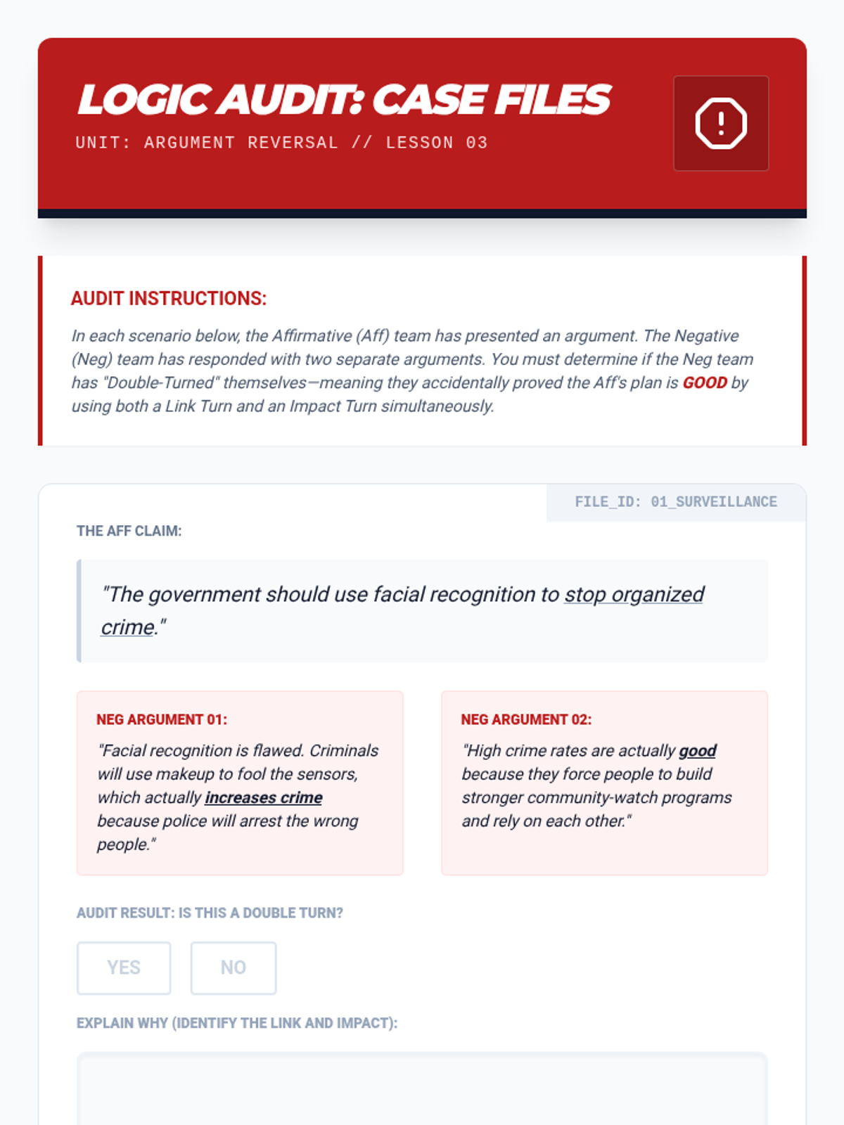 This advanced sequence introduces the concept of the 'turn'—using an opponent's argument against them. Students explore Link Turns and Impact Turns, practice logical consistency to avoid the 'double turn', and master the art of strategic concessions.
