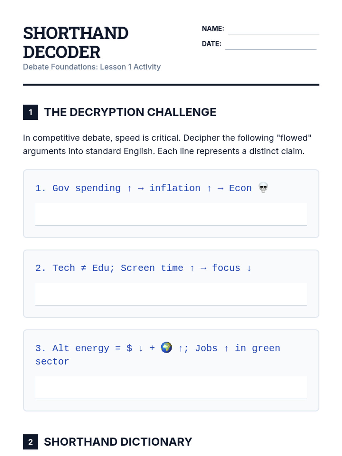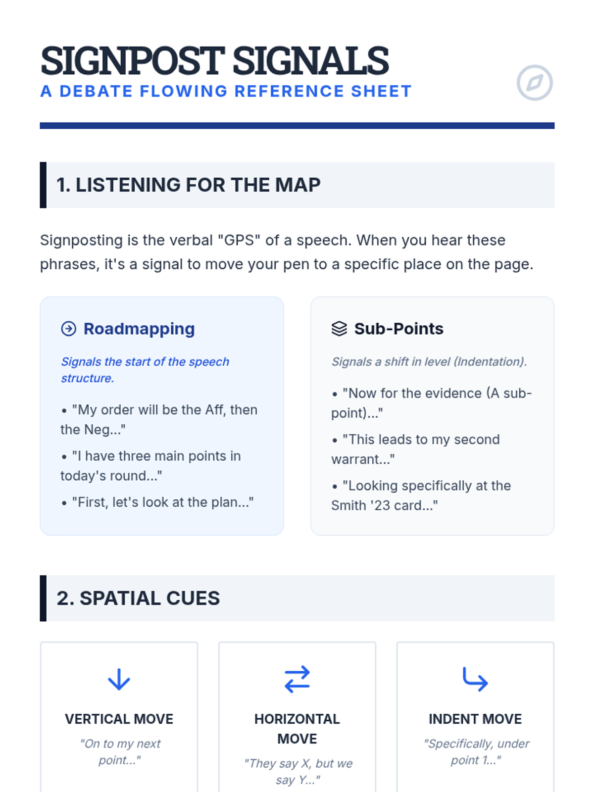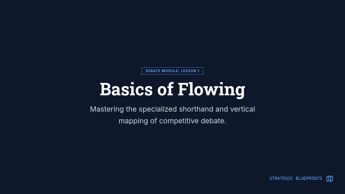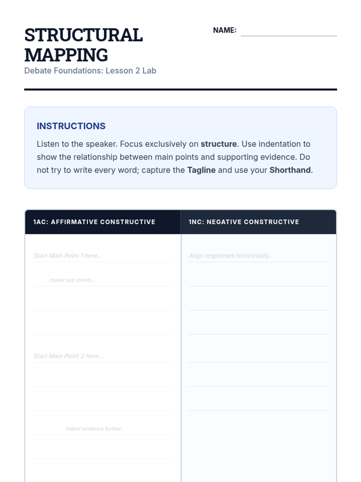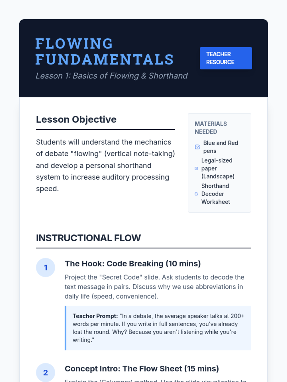 This sequence teaches 10th-grade students the technical skill of 'flowing'—a specialized note-taking method for tracking arguments in debate. Students progress from learning shorthand and basic vertical organization to identifying strategically dropped arguments and executing precise line-by-line refutations.