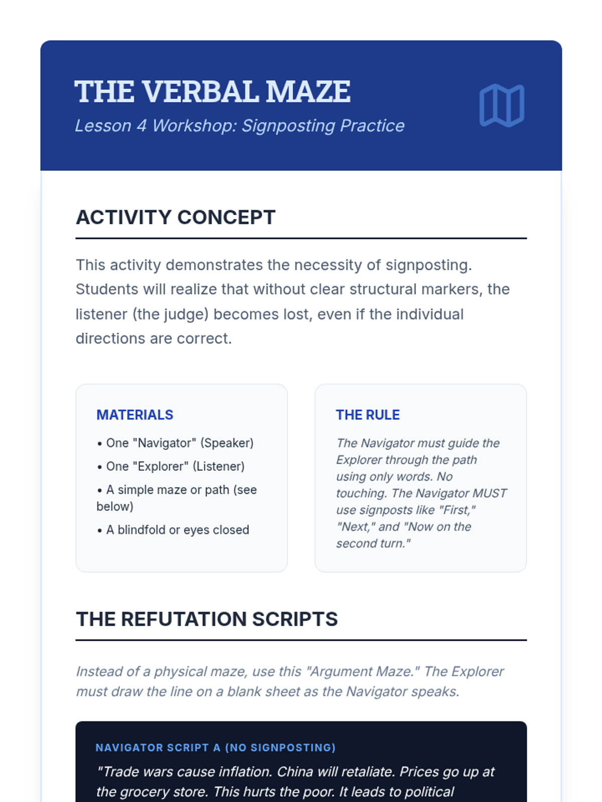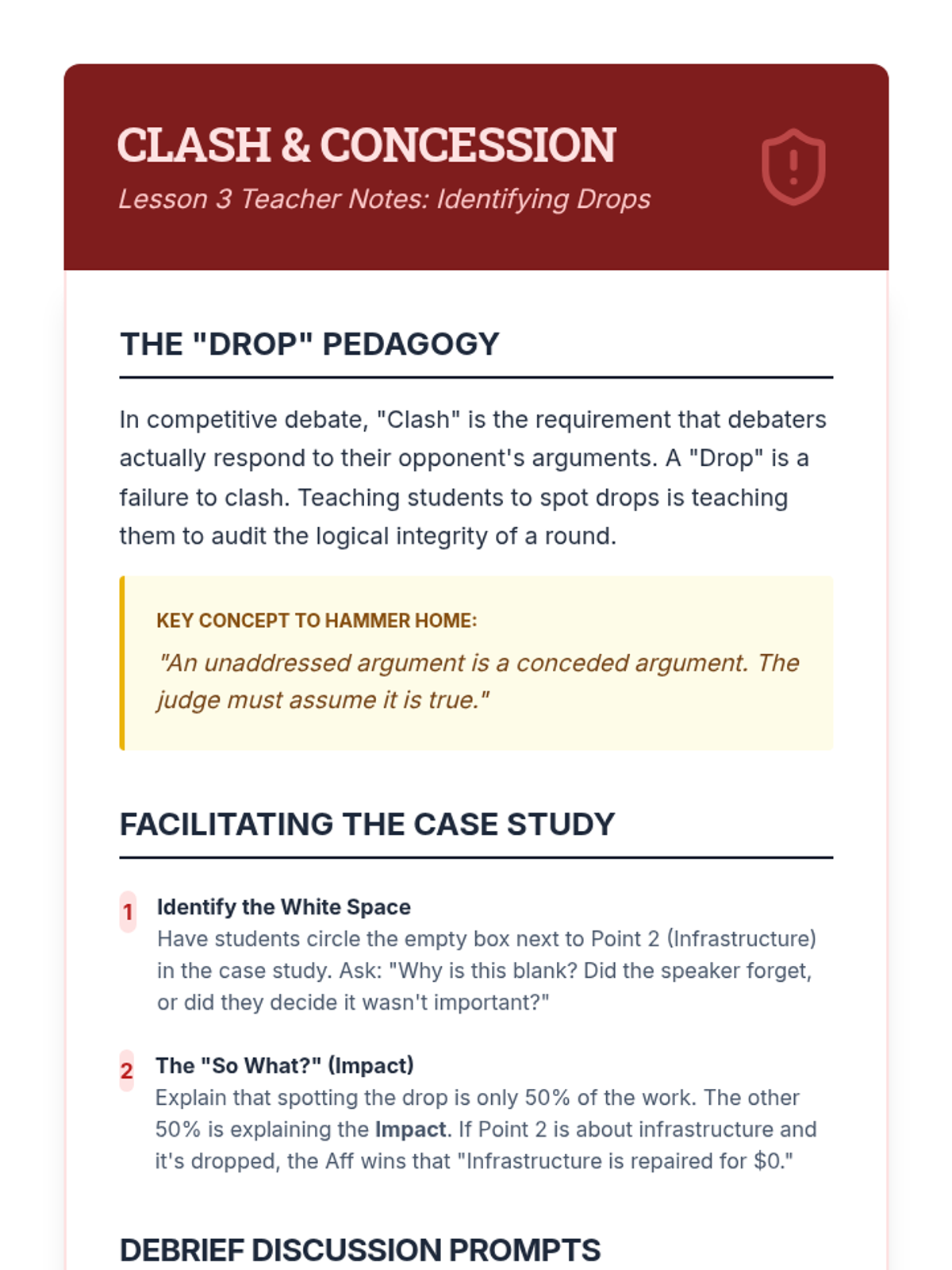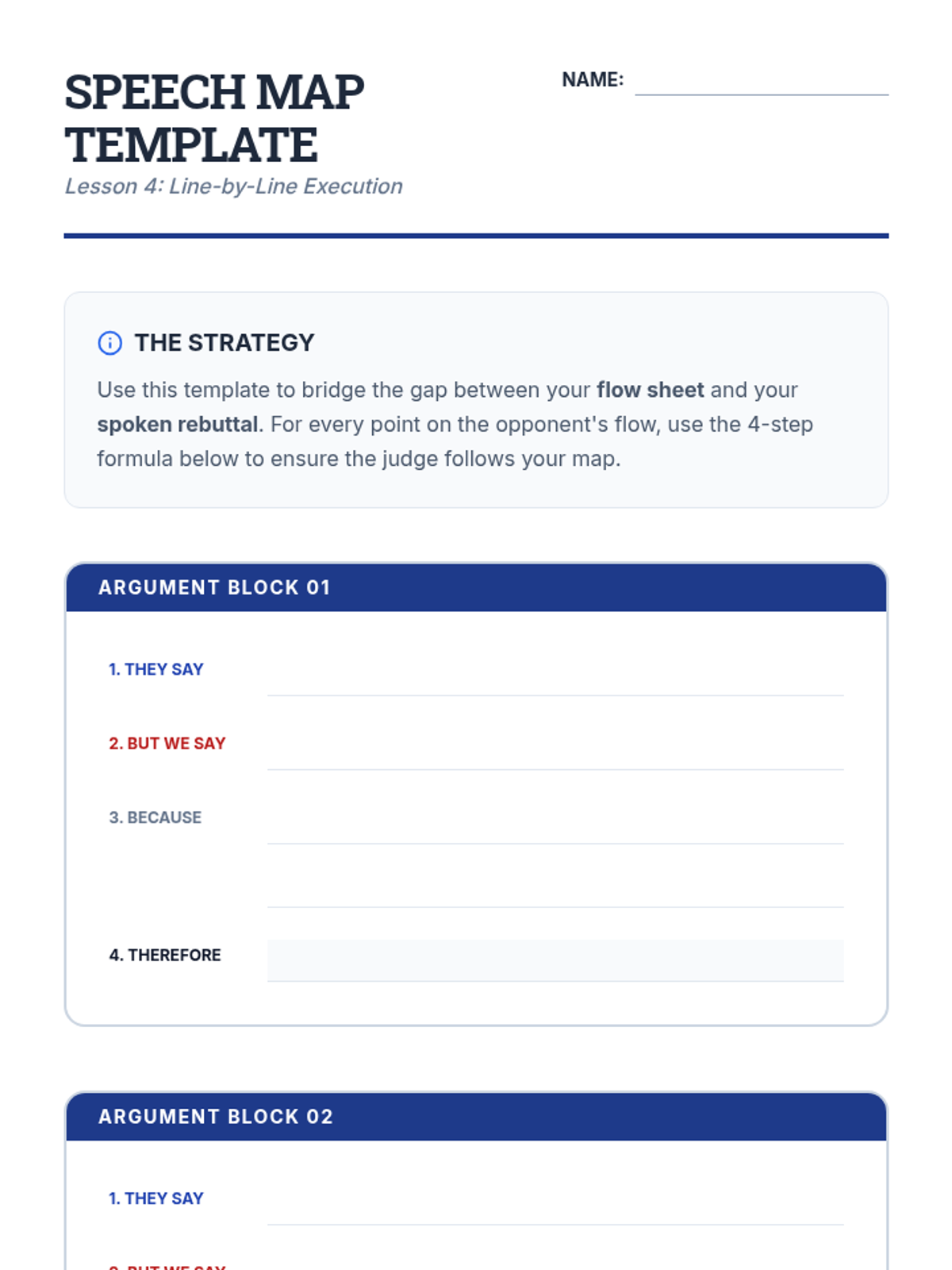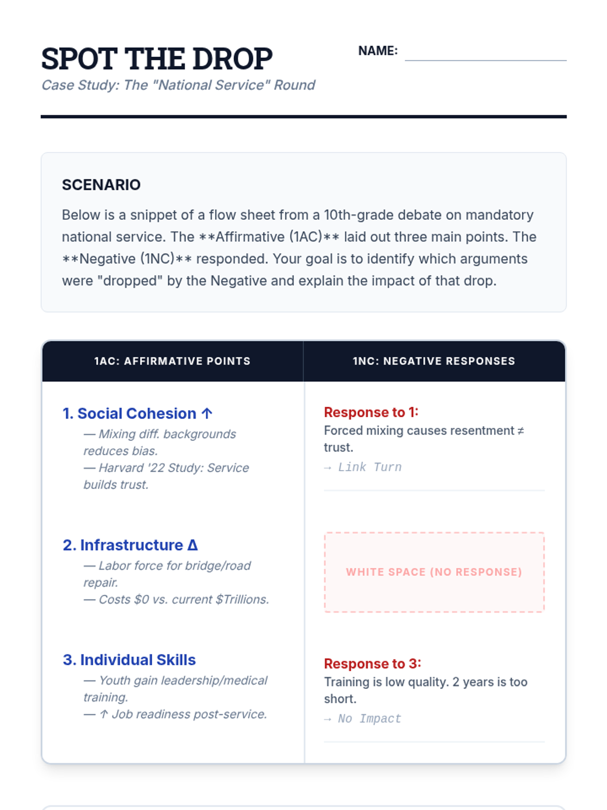 This sequence teaches 10th-grade students the technical skill of 'flowing'—a specialized note-taking method for tracking arguments in debate. Students progress from learning shorthand and basic vertical organization to identifying strategically dropped arguments and executing precise line-by-line refutations.