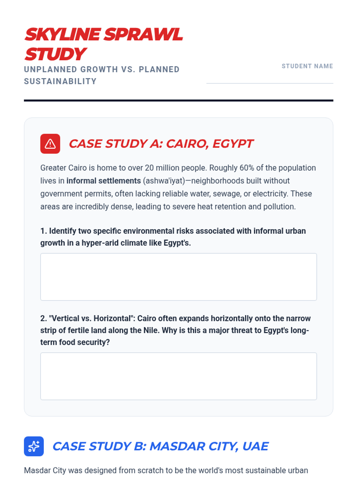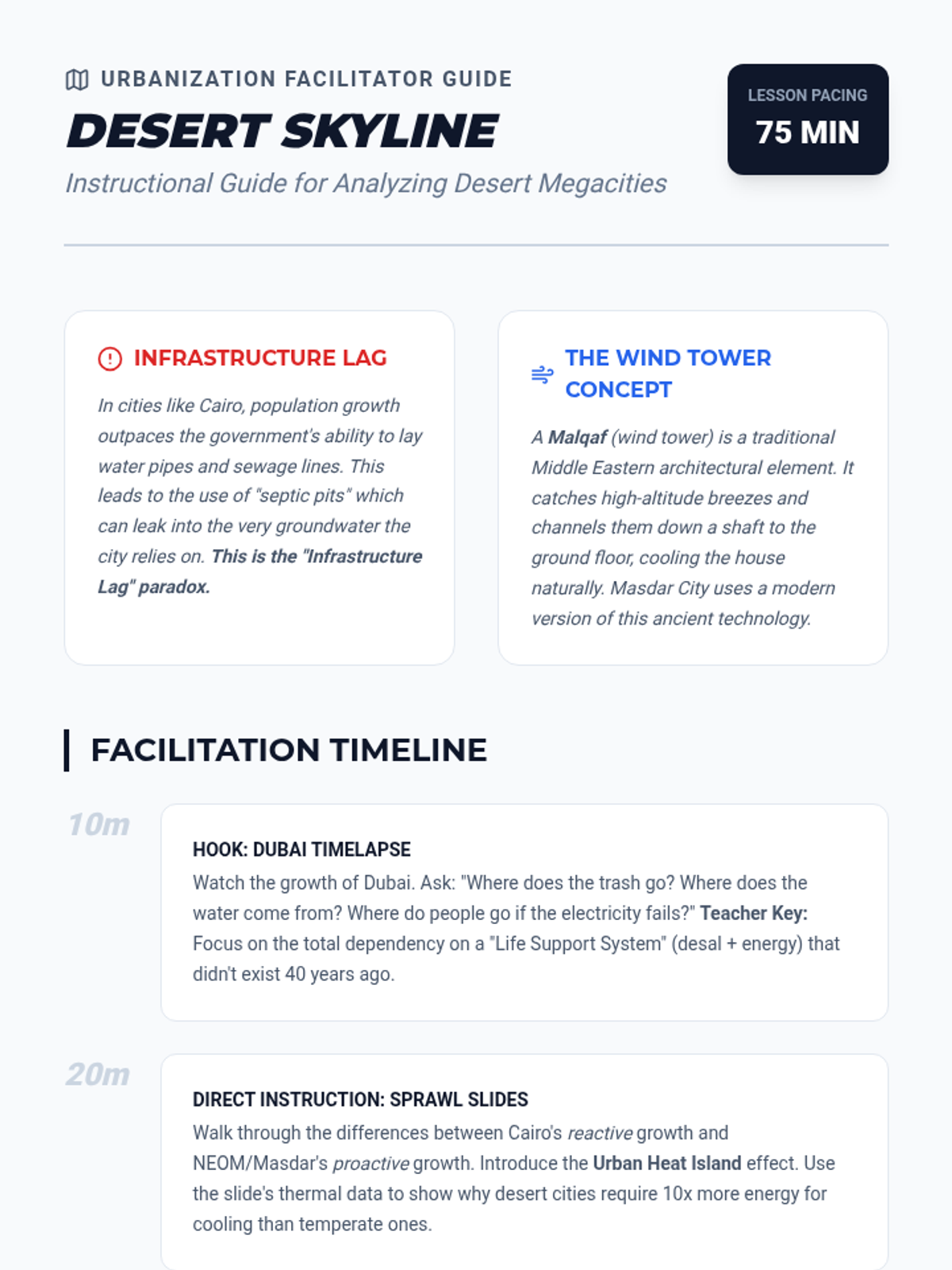 A high school geography sequence exploring the intersection of water scarcity, geopolitics, and urban development in the Middle East. Students investigate natural limits, technological solutions, and sustainable urban design.