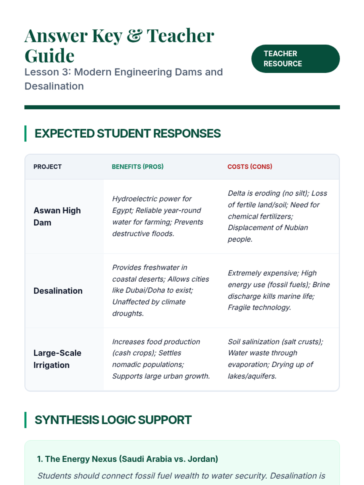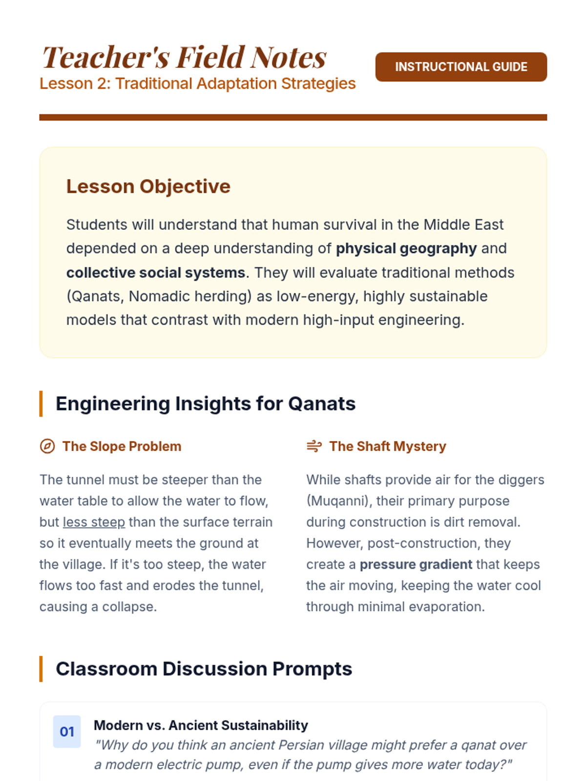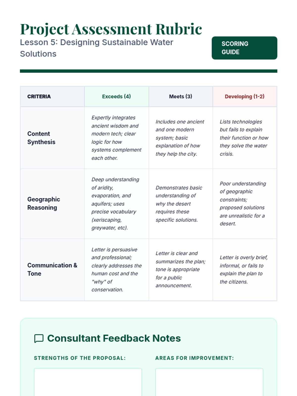 Students investigate the critical challenge of water scarcity in Southwest Asia and North Africa by analyzing physical geography, traditional human innovation, and modern engineering. The sequence culminates in a hydropolitics simulation and a sustainable design project to address the region's environmental constraints.