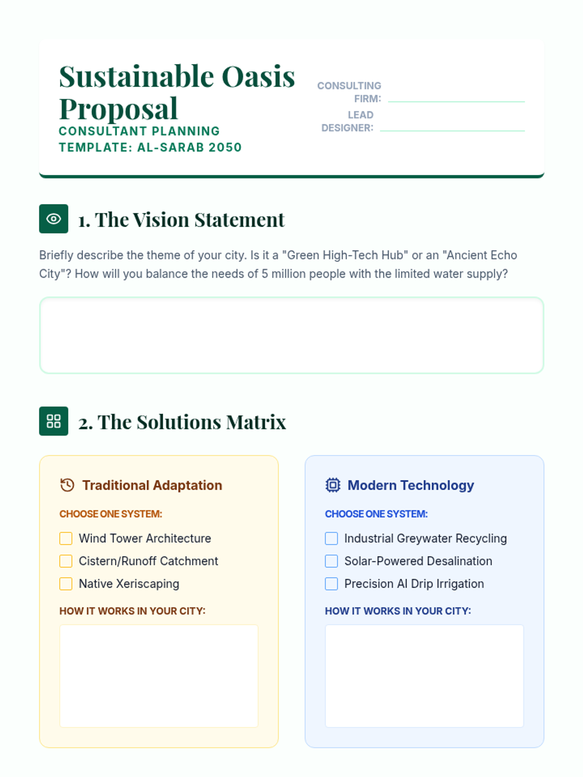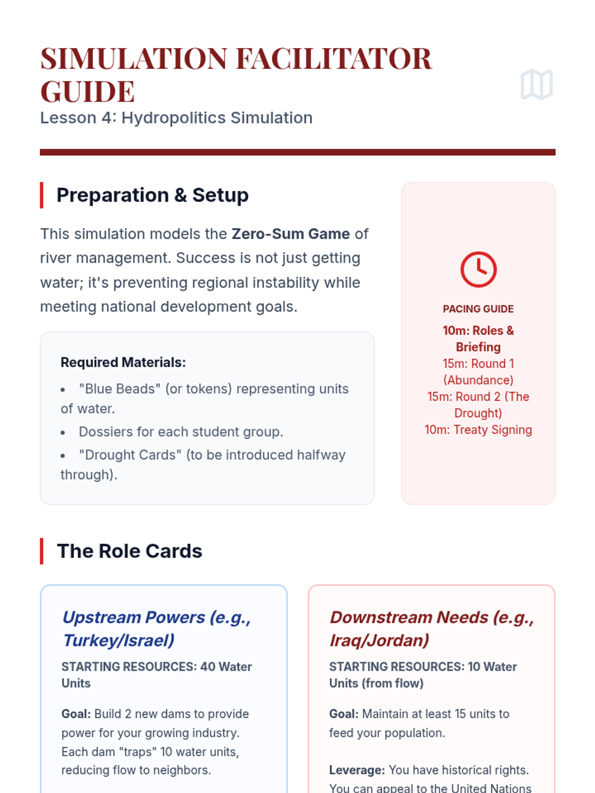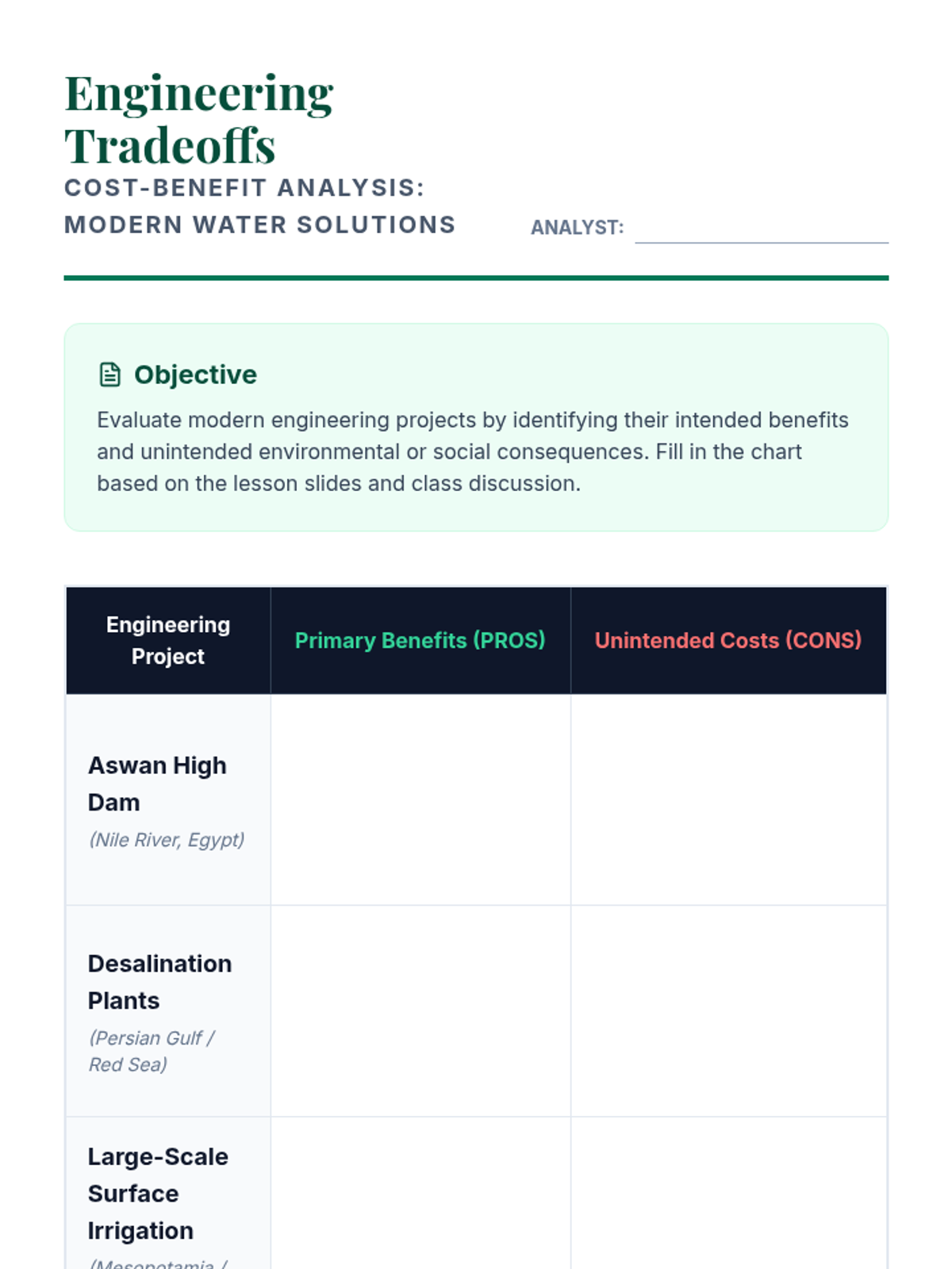 Students investigate the critical challenge of water scarcity in Southwest Asia and North Africa by analyzing physical geography, traditional human innovation, and modern engineering. The sequence culminates in a hydropolitics simulation and a sustainable design project to address the region's environmental constraints.