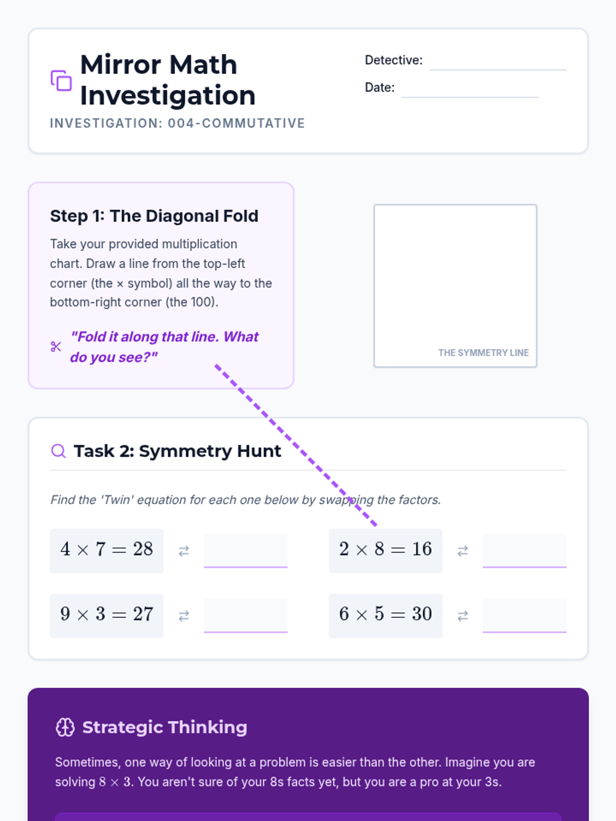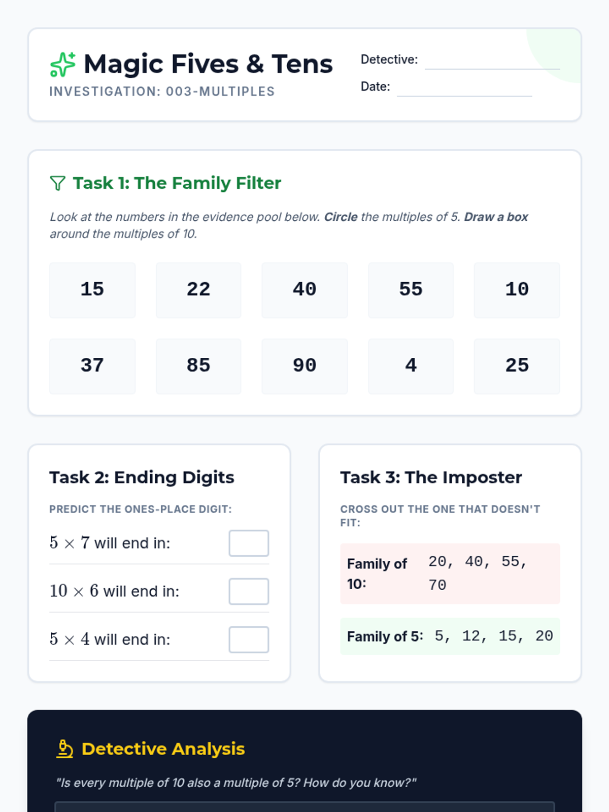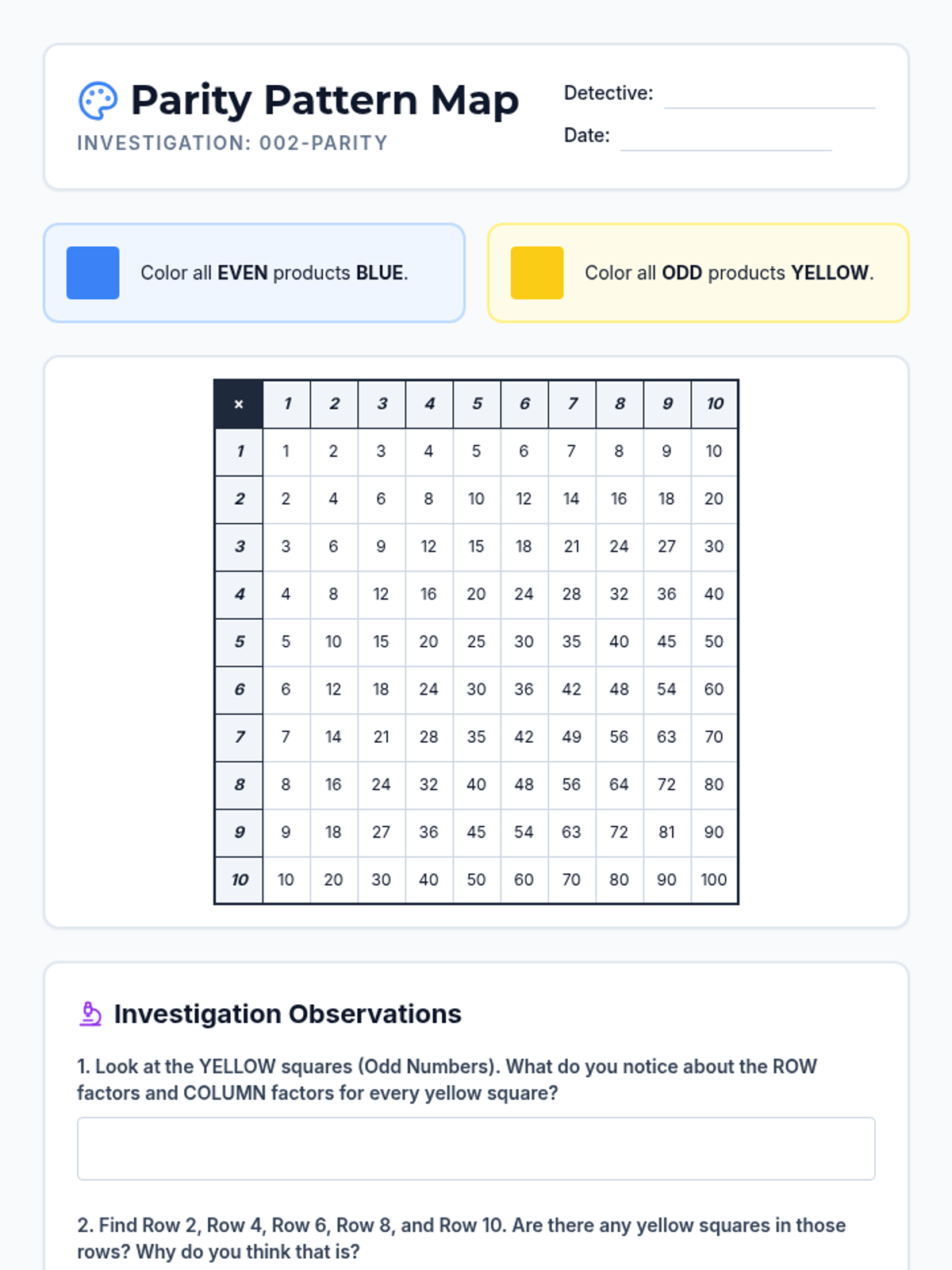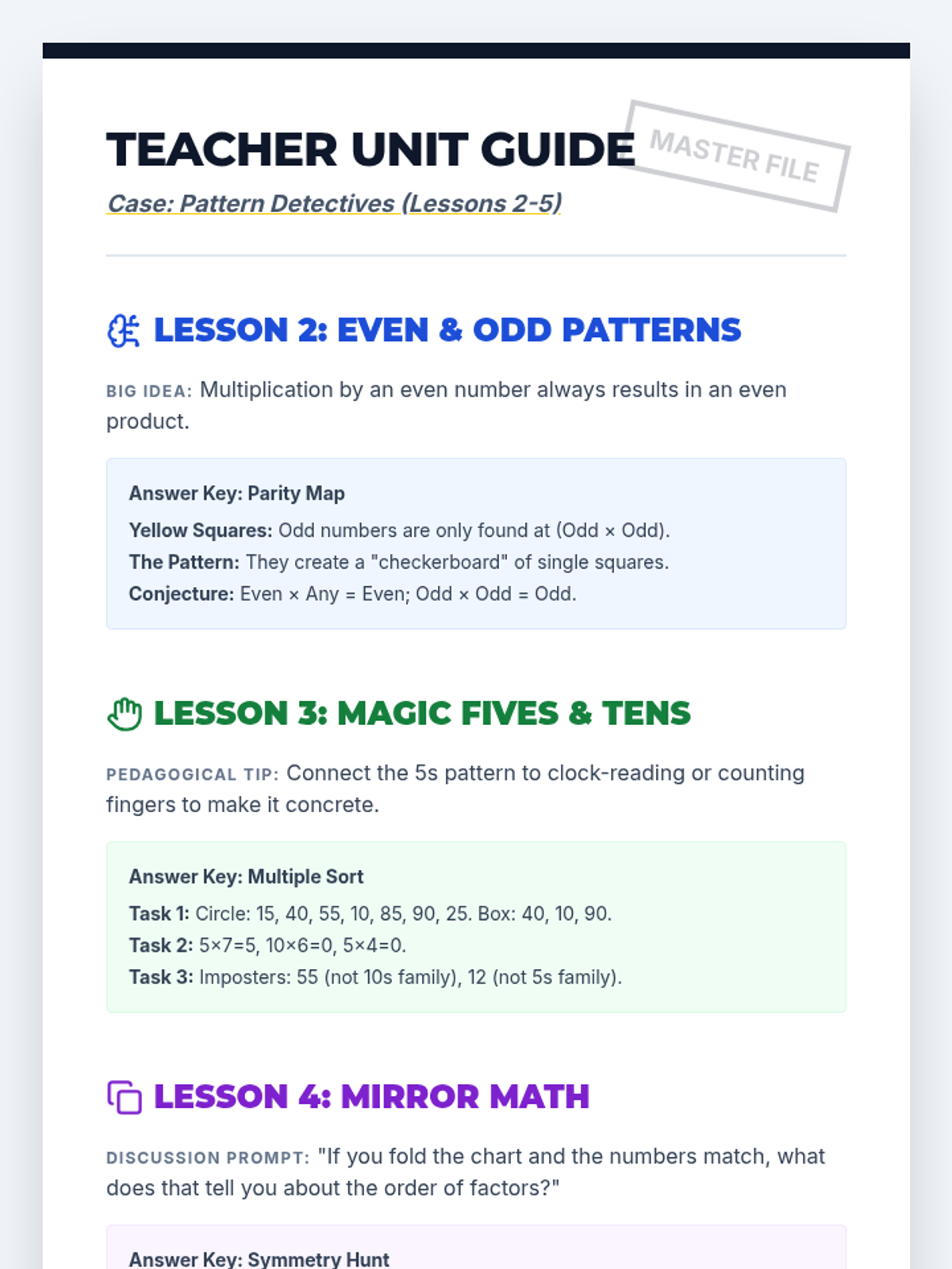 A 5-lesson inquiry-based unit where 3rd-grade students investigate the hidden rules and patterns within multiplication tables, including parity, specific multiples, and the commutative property.