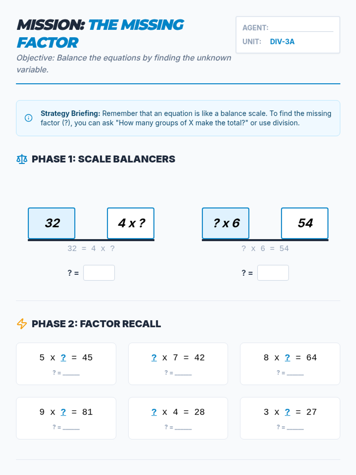 This sequence utilizes base-ten blocks and area models to scaffold multi-digit multiplication and division, providing a visual and tactile framework for students who struggle with standard algorithms. By connecting physical area models to expanded form and eventually the standard algorithm, students build a conceptual foundation that supports future algebraic learning.