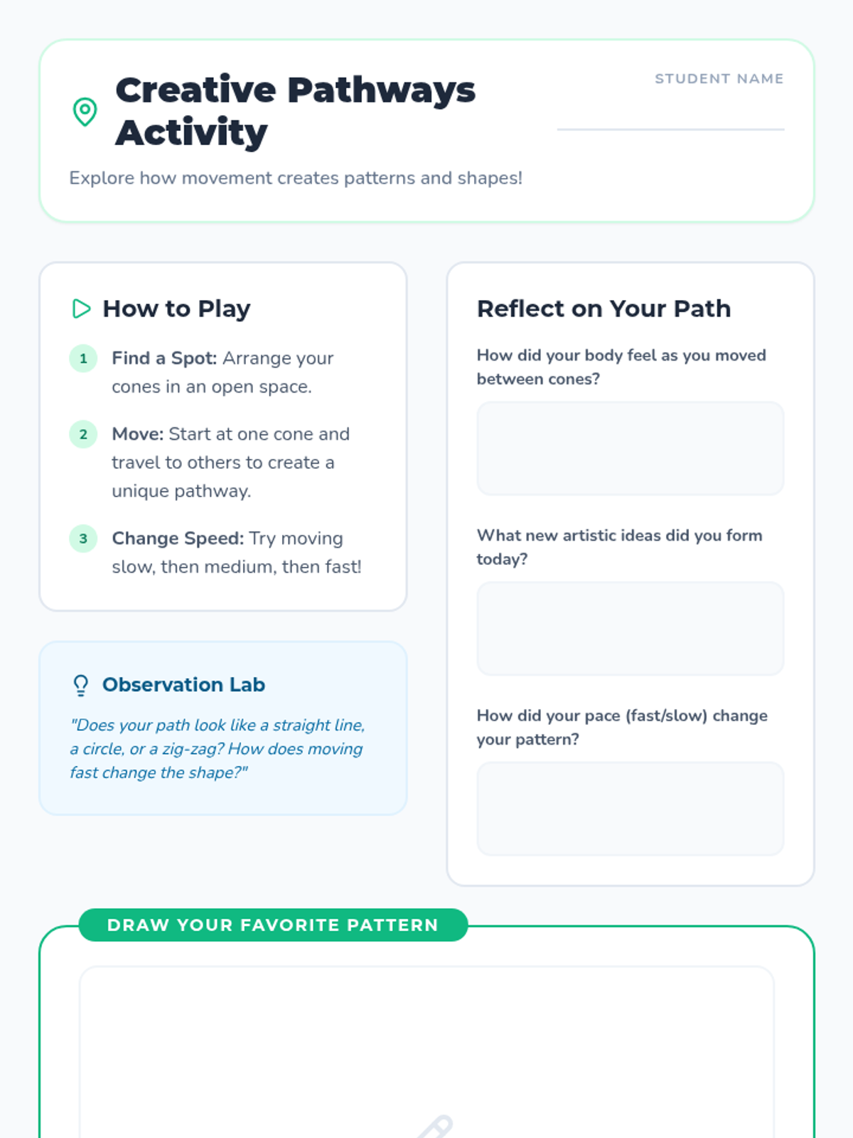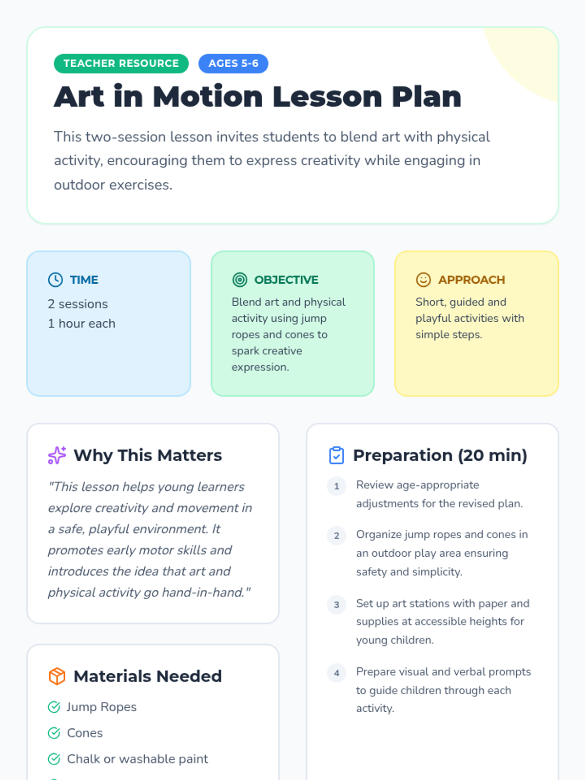 A two-session sequence for 5-6 year olds that blends physical activity with artistic expression using jump ropes and cones to foster motor skills and creativity.