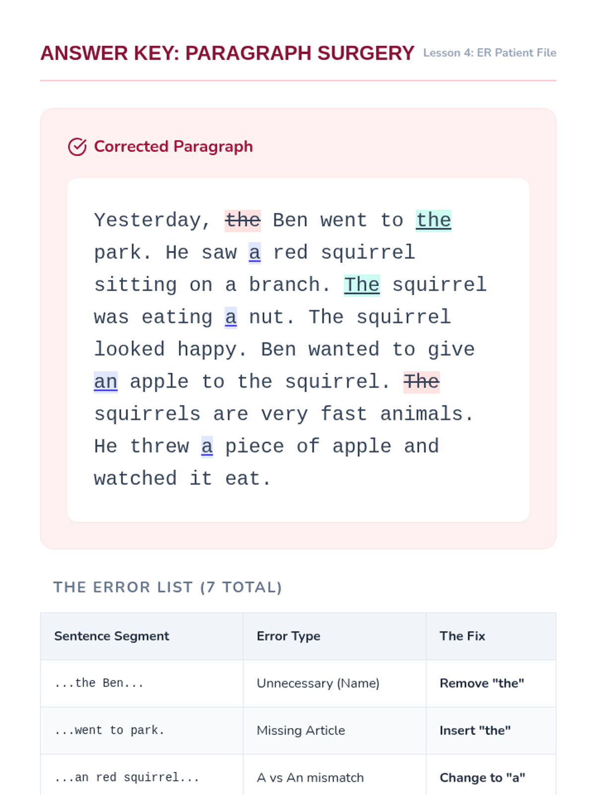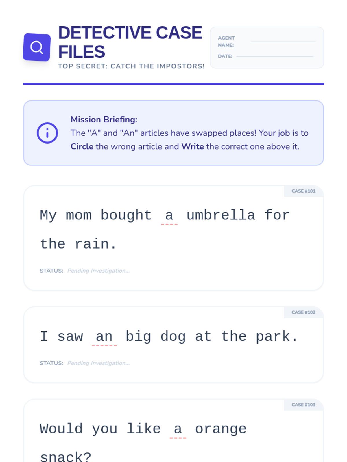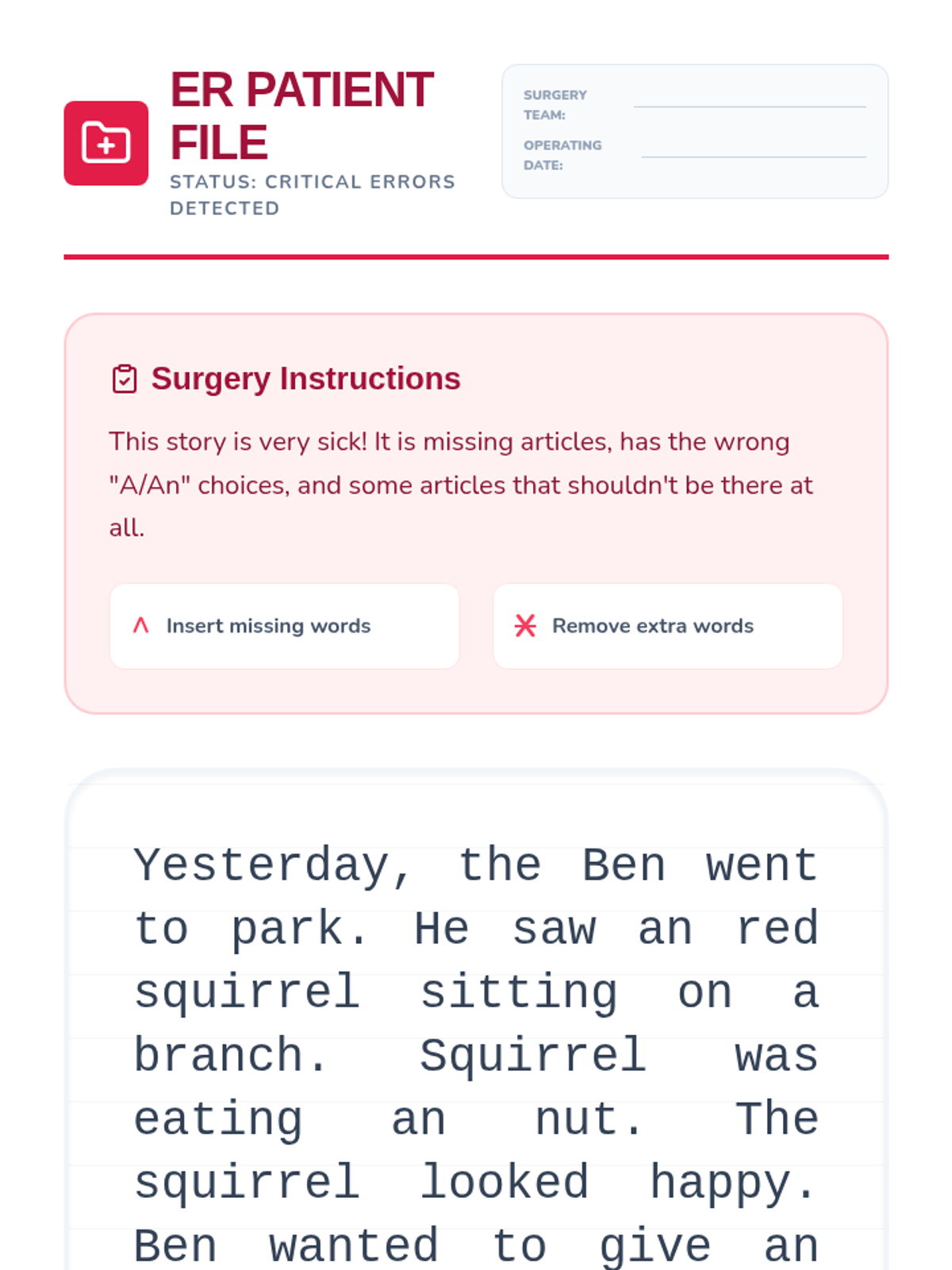 A 2nd-grade mastery-based sequence where students act as 'Grammar Doctors' to diagnose and treat article errors (a, an, the). Students progress from fixing missing articles to full paragraph surgery and creating their own reference guides.
