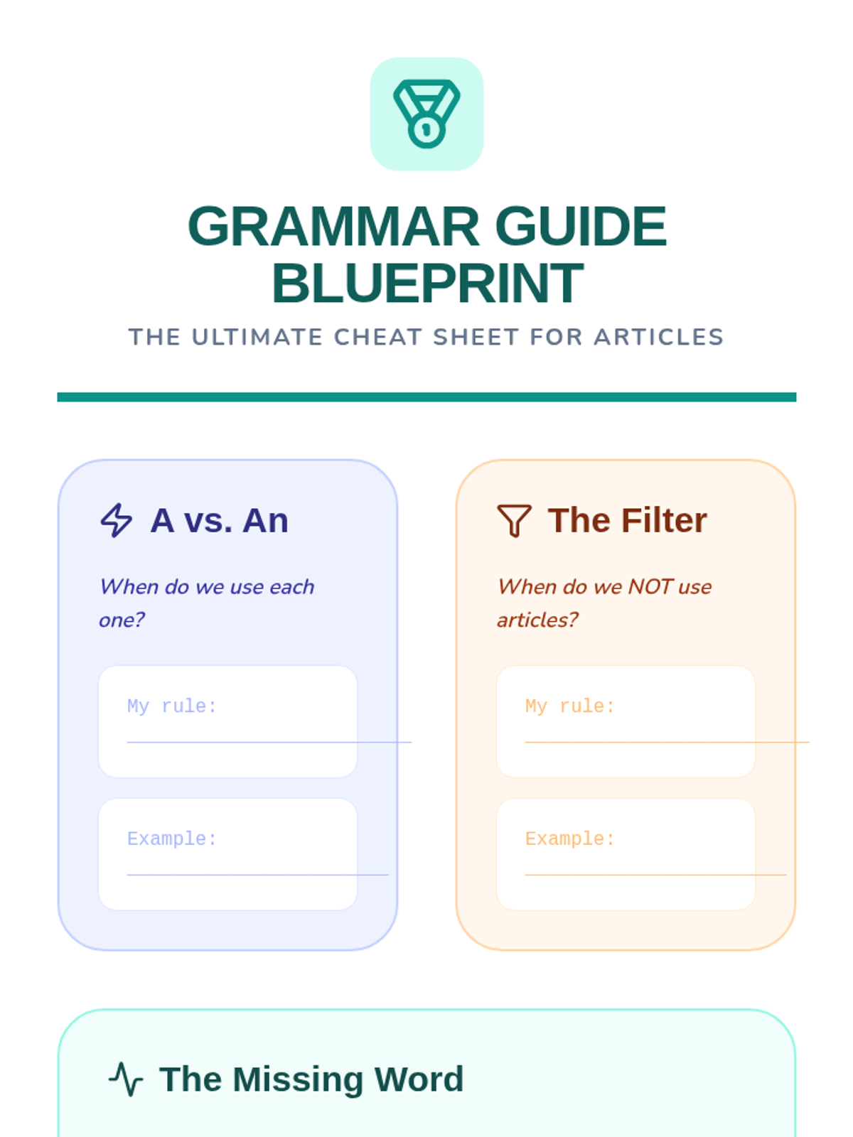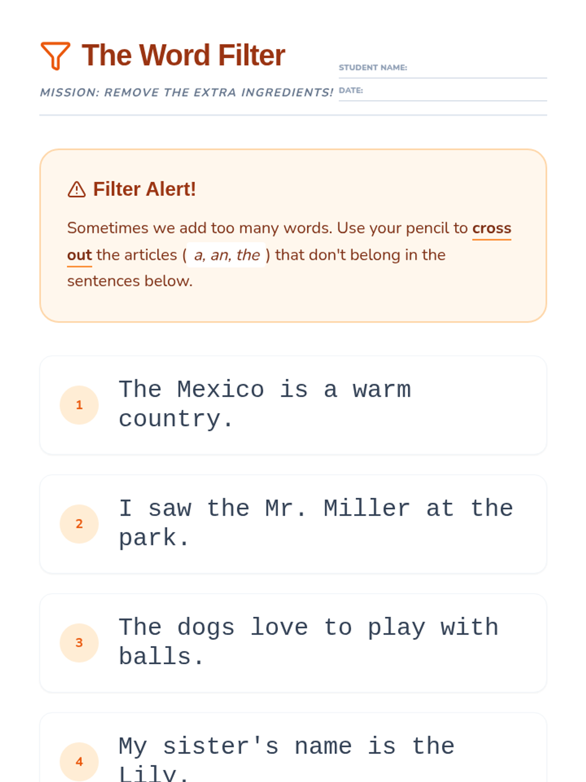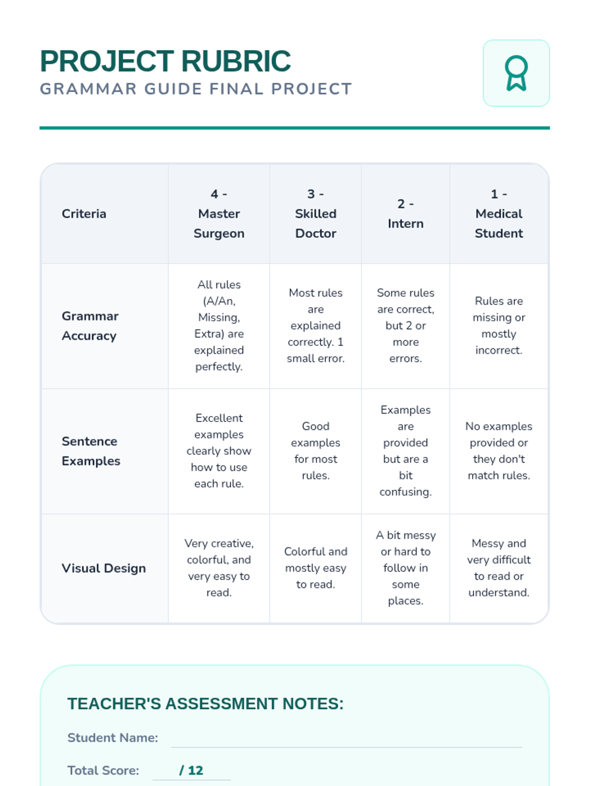 A 2nd-grade mastery-based sequence where students act as 'Grammar Doctors' to diagnose and treat article errors (a, an, the). Students progress from fixing missing articles to full paragraph surgery and creating their own reference guides.