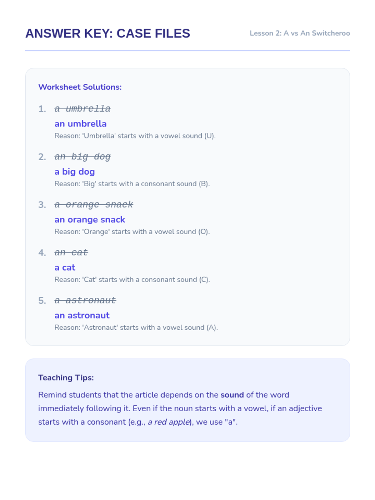 A comprehensive 2nd Grade sequence focusing on the phonetic rules of indefinite articles 'a' and 'an'. Students progress from phonemic awareness of initial sounds to applying article rules in complex sentences with adjectives.