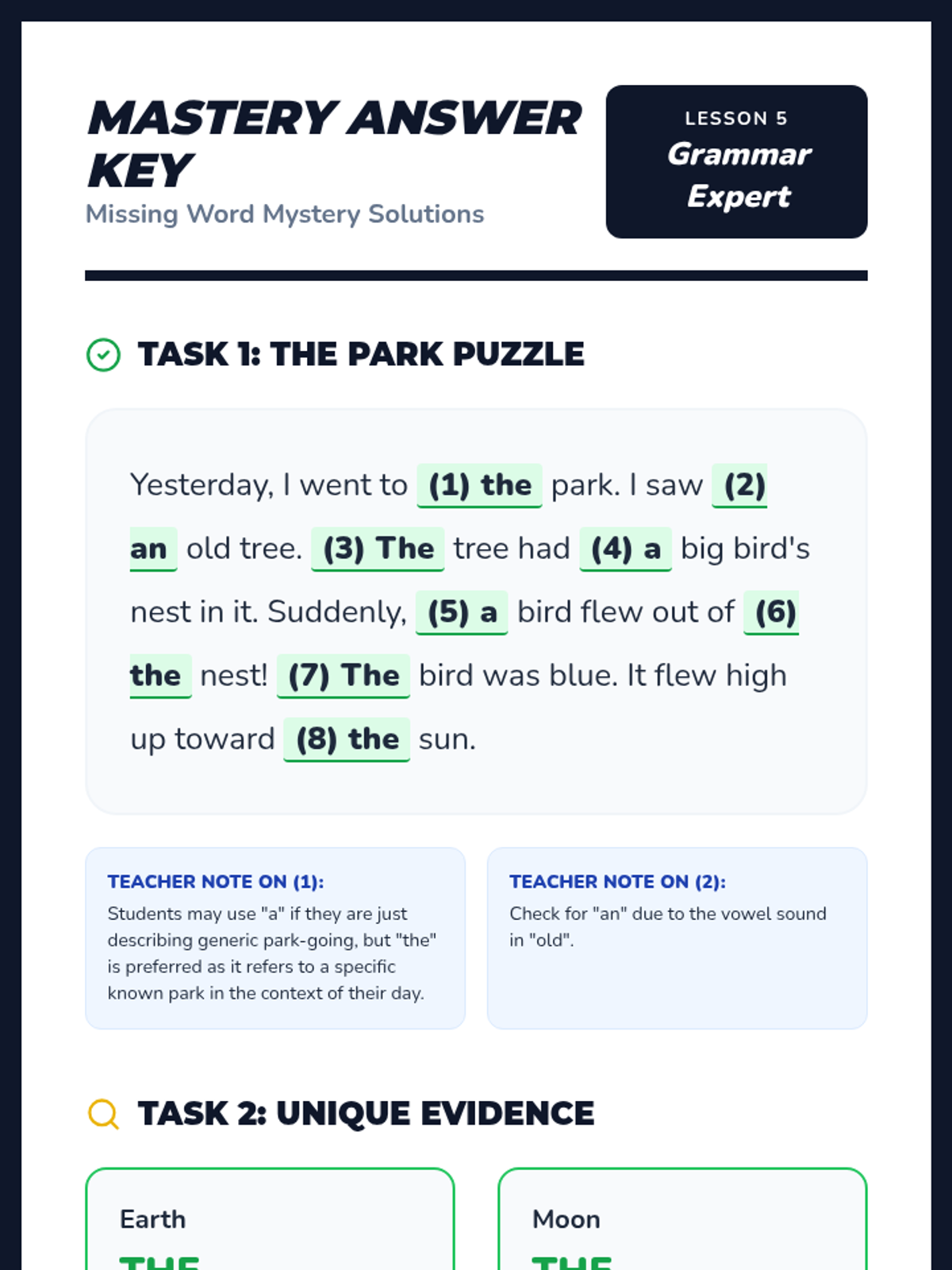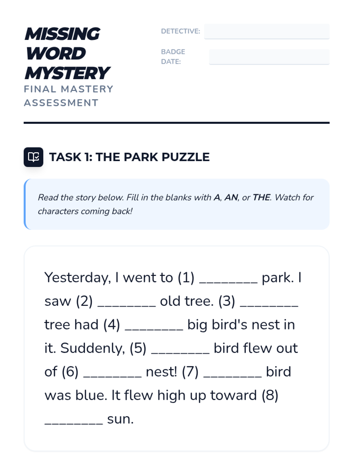 A foundational grammar sequence for first graders that uses a 'Word Detective' theme to explore adjectives through sensory exploration, sorting, and descriptive writing. Students learn to use their five senses to identify and apply adjectives to describe the world around them.