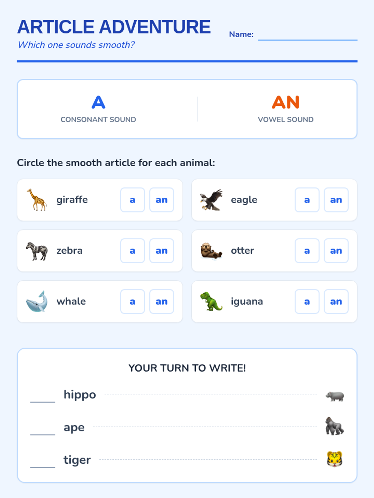 A comprehensive 1st Grade ELA sequence focusing on the phonemic awareness and grammar rules for using indefinite articles 'a' and 'an' through a fun zoo-themed narrative.