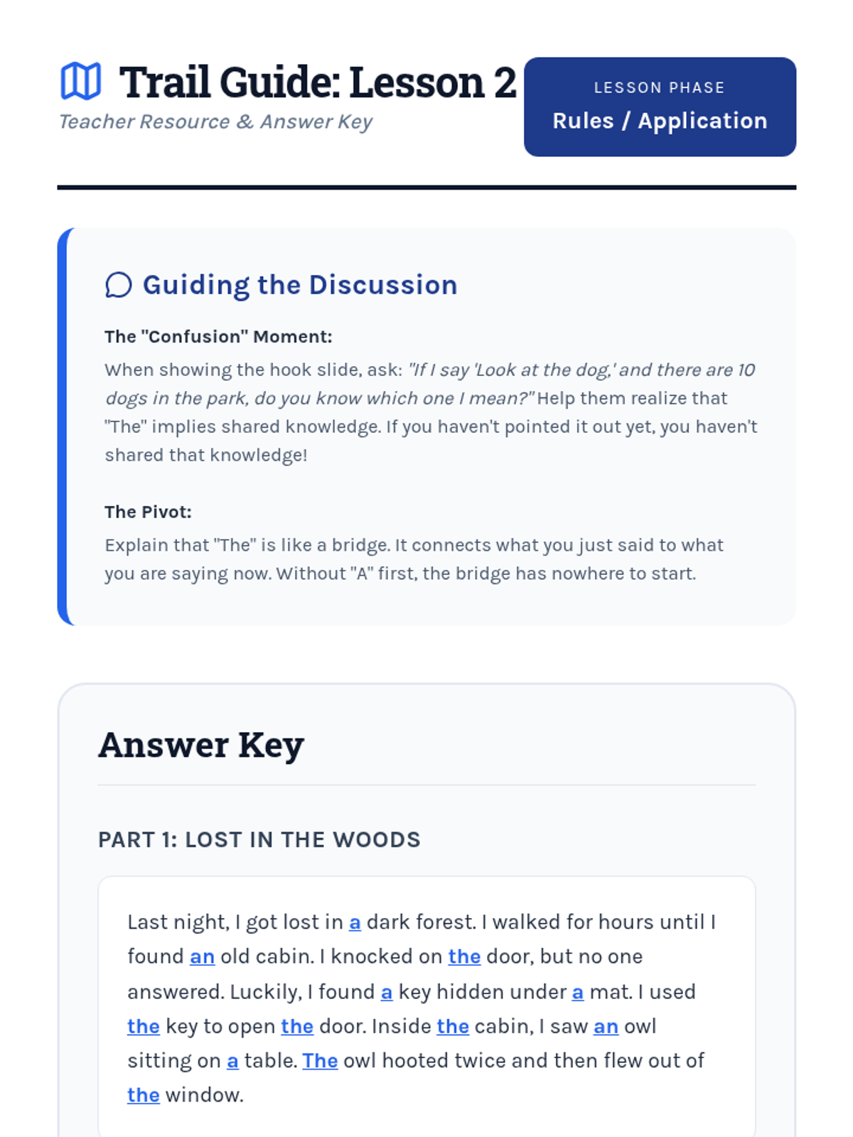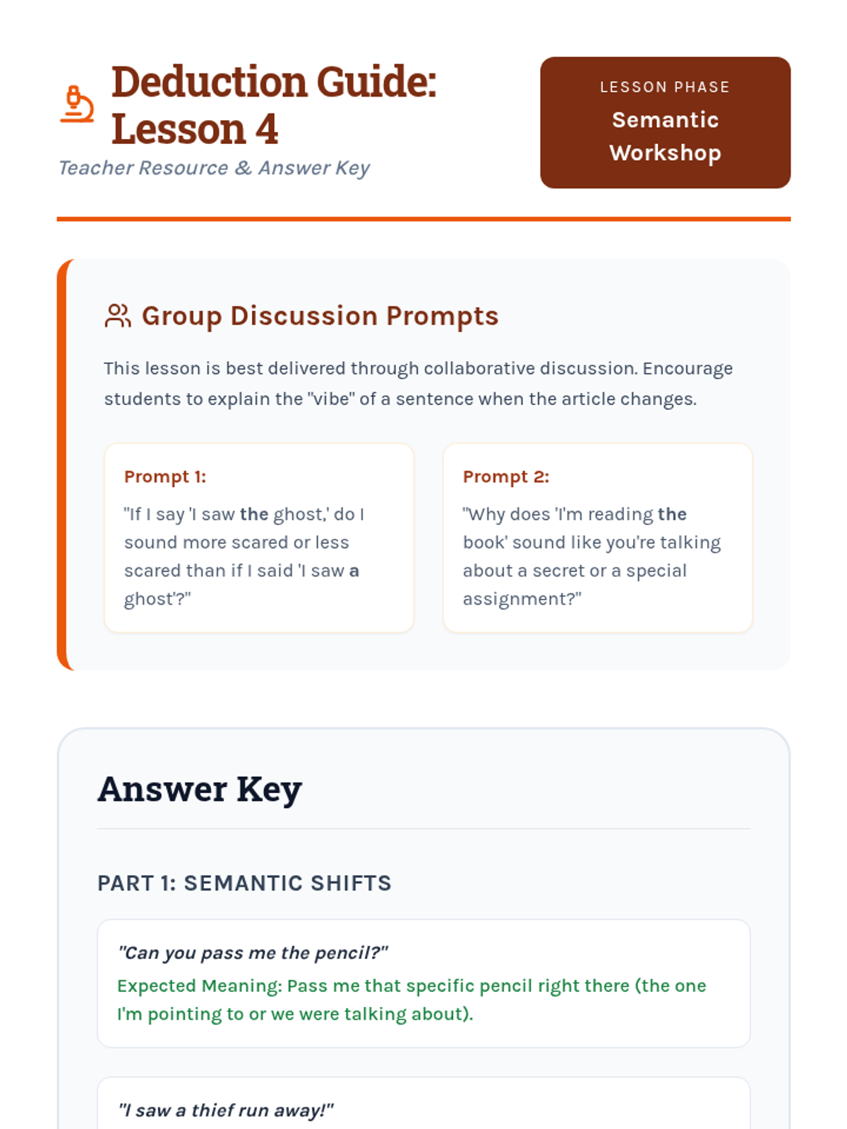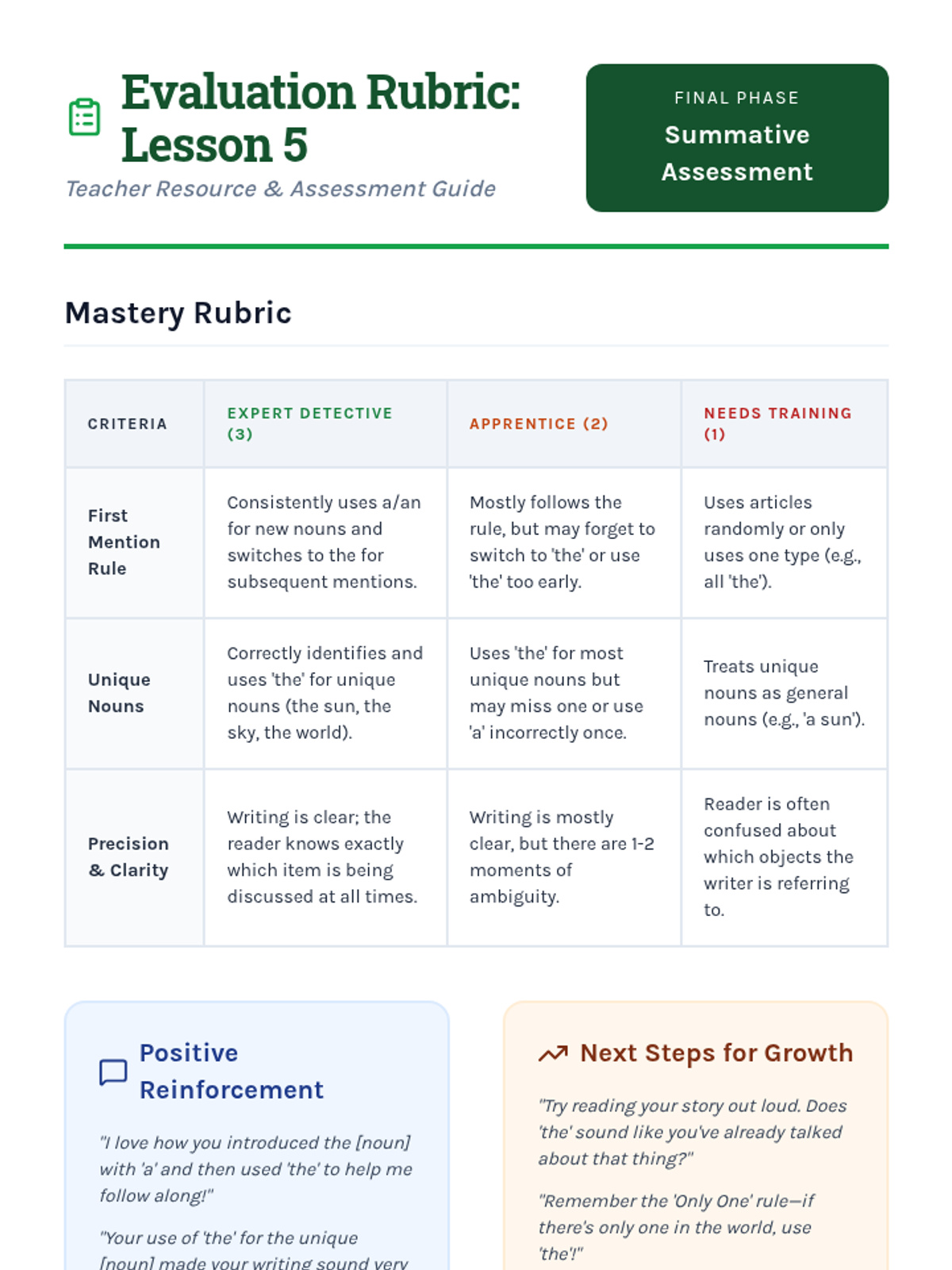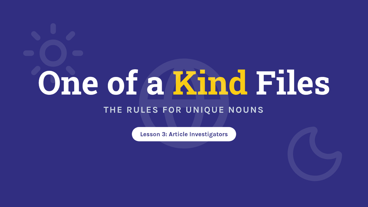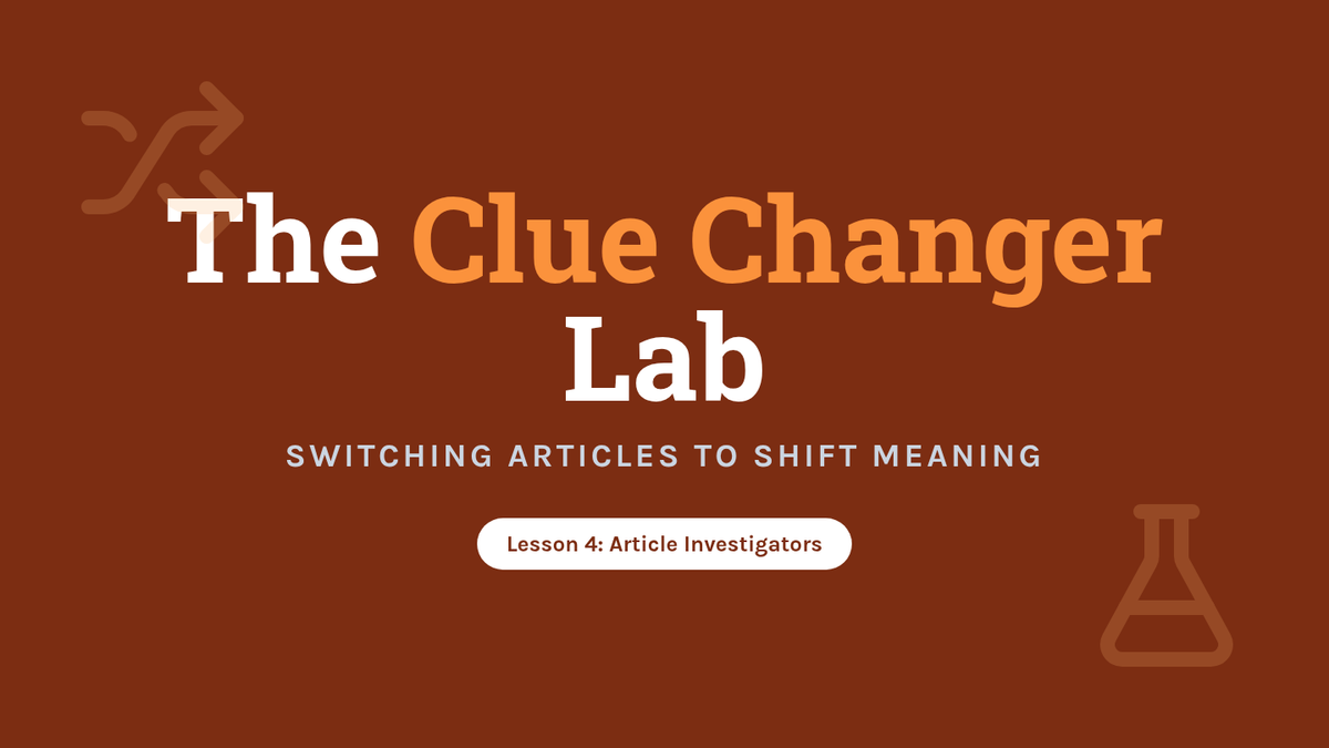 This inquiry-based sequence for 3rd graders explores the semantic differences between definite ('the') and indefinite ('a/an') articles through a detective-themed investigation. Students progress from basic identification to understanding complex rules like the first-mention rule and unique noun usage in narrative writing.