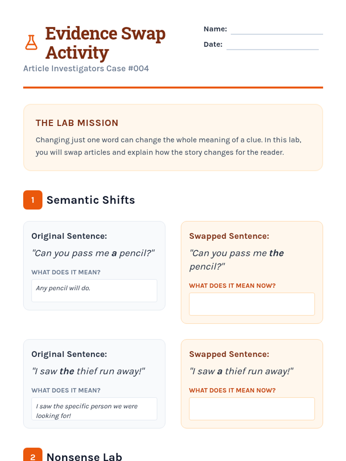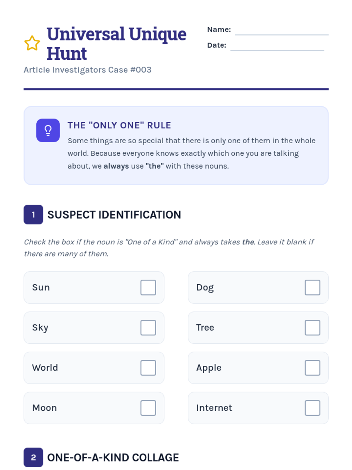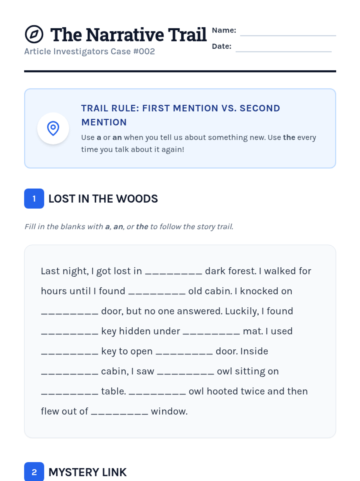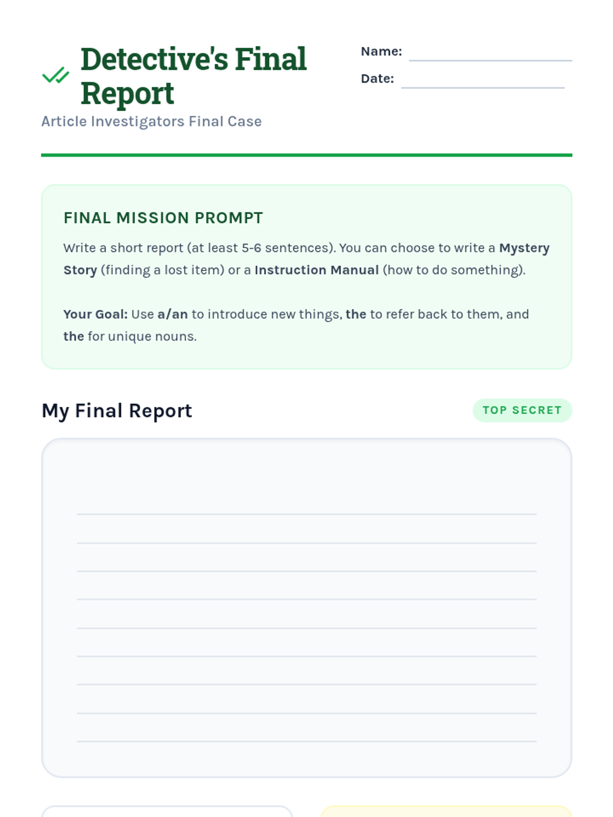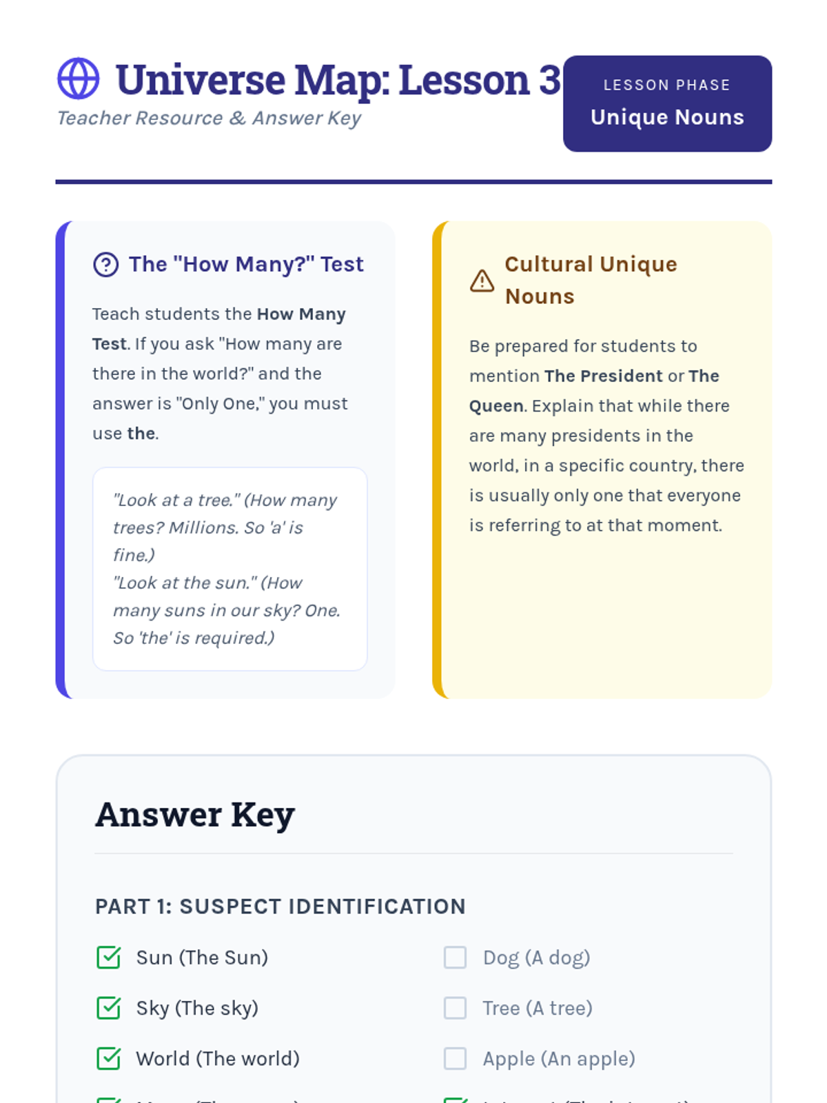 This inquiry-based sequence for 3rd graders explores the semantic differences between definite ('the') and indefinite ('a/an') articles through a detective-themed investigation. Students progress from basic identification to understanding complex rules like the first-mention rule and unique noun usage in narrative writing.