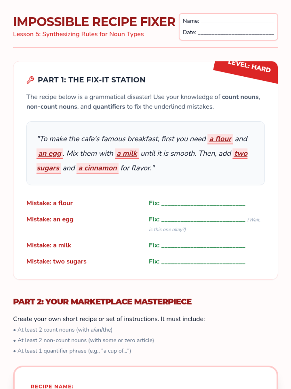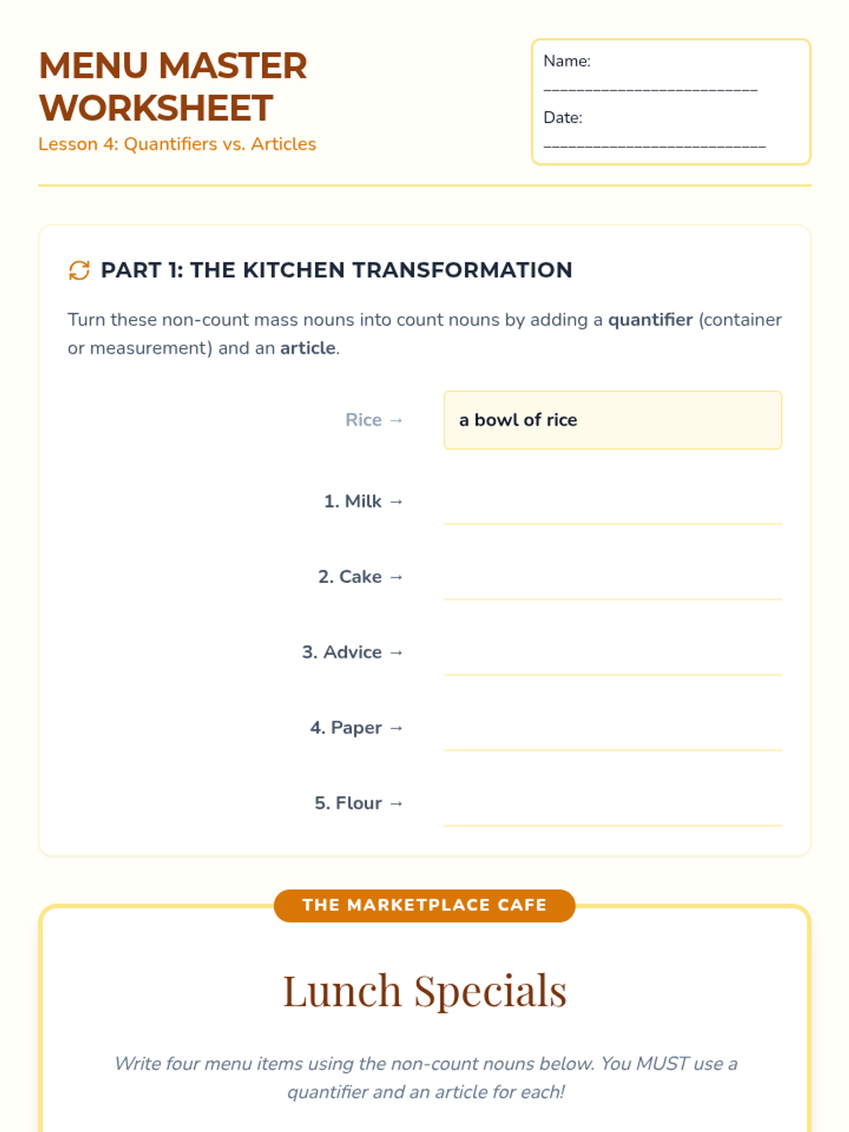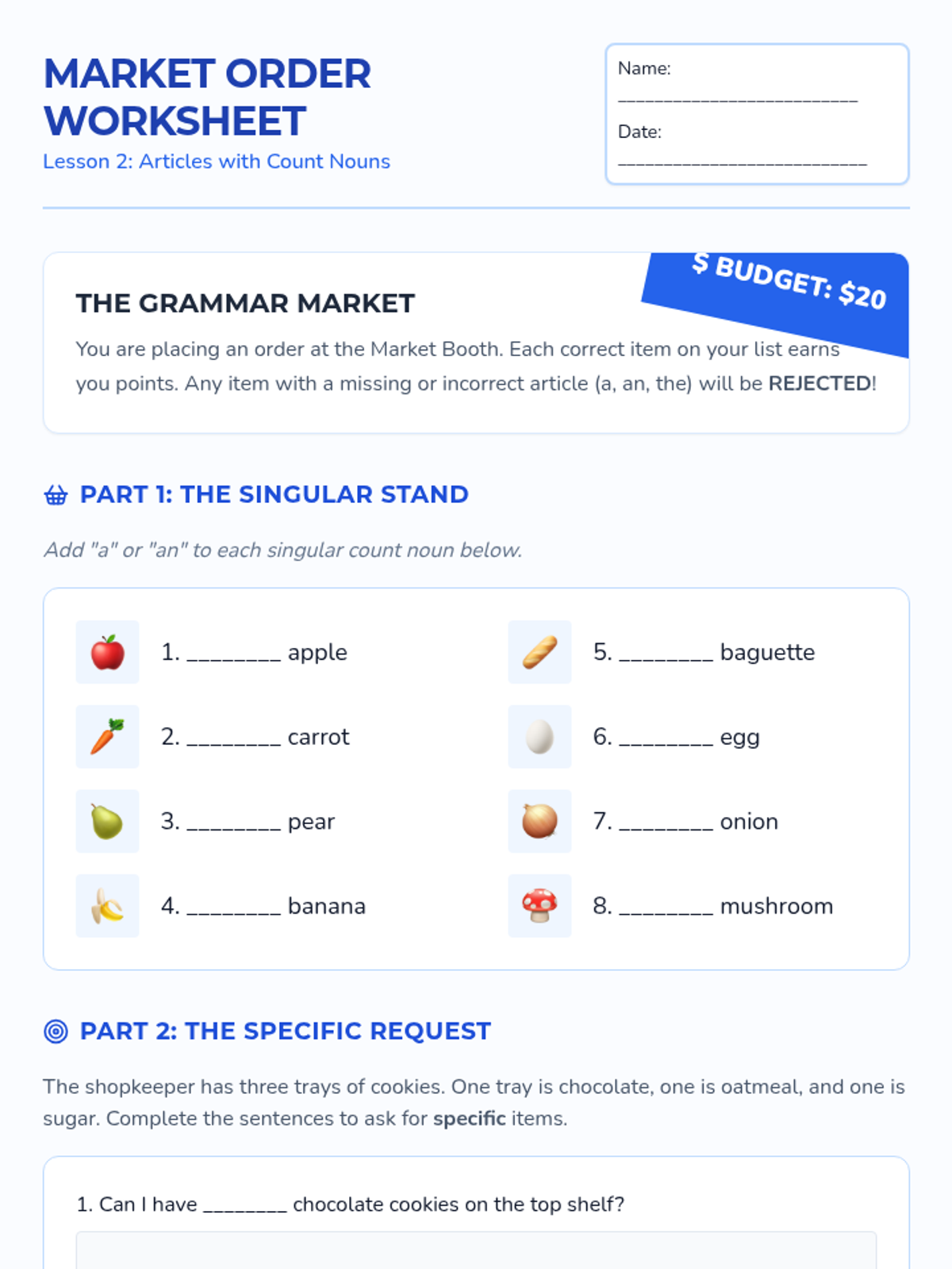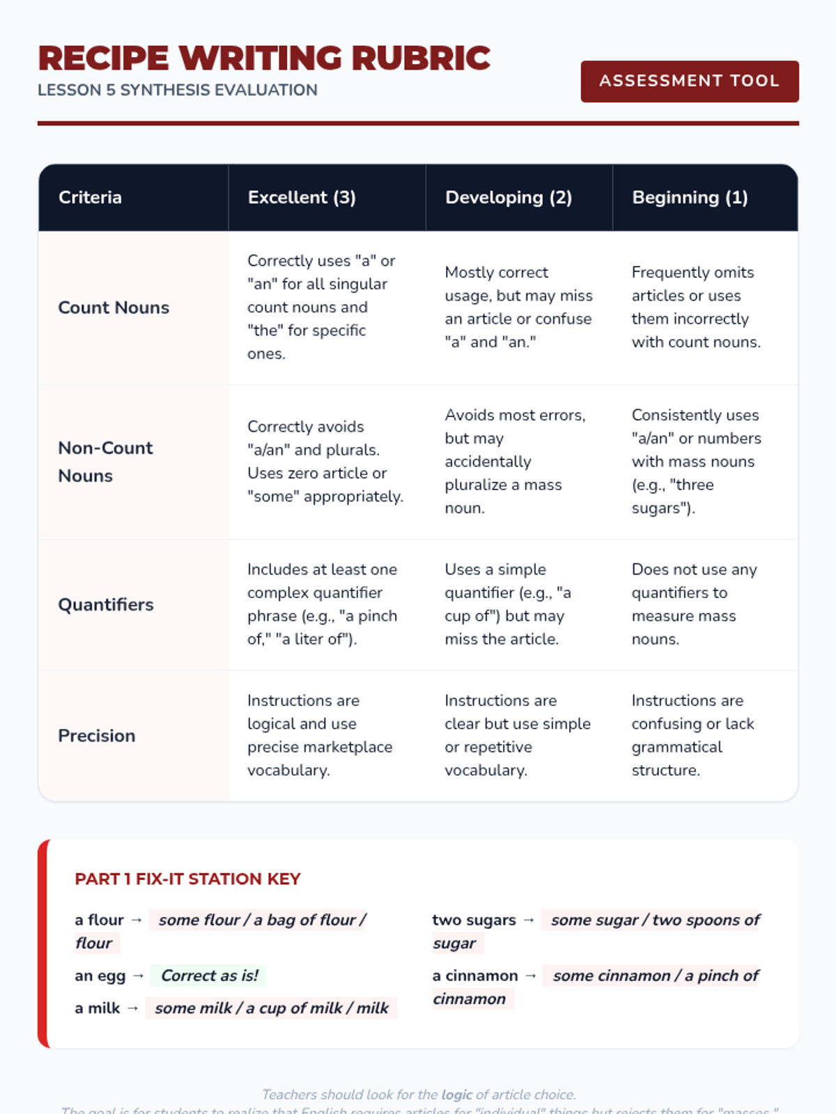 This sequence teaches 4th-grade students how to distinguish between count and non-count nouns and apply correct article rules. Through a 'Marketplace' theme, students move from basic categorization to mastering quantifiers and synthesizing rules in procedural writing.