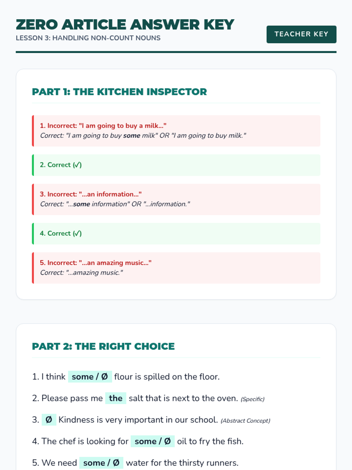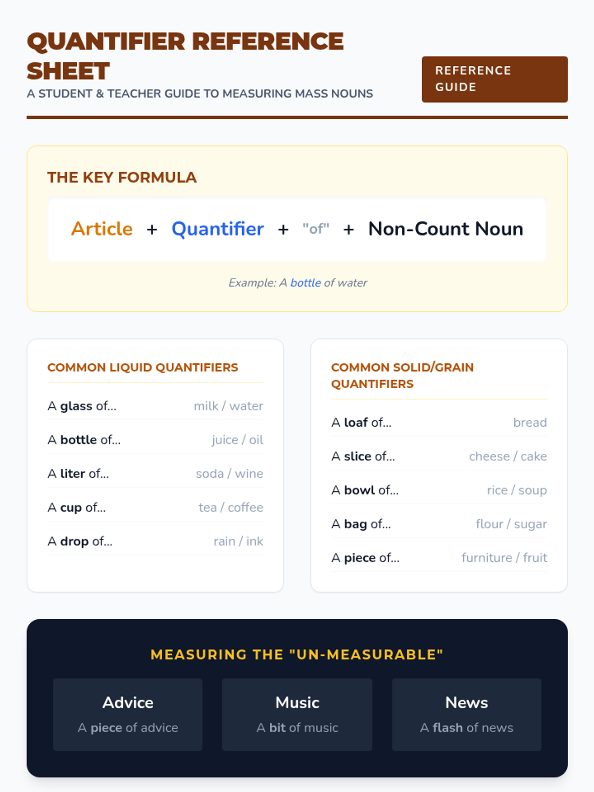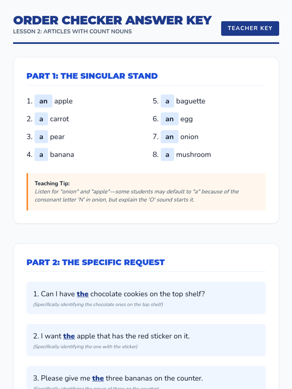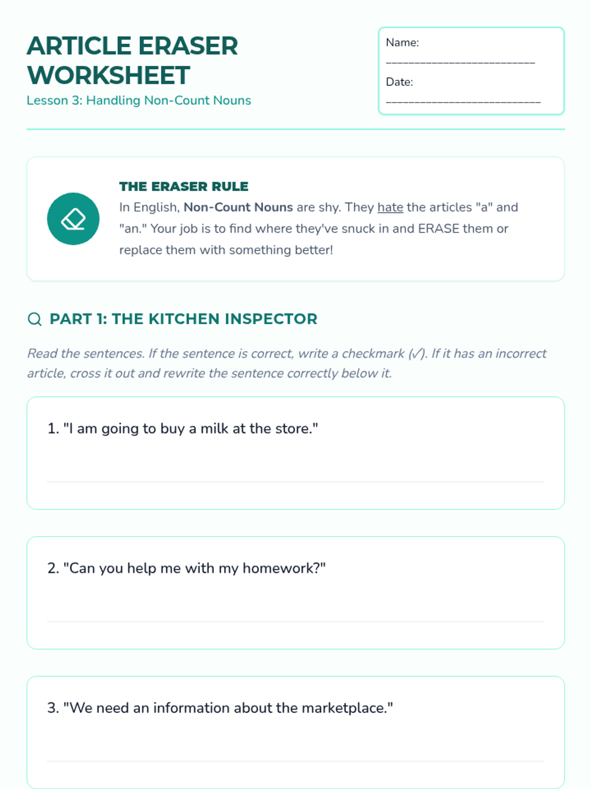 This sequence teaches 4th-grade students how to distinguish between count and non-count nouns and apply correct article rules. Through a 'Marketplace' theme, students move from basic categorization to mastering quantifiers and synthesizing rules in procedural writing.