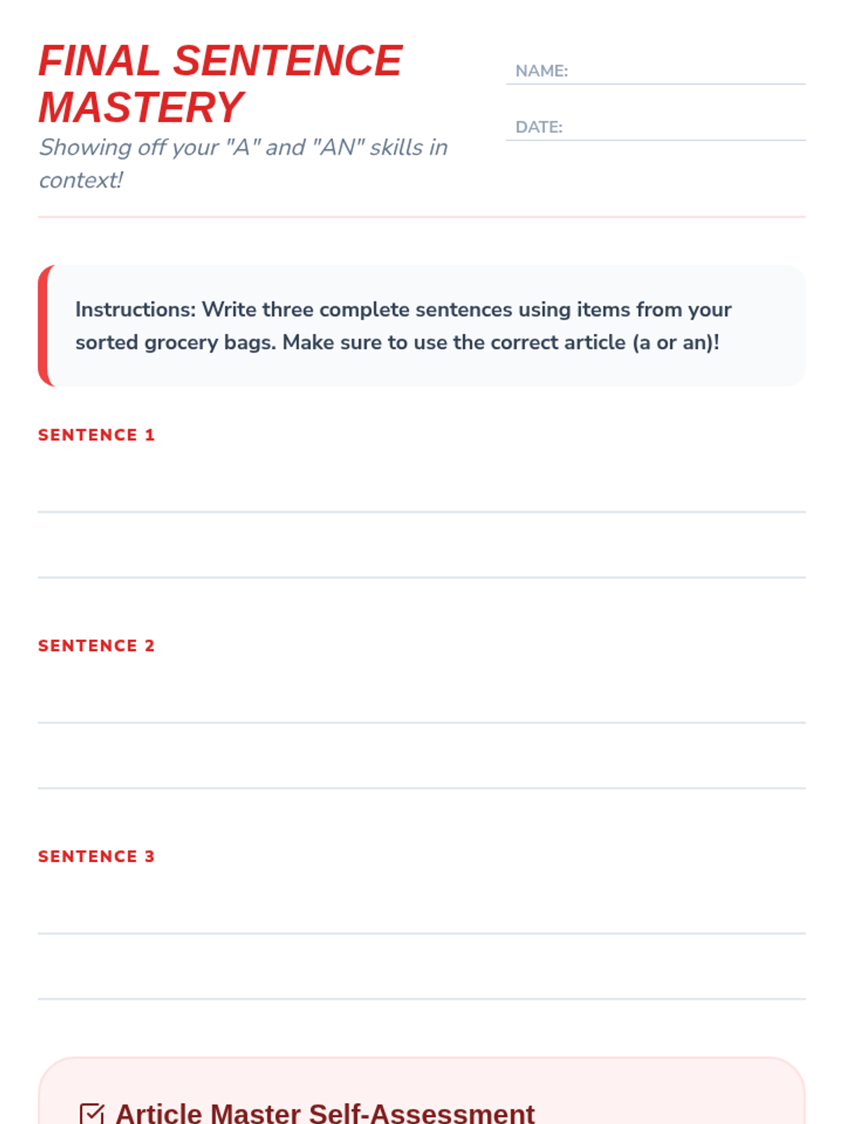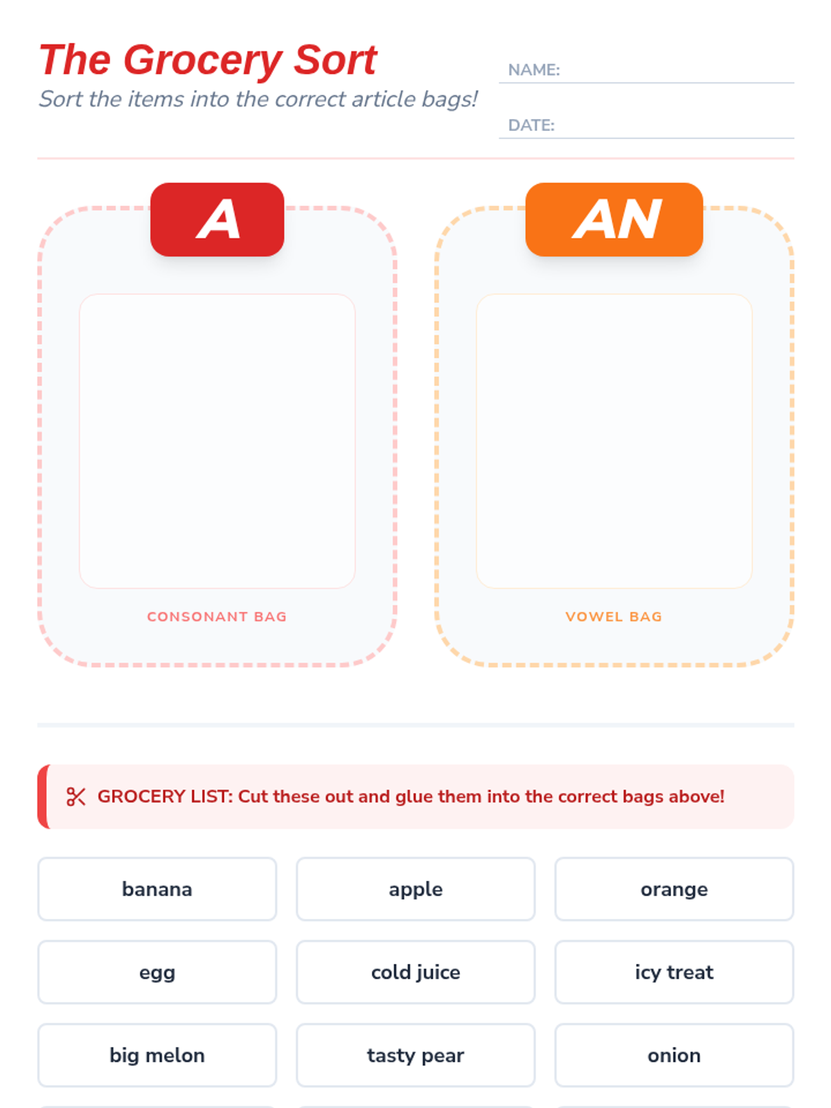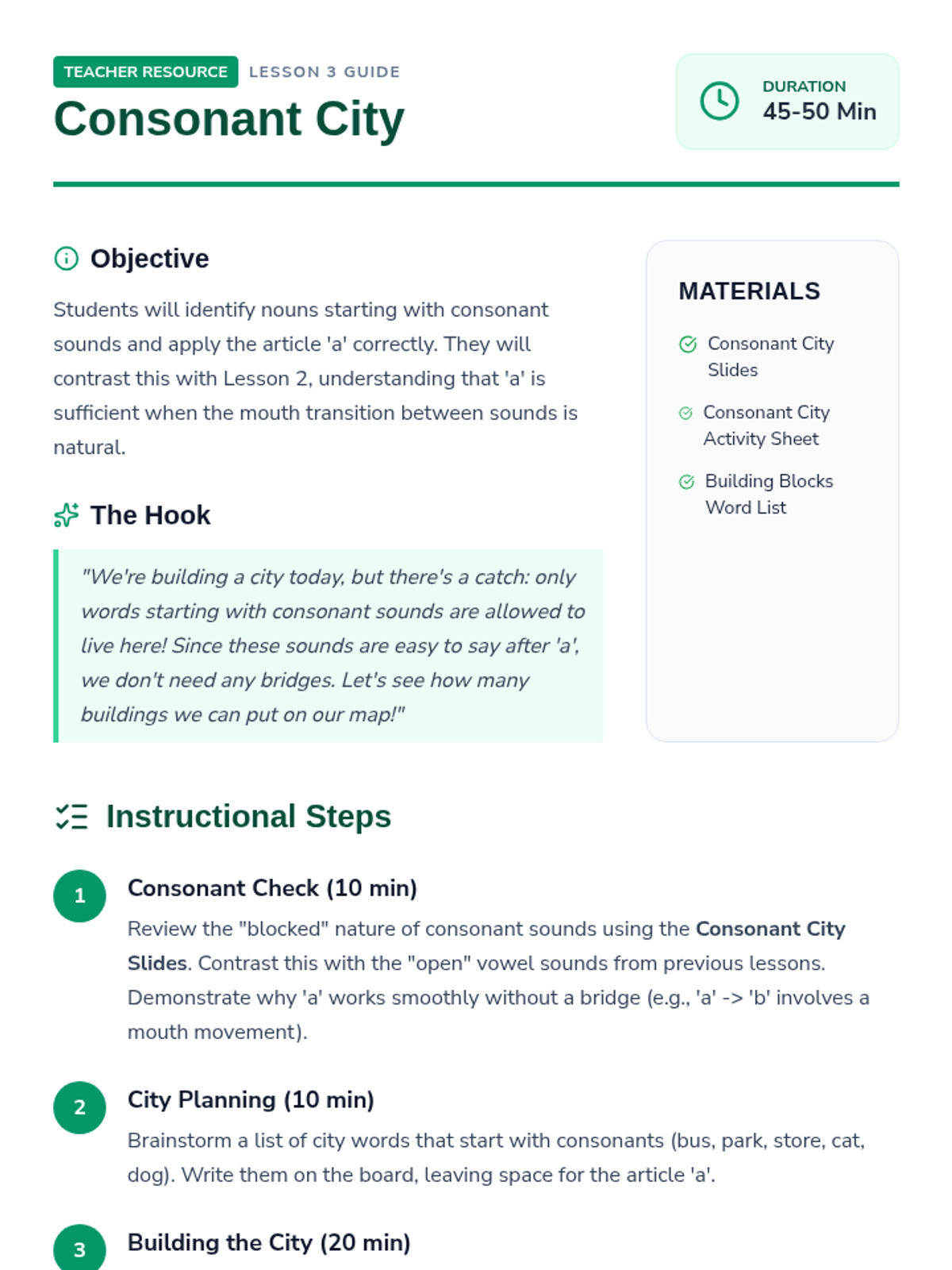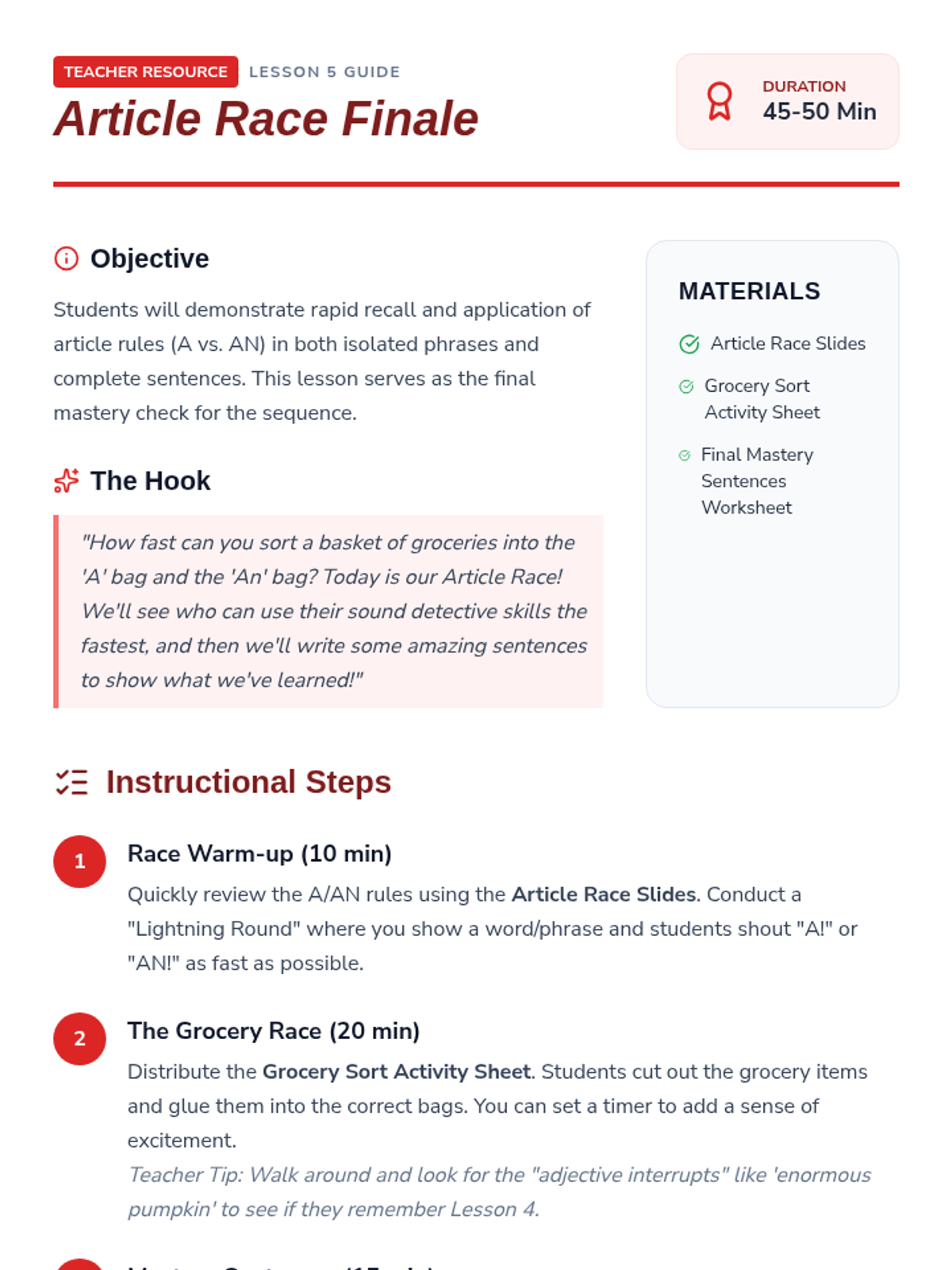 A comprehensive 2nd Grade sequence focusing on the phonetic rules of indefinite articles 'a' and 'an'. Students progress from phonemic awareness of initial sounds to applying article rules in complex sentences with adjectives.