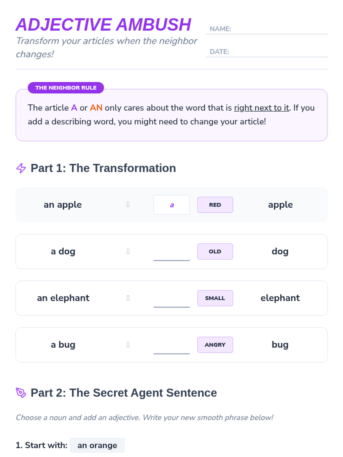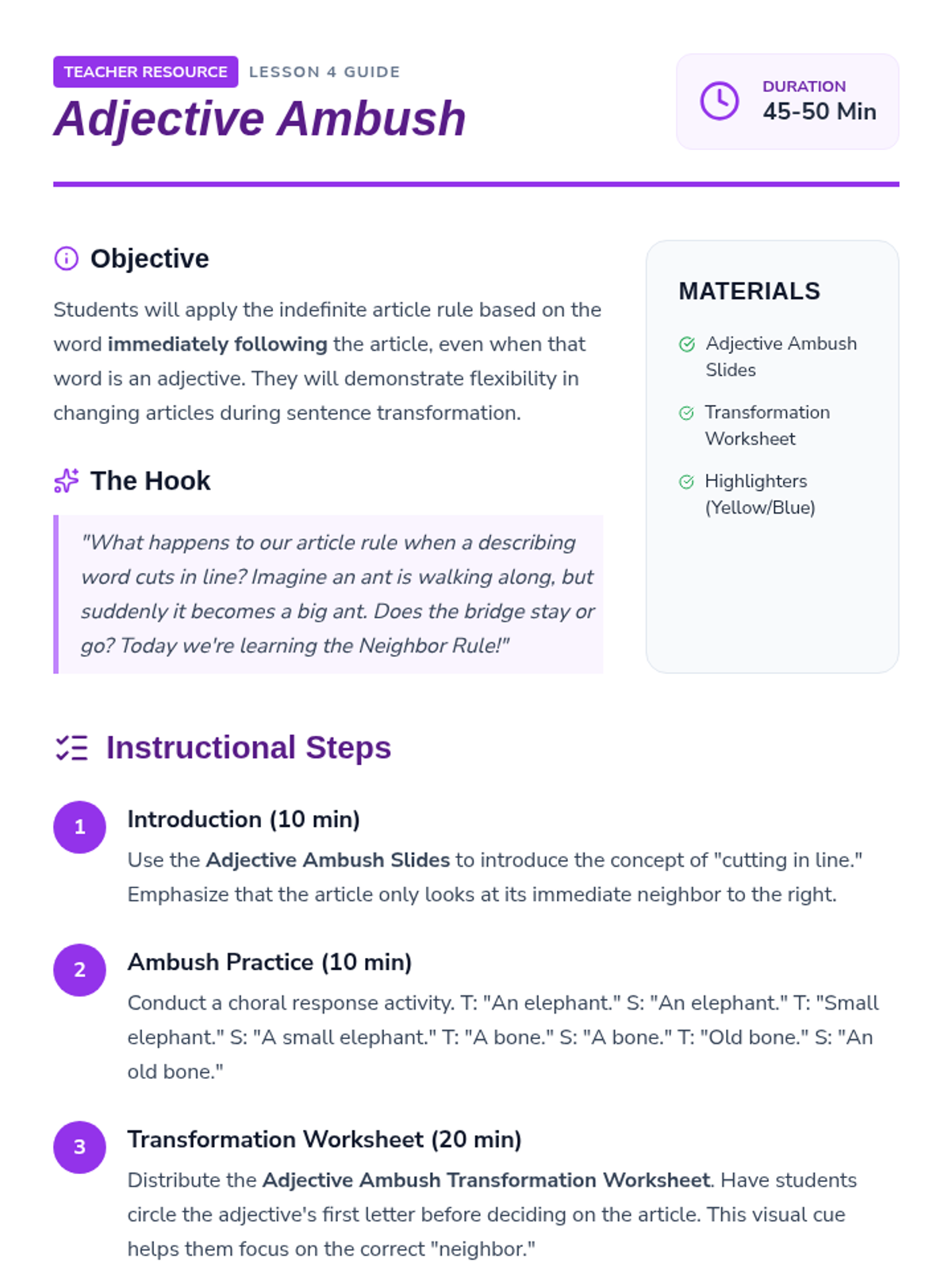 A 2nd-grade grammar sequence where students become 'Article Detectives' to master the difference between definite and indefinite articles. Through inquiry, simulations, and map-reading, students learn how 'a', 'an', and 'the' clarify whether we are discussing a general or specific object.