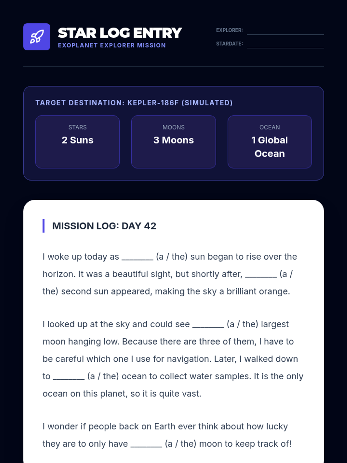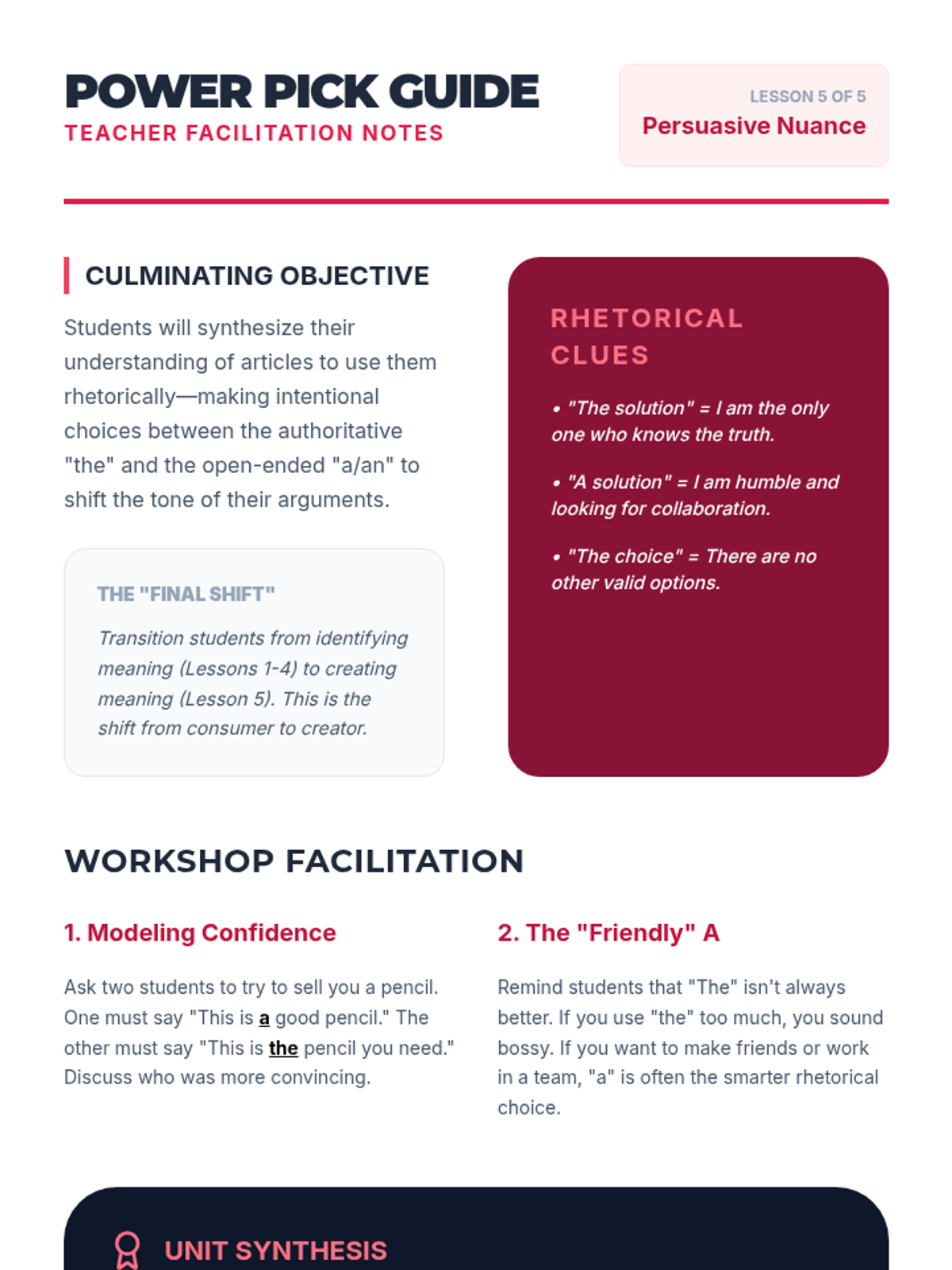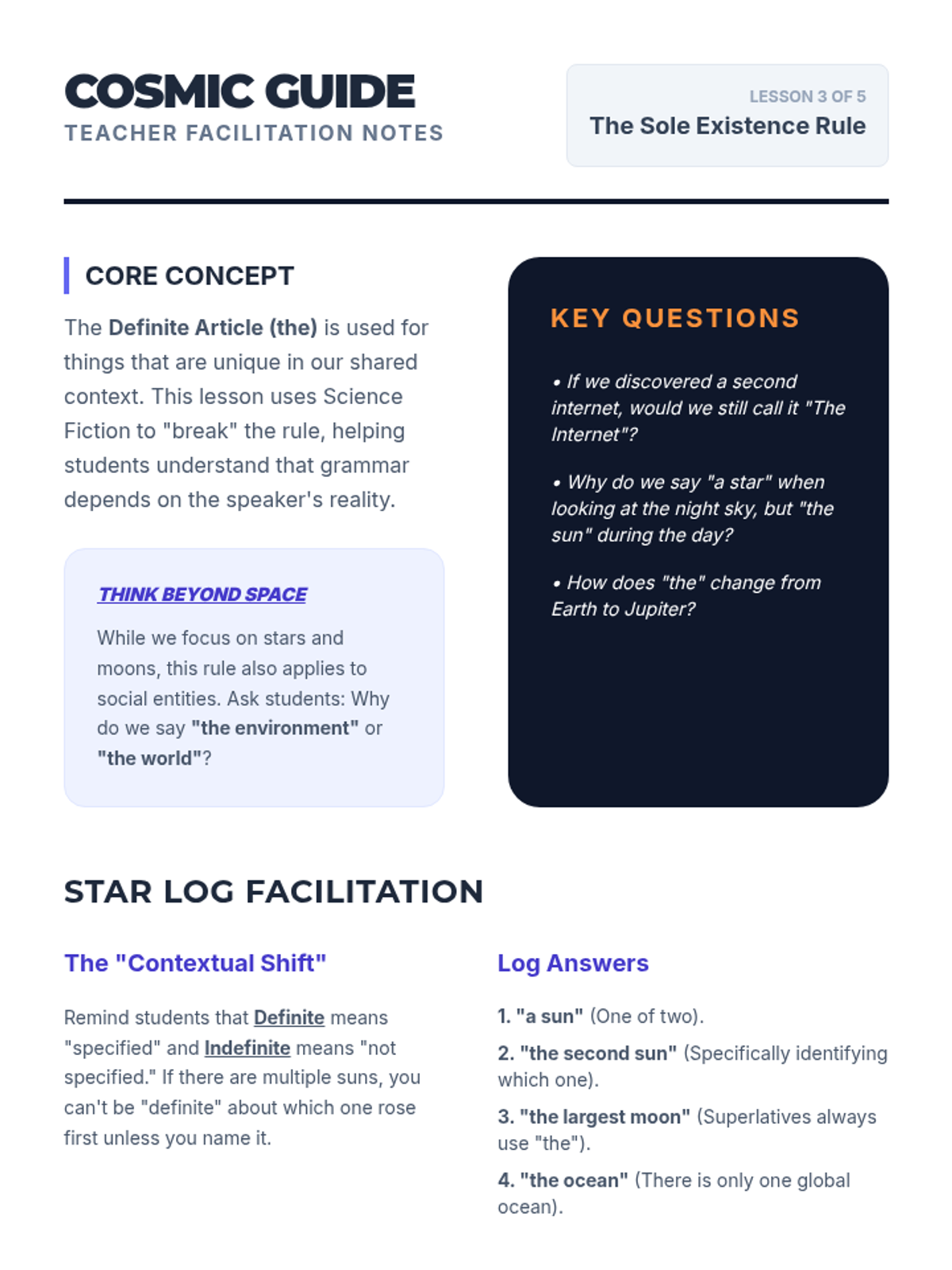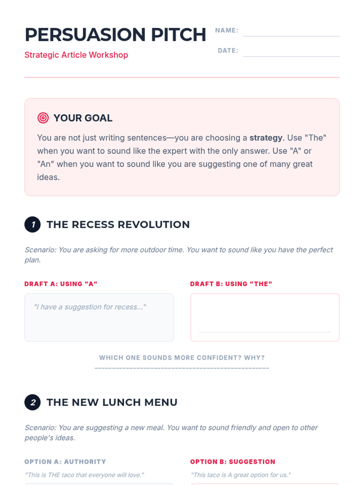 A 5th-grade ELA sequence exploring how the choice of articles (a, an, the) shifts meaning and tone in headlines, geography, science, and persuasion. Students move beyond simple grammar rules to analyze the semantic impact of these 'tiny' words.