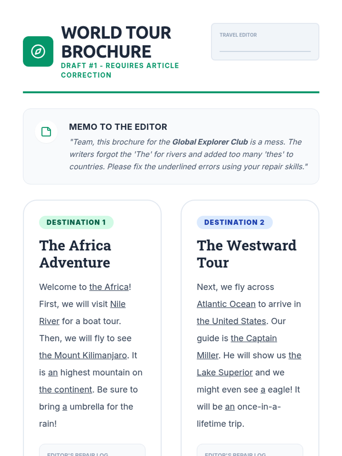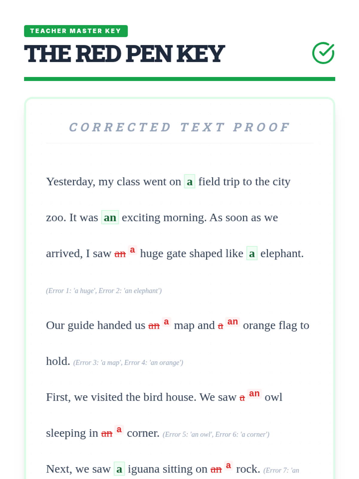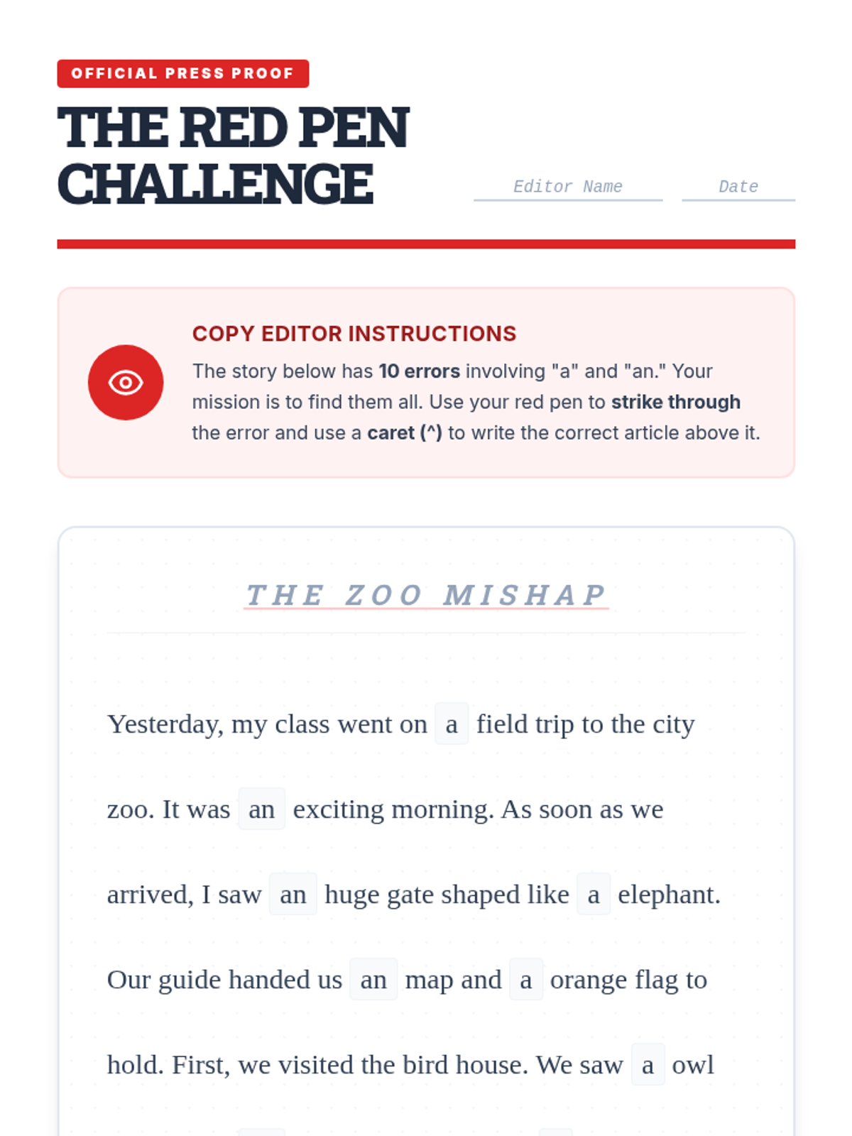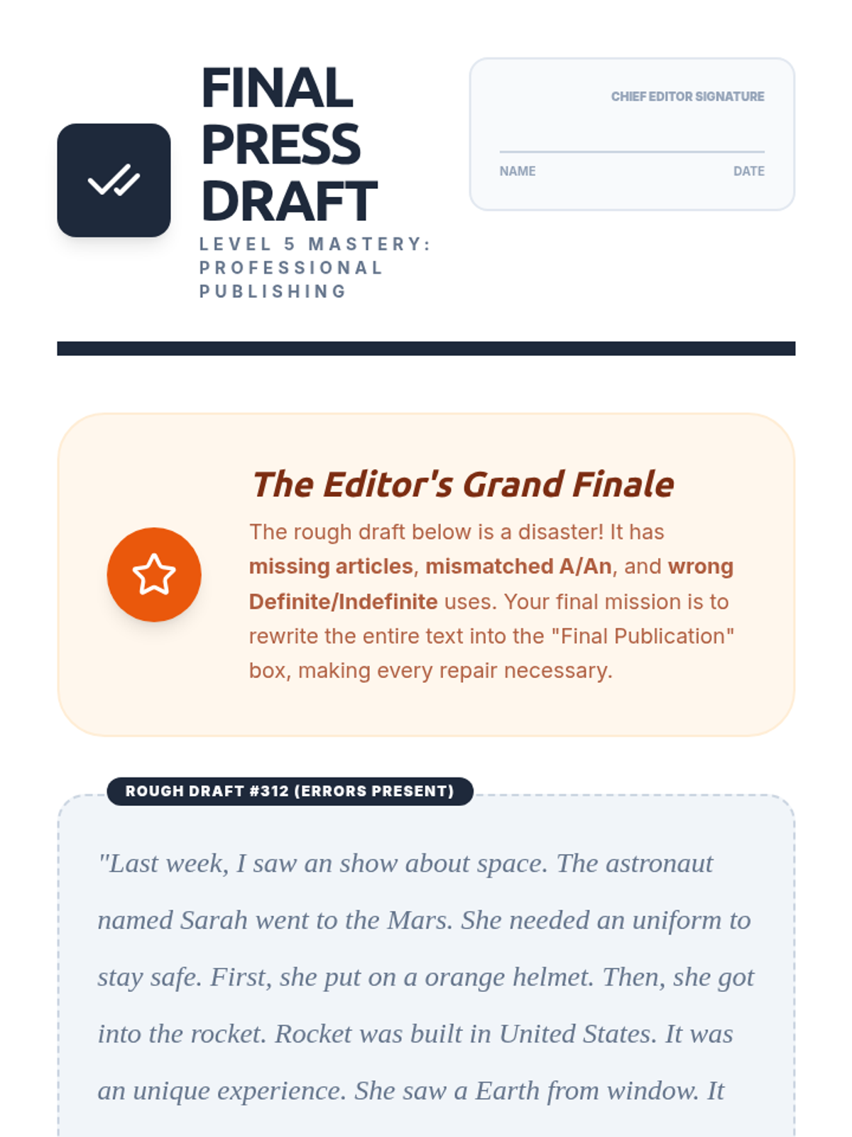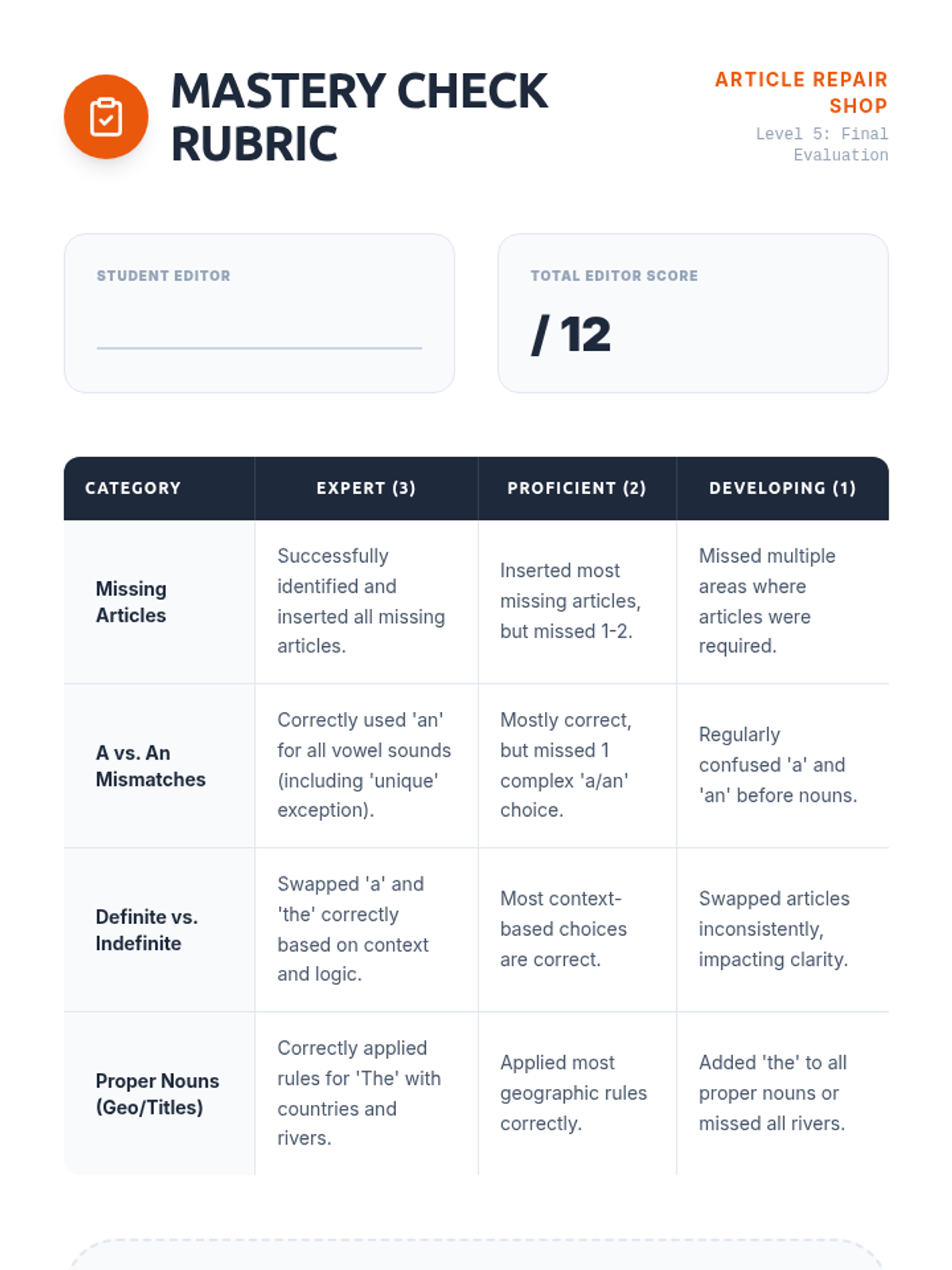A comprehensive 5-lesson sequence for 3rd graders focused on mastering articles (a, an, the) through the lens of editing and 'repairing' broken text. Students take on the role of editors to improve sentence clarity and flow.