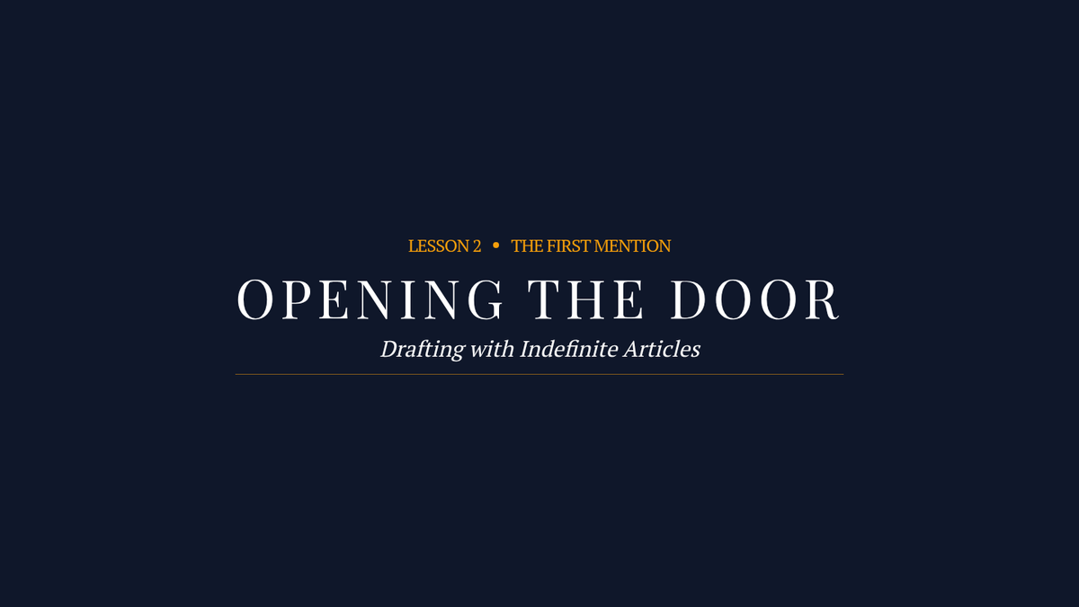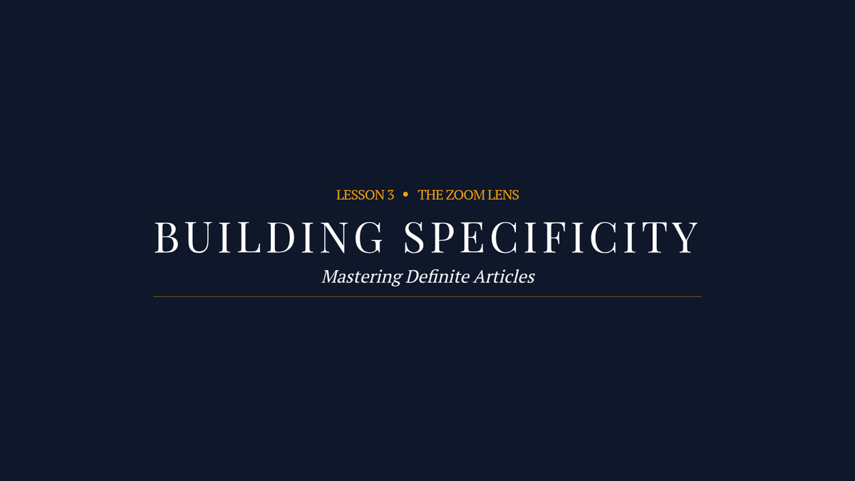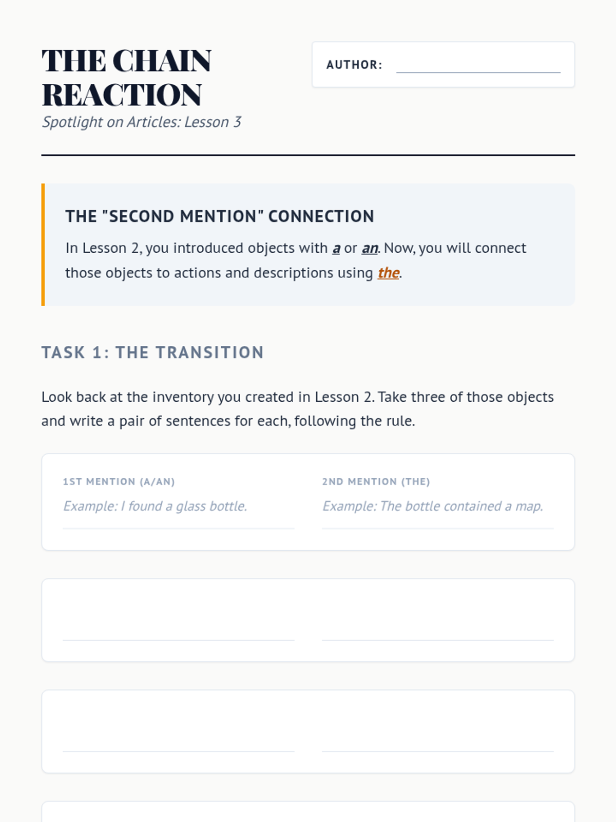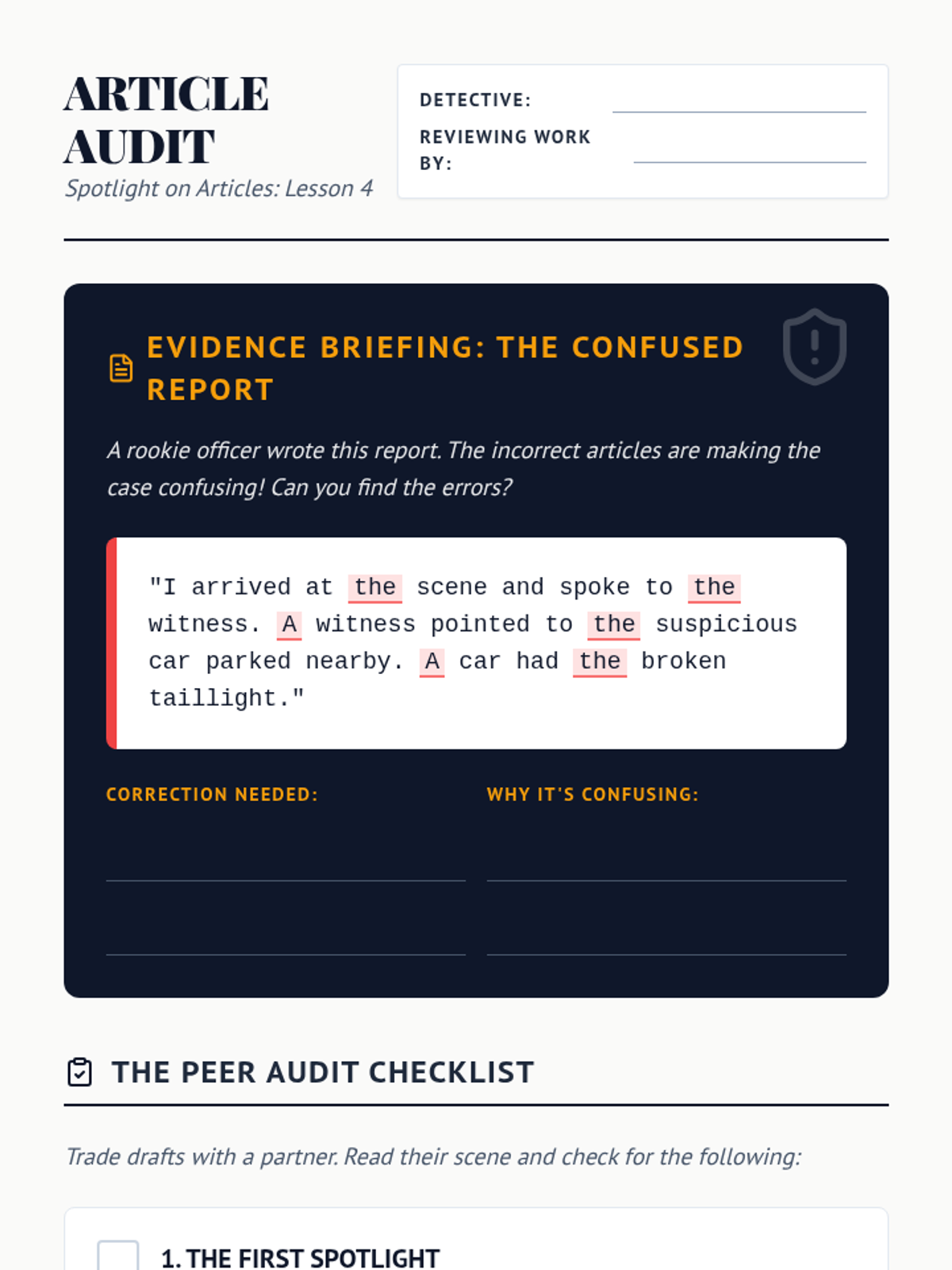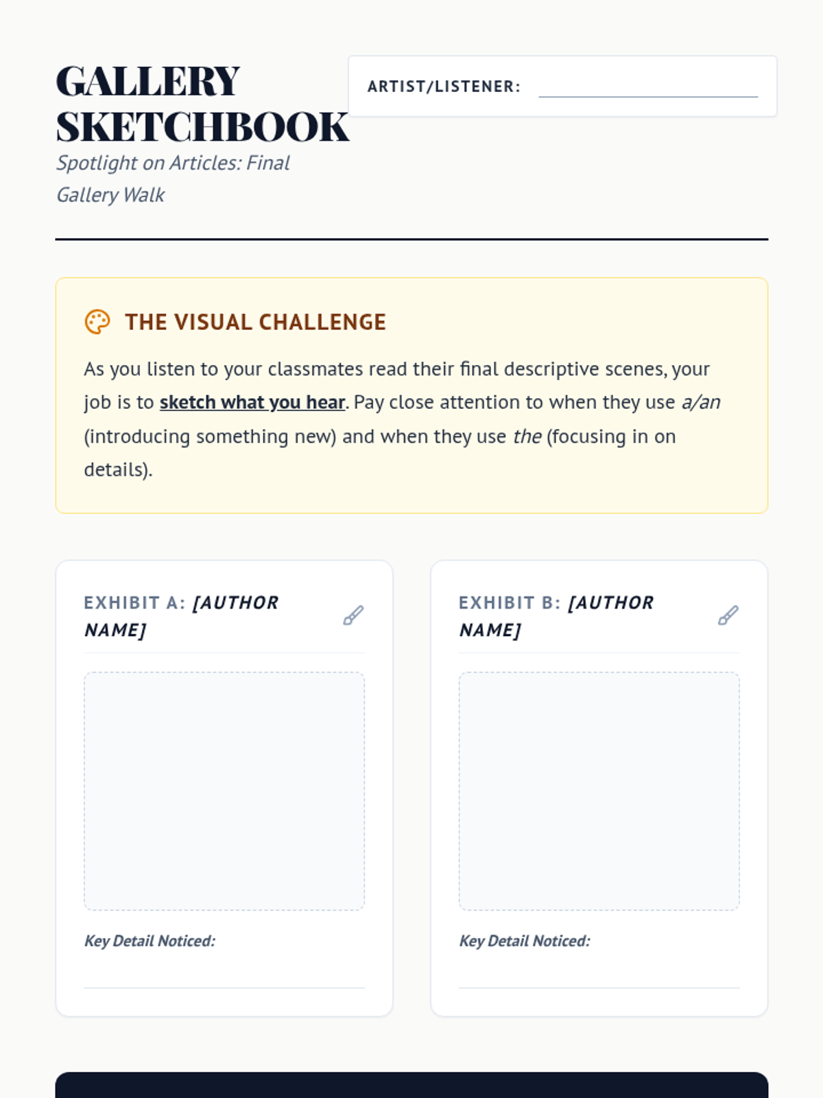 A workshop-style grammar sequence for 5th graders focusing on the stylistic power of articles (a, an, the). Students move from analyzing mentor texts to drafting and revising descriptive scenes, learning how articles control reader focus and specificity.