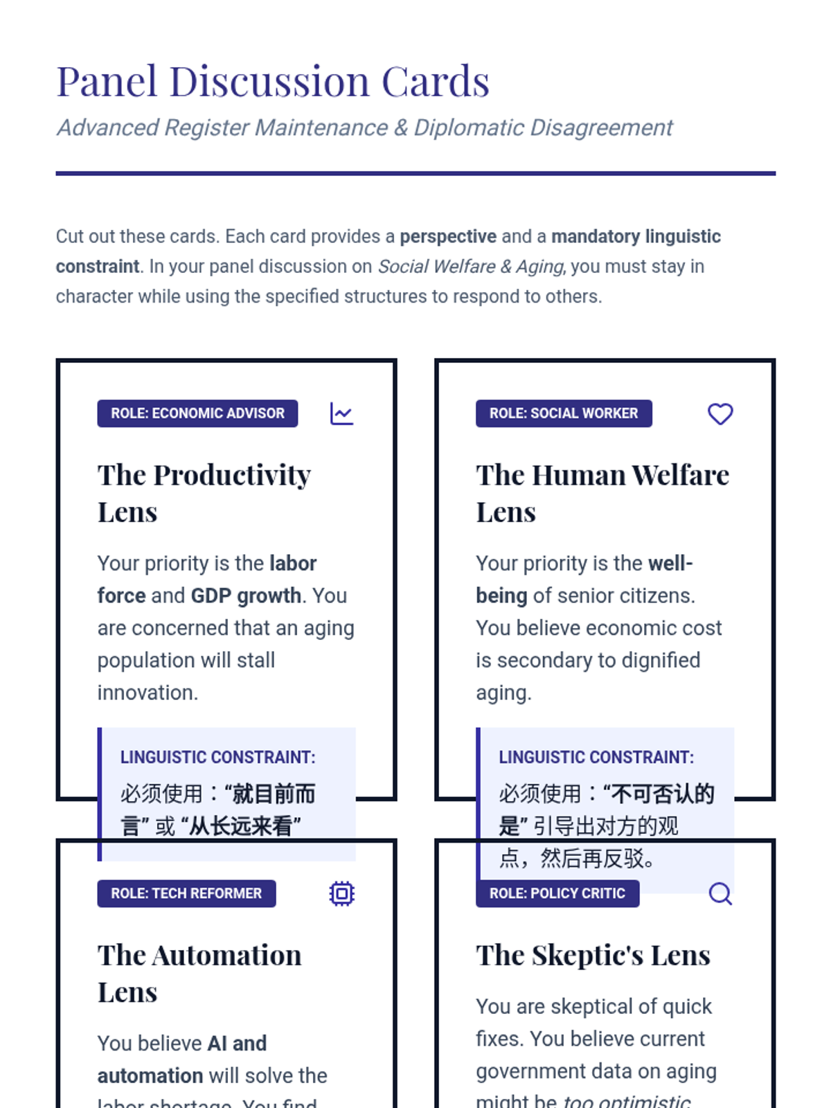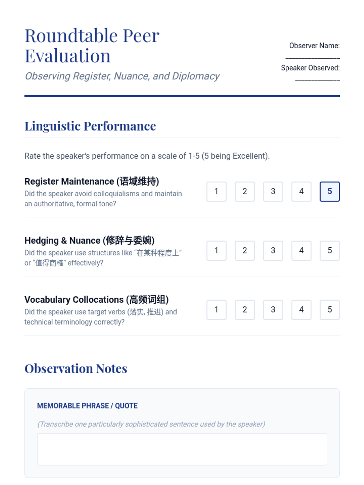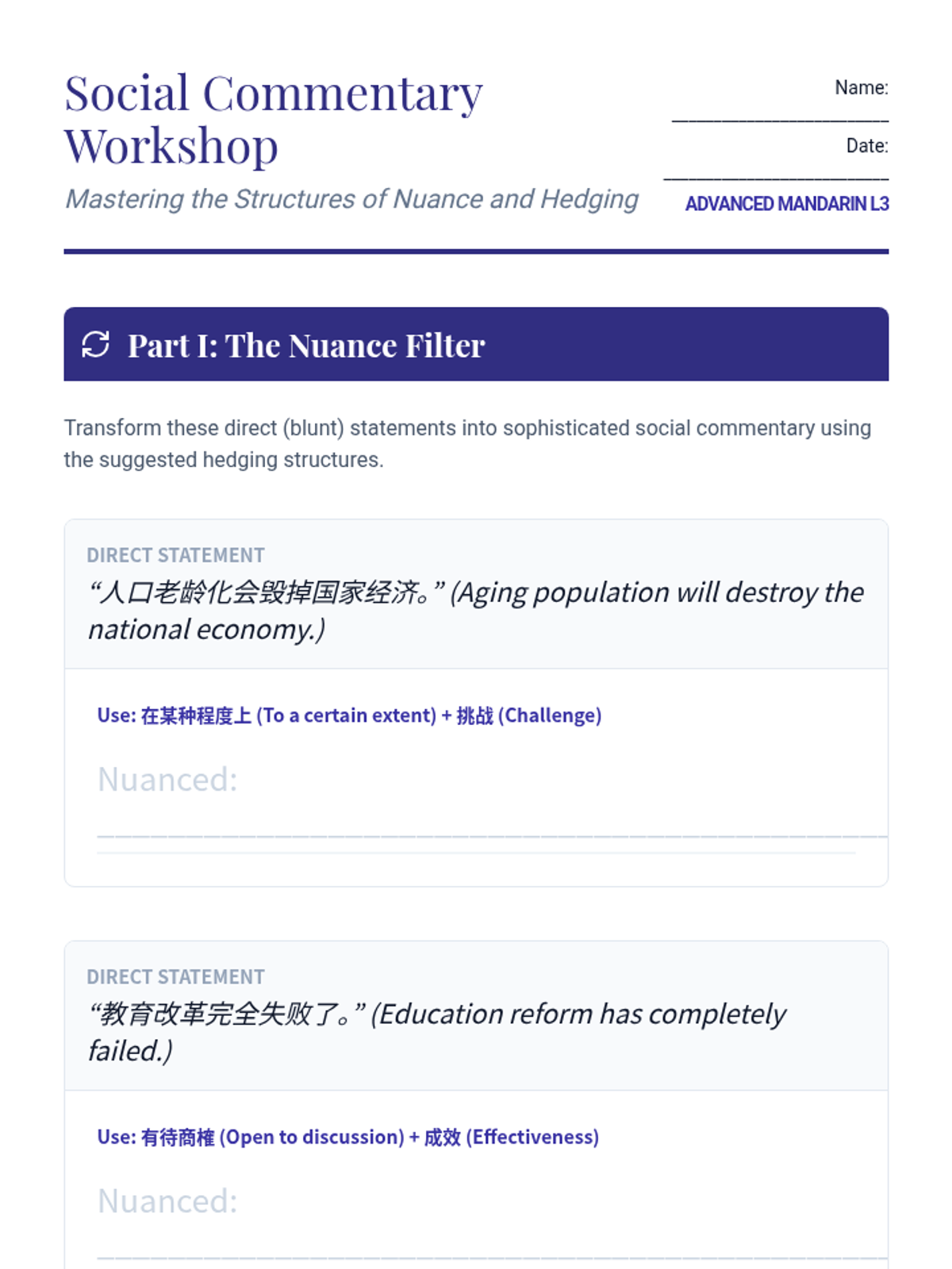 An advanced Mandarin Chinese course for graduate students, focusing on the linguistic nuances of socio-political discourse, official rhetoric, and policy articulation. Students progress from critical analysis of state media to professional simulation of policy roundtables.
