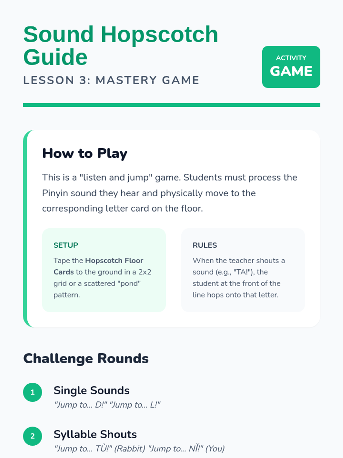 A high-energy Mandarin Chinese sequence for Pre-K students using the Total Physical Response (TPR) method. Students learn to respond to physical commands and action verbs through games and movement, building direct meaning without translation.