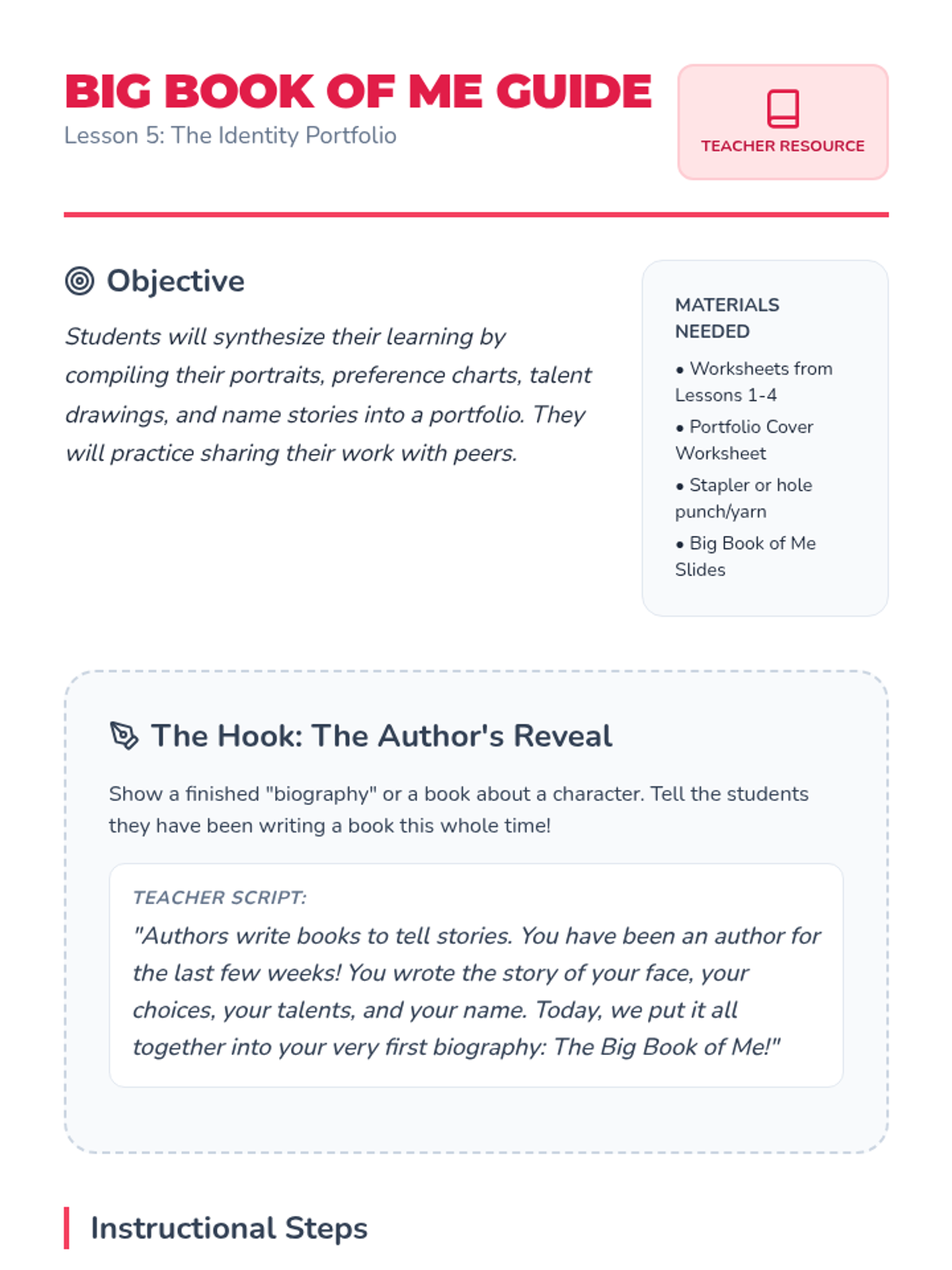 A comprehensive Kindergarten project guiding students to explore their physical traits, preferences, talents, and names to build a strong sense of self and appreciation for diversity.