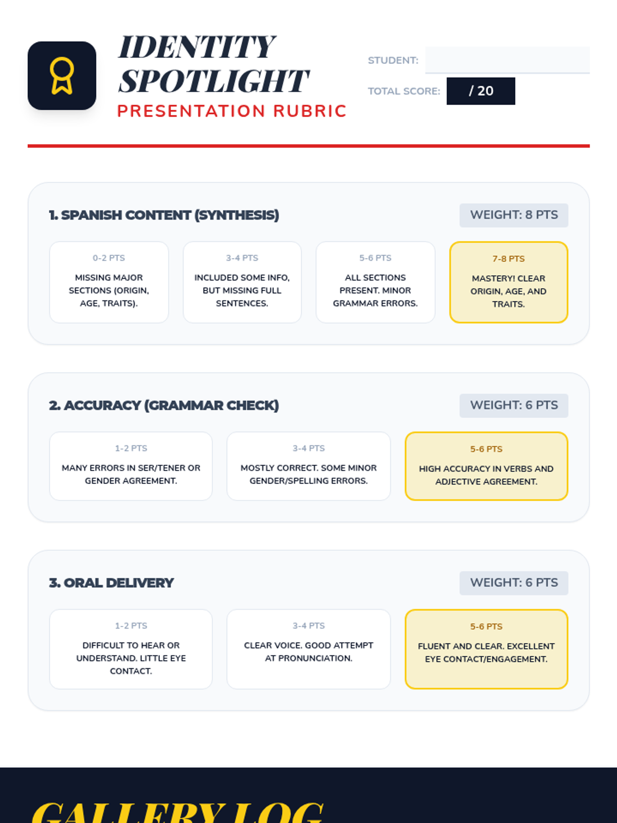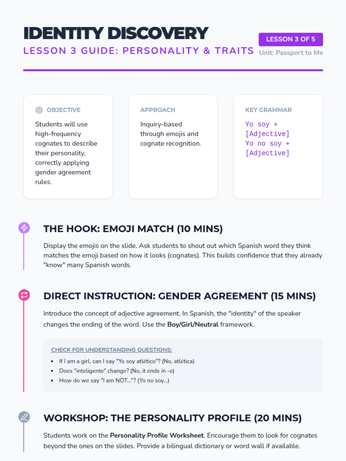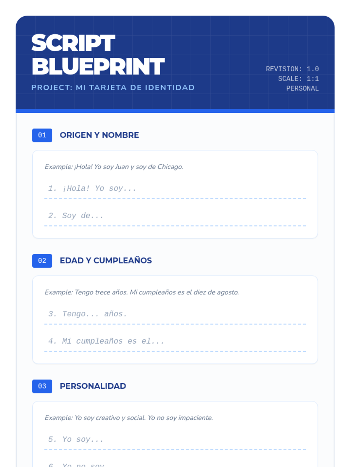 A project-based unit where 6th-grade students learn to articulate their identity, origin, age, and personality in Spanish using 'Ser', 'Tener', and 'Estar'. The sequence culminates in a multimedia 'All About Me' presentation.