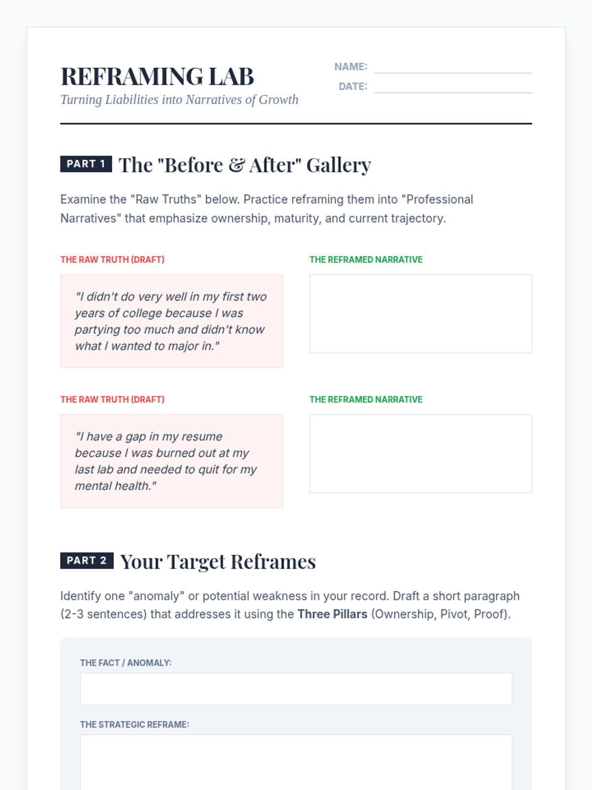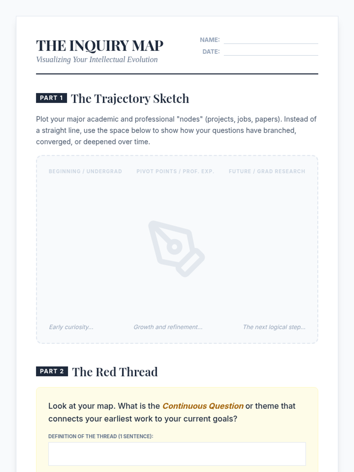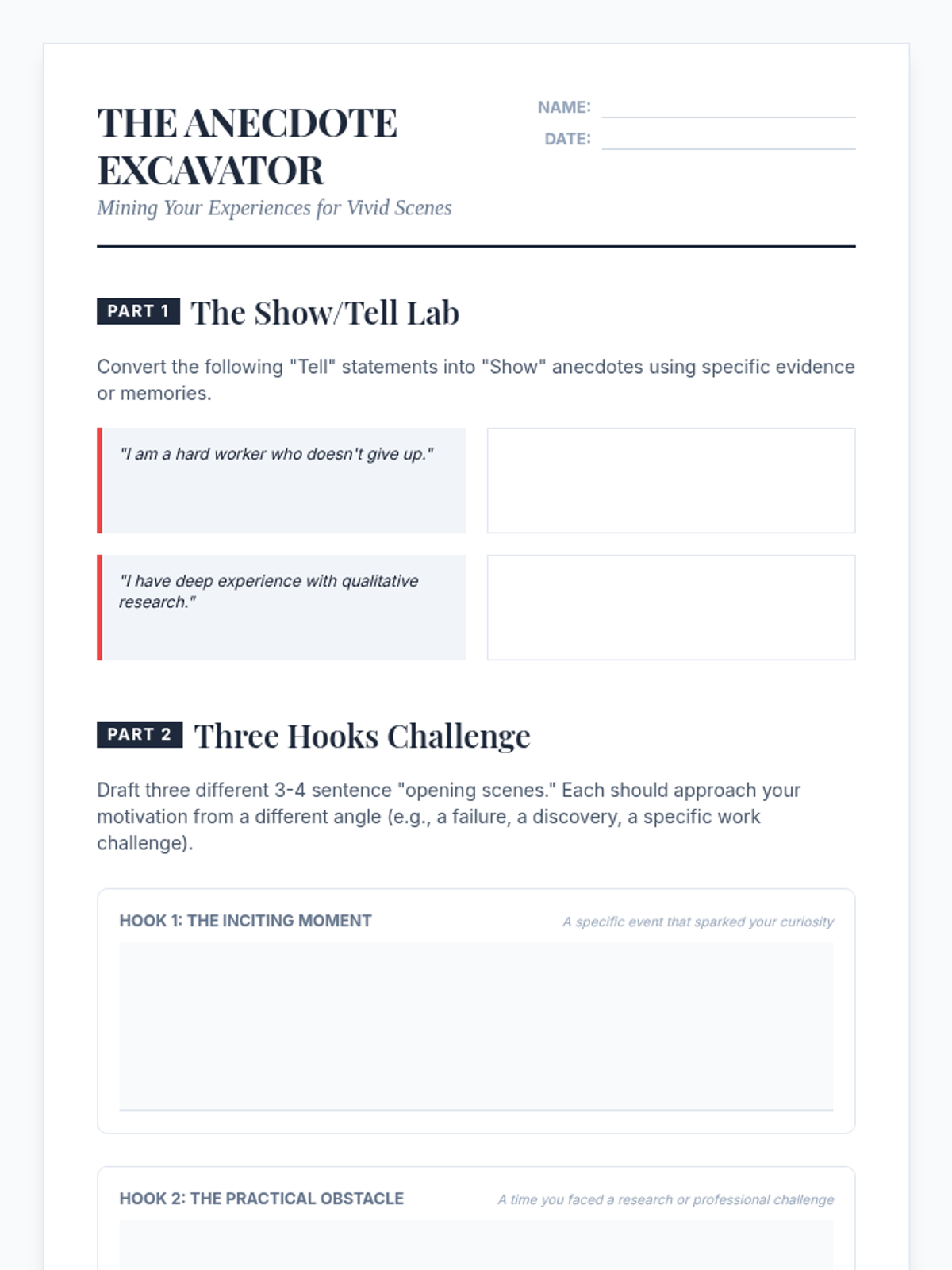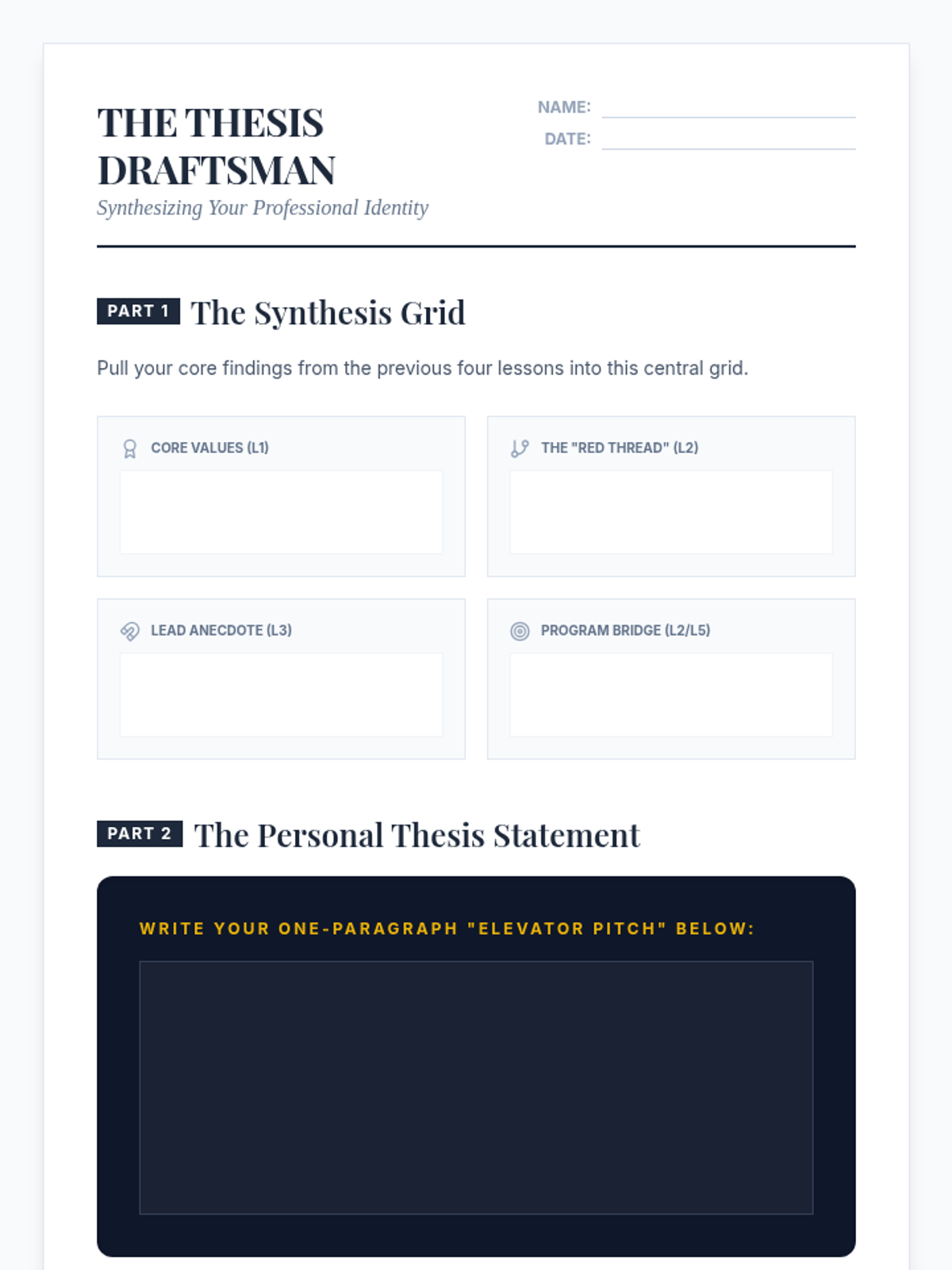 A 5-lesson sequence for graduate students to identify and articulate their professional and academic identity for personal statement writing. The sequence covers value identification, intellectual mapping, narrative construction, reframing challenges, and synthesizing a personal thesis.