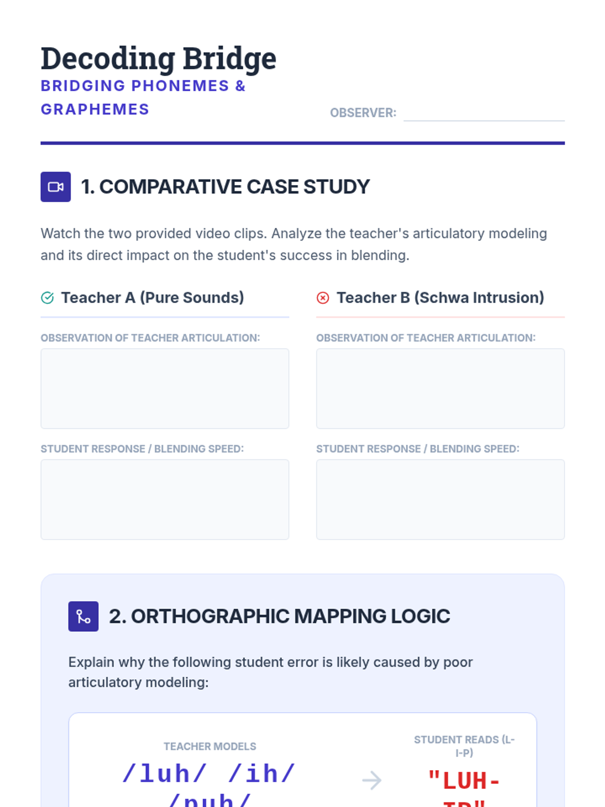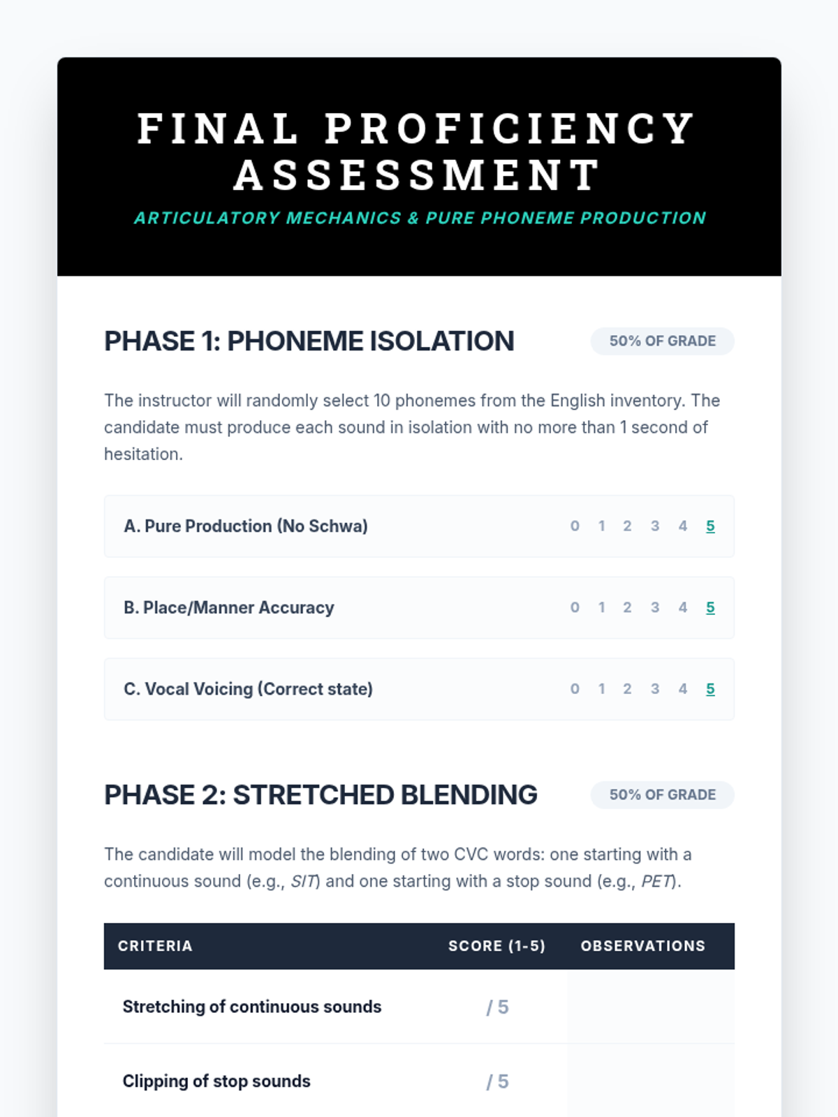 A foundational sequence for pre-service teachers exploring the physiological and articulatory mechanics of speech sounds. Students master pure phoneme production to ensure effective blending and segmenting instruction.