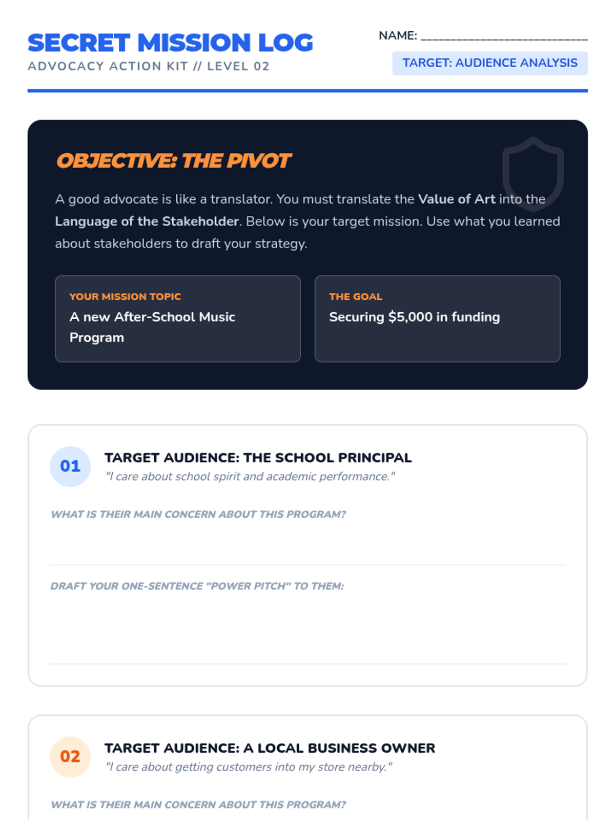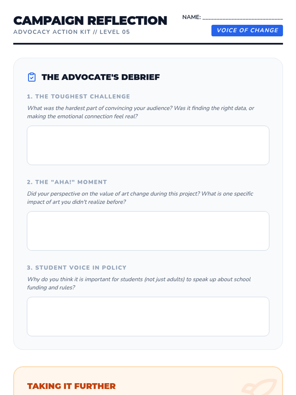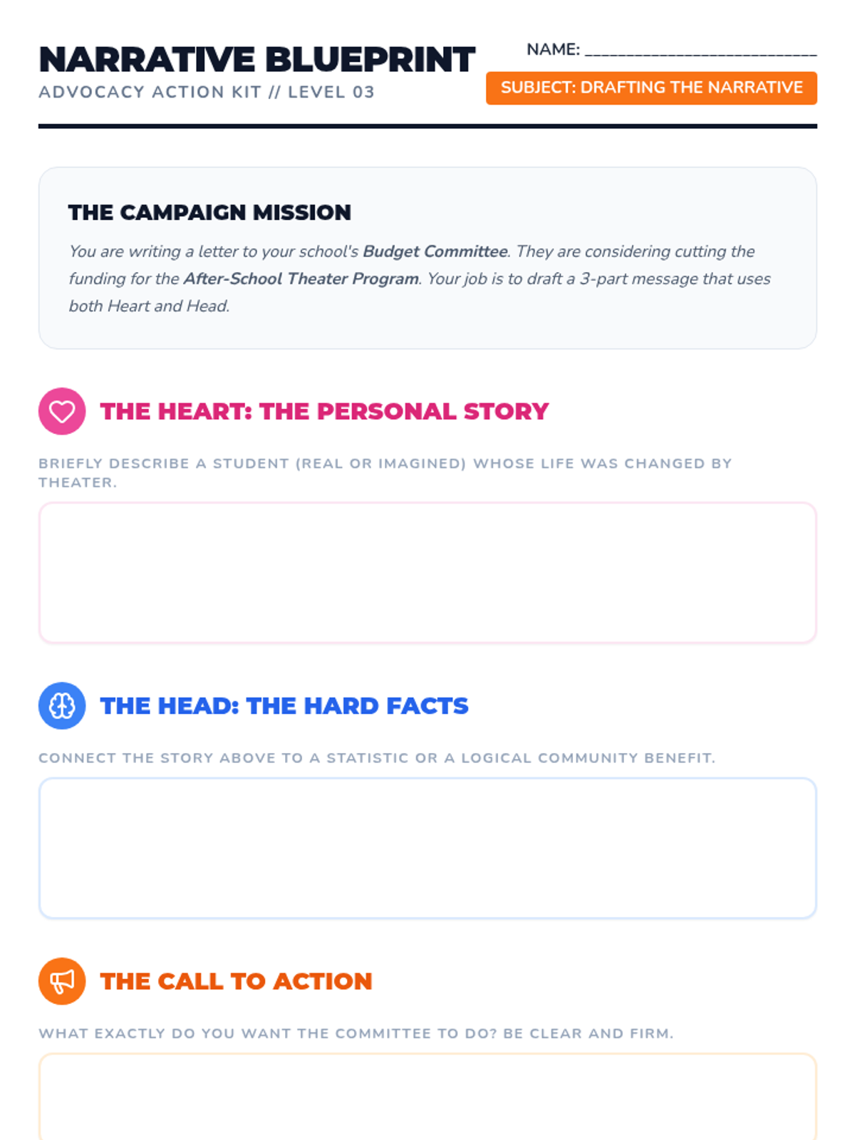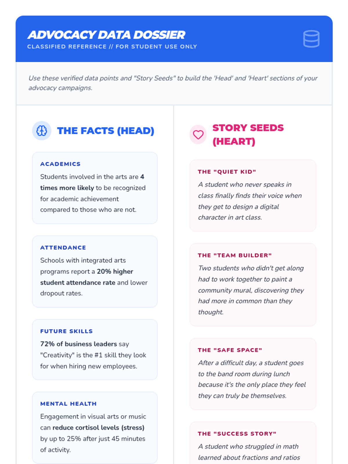 A project-based sequence where 6th-grade students design persuasive campaigns for arts education. Students explore the value of the arts, analyze stakeholder perspectives, and craft compelling narratives and visuals to advocate for community arts programs.
