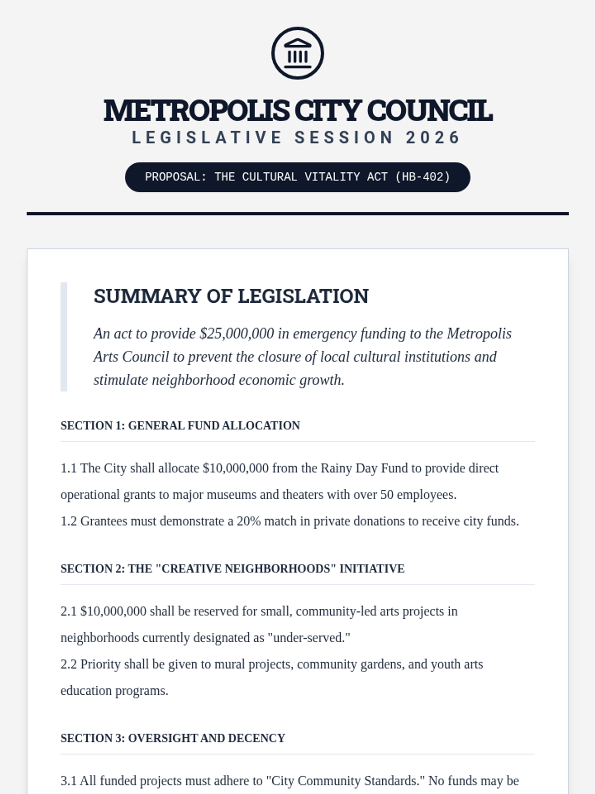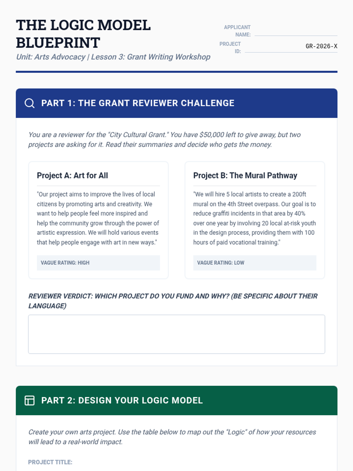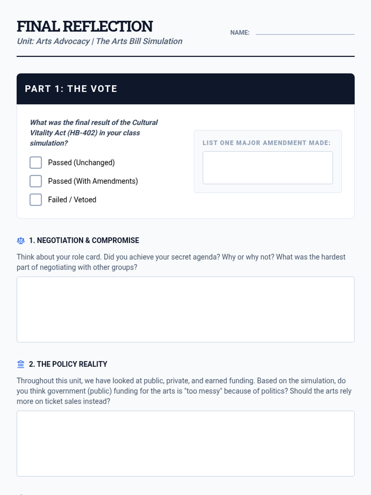 This 9th-grade sequence moves beyond art appreciation to explore the economic and policy frameworks of the arts sector. Students analyze funding models, historical controversies, grant writing, and urban policy, culminating in a mock legislative session on arts advocacy.