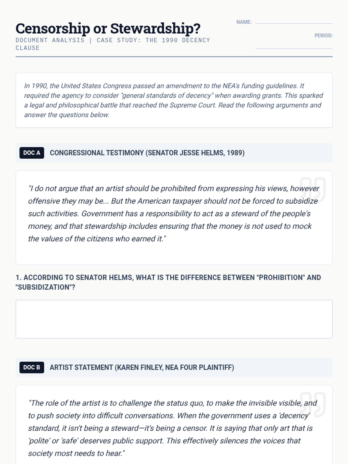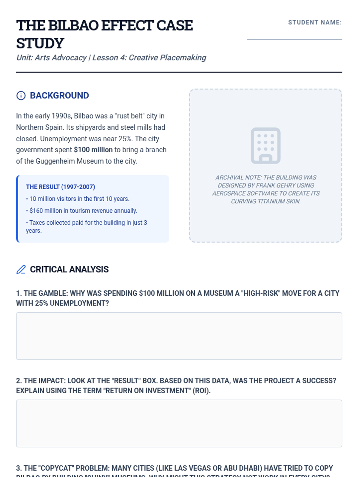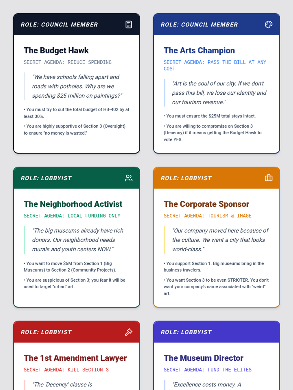 This 9th-grade sequence moves beyond art appreciation to explore the economic and policy frameworks of the arts sector. Students analyze funding models, historical controversies, grant writing, and urban policy, culminating in a mock legislative session on arts advocacy.