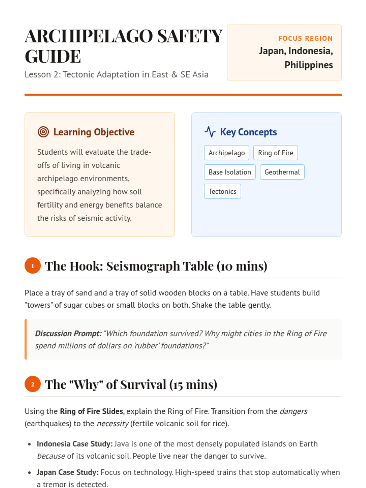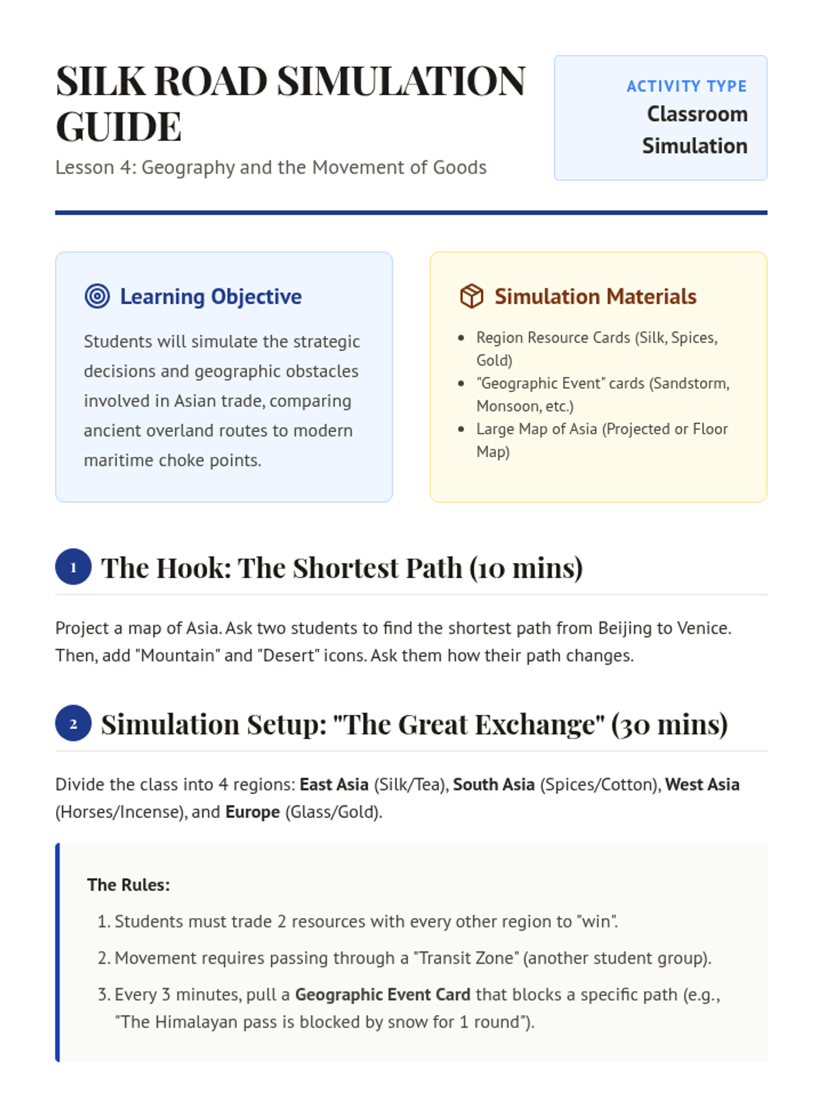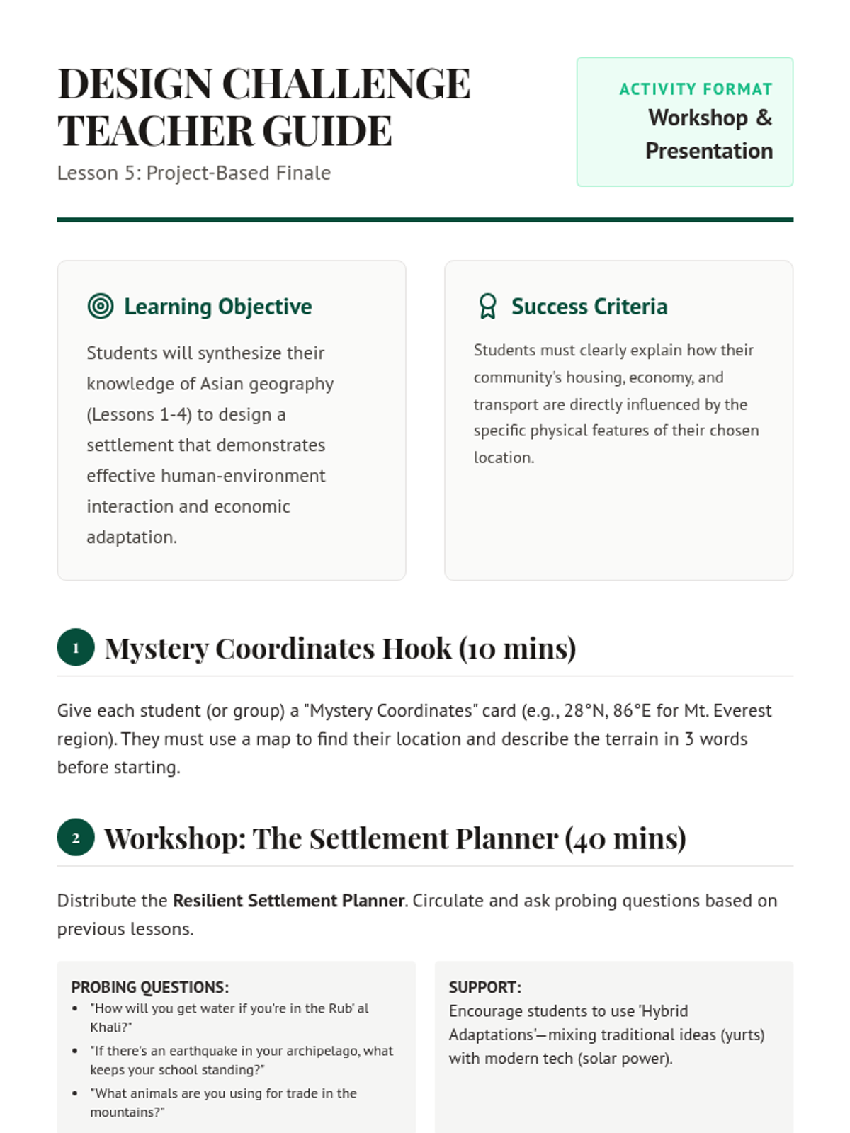 A 5-lesson sequence for 6th Grade Social Studies exploring human-environment interaction across Asia. Students analyze how communities adapt their lifestyles and economies to diverse geographic features like steppes, archipelagos, and deserts.